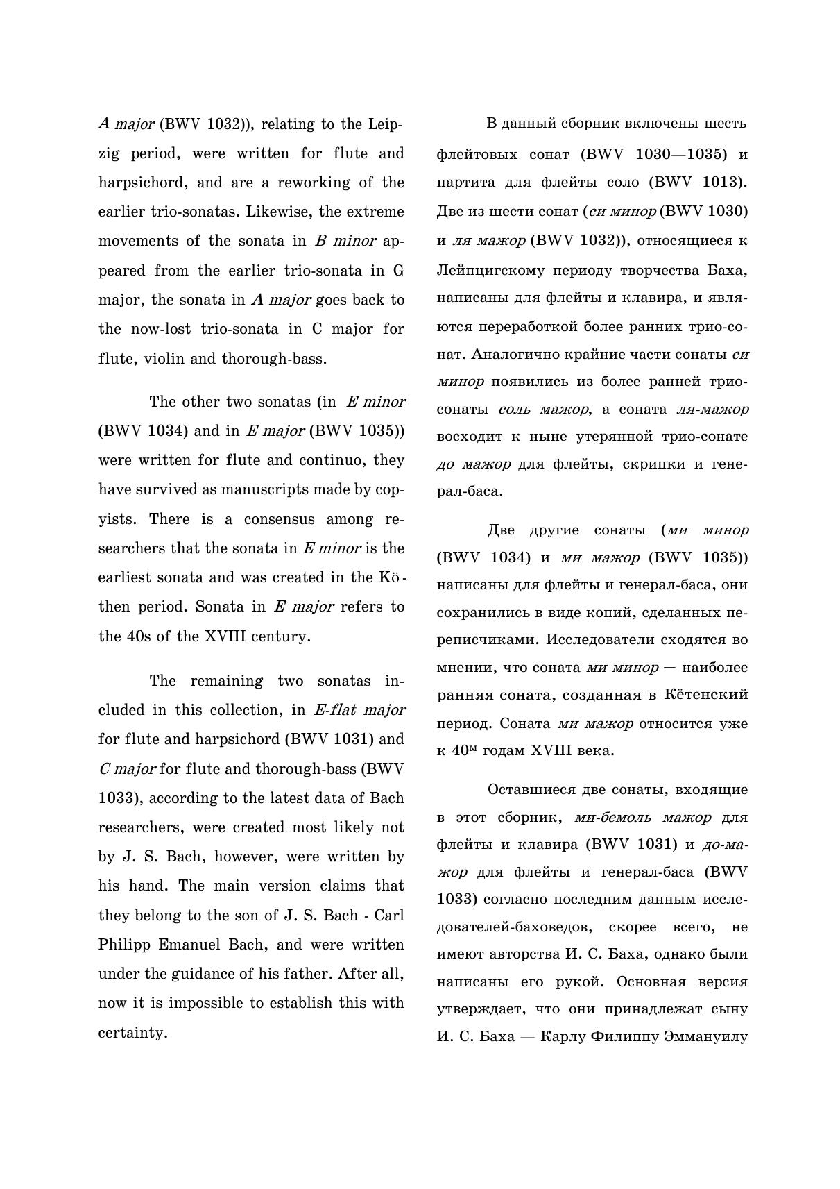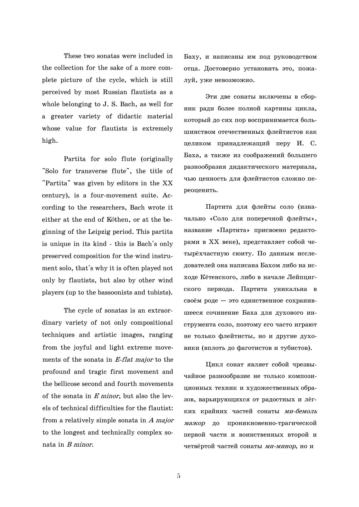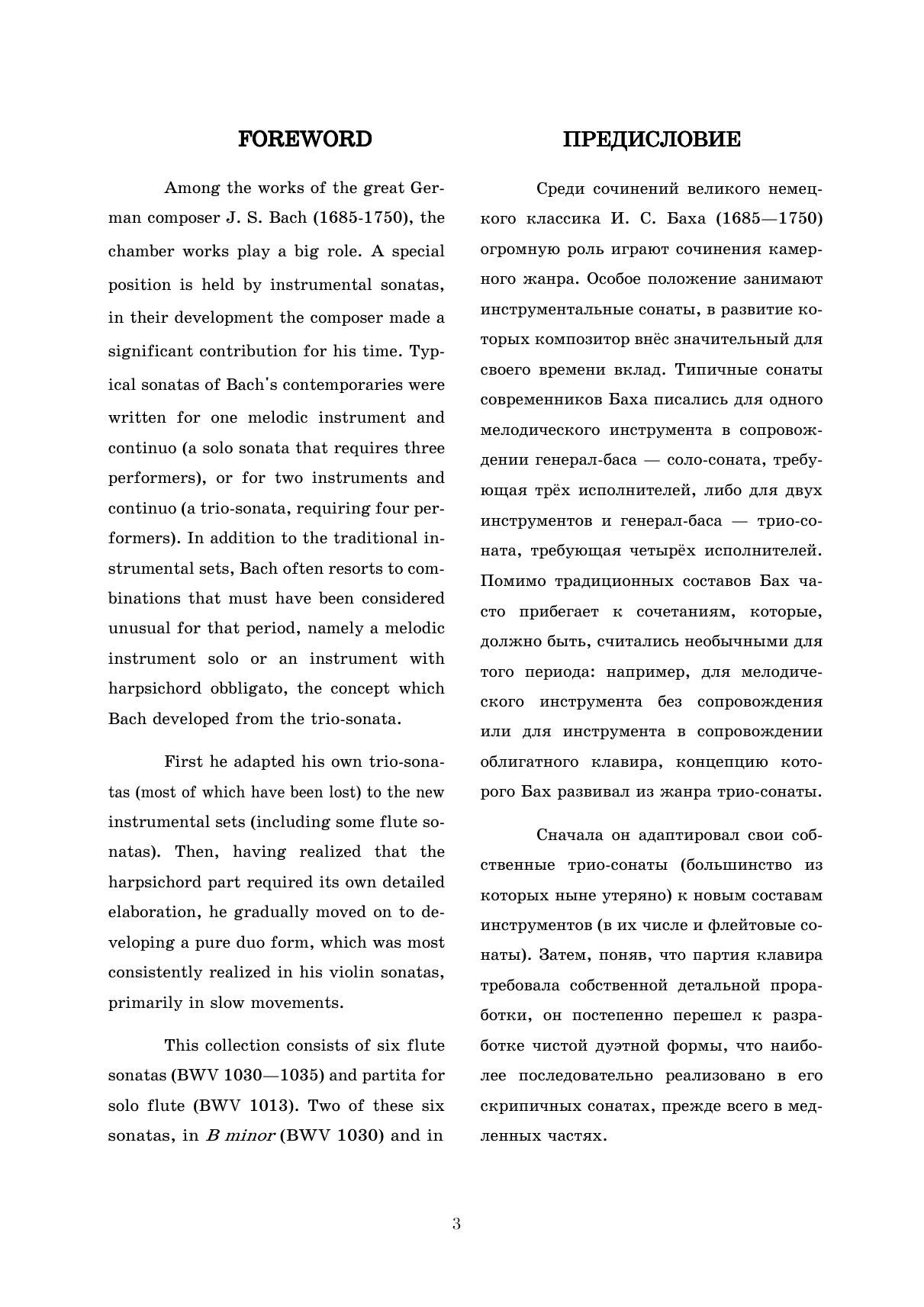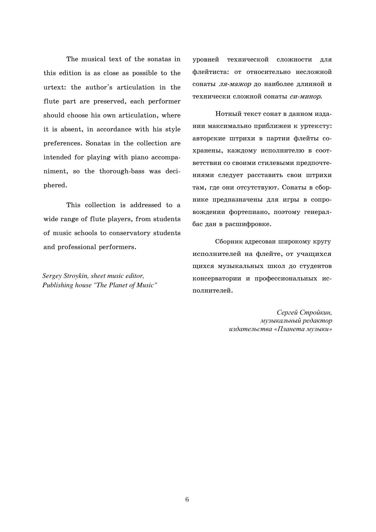 Среди сочинений великого немецкого классика И. С. Баха (1685—1750) огромную роль играют сочинения камерного жанра. Особое положение занимают инструментальные сонаты, в развитие которых композитор внёс значительный для своего времени вклад. Предлагаемое издание включает в себя две тетради. Первая тетрадь содержит шесть сонат для флейты и фортепиано BWV 1030—1035. Прилагаемая вторая тетрадь содержит флейтовую партию названных шести сонат и партиту для флейты соло BWV 1013. Цикл сонат являет собой чрезвычайное разнообразие не только композиционных техник и художественных образов, но и уровней технической сложности для флейтиста. Нотный текст сонат в данном издании максимально приближен к уртексту, авторские штрихи в партии флейты сохранены. Сборник адресован широкому кругу исполнителей на флейте, начиная с учащихся музыкальных школ до студентов консерватории и профессиональных исполнителей. Among the works by the great German classic J.S. Bach (1685–1750), the chamber works are of much importance. A special place belongs to instrumental sonatas, for whose development the composer made a significant contribution for his time. The current edition includes two books. The first book consists of six sonatas for flute and piano (BWV 1030–1035). This one, second book contains the flute part of the above mentioned six sonatas and partita for solo flute (BWV 1013). The cycle of sonatas is very diverse not only in its compositional techniques and artistic images, but also in levels of technical complexity for the flautist. The sonatas’ score in this edition is as close as possible to the urtext, the author’s articulation in the flute are preserved. The collection is addressed to a wide range of performers on the flute, from students of children's music schools to conservatory students and professional performers.