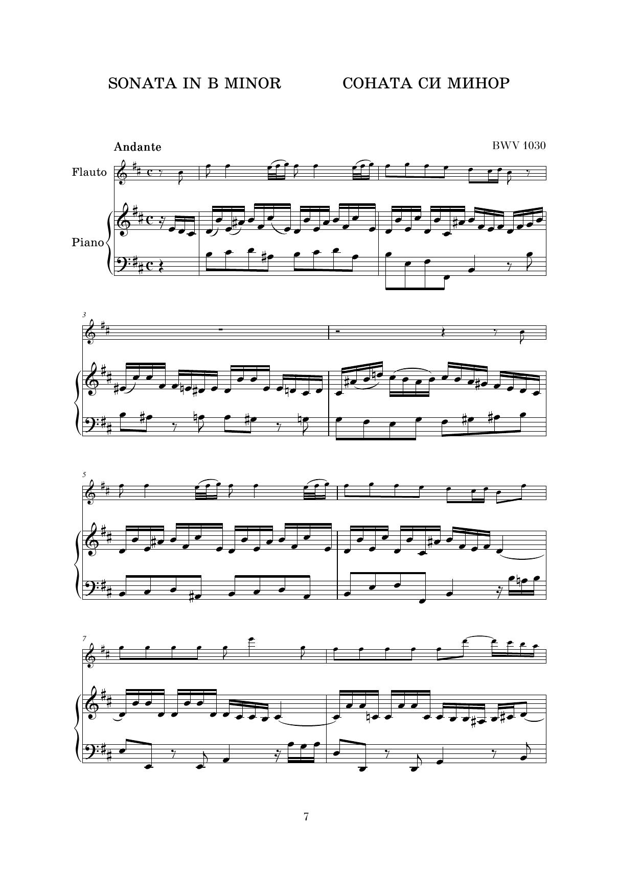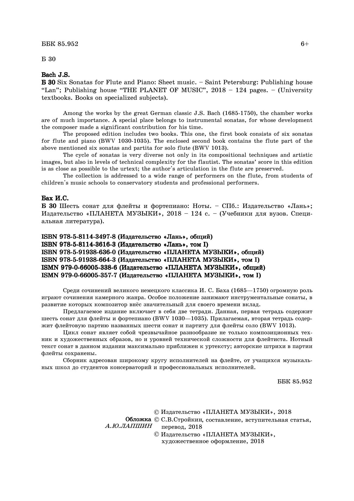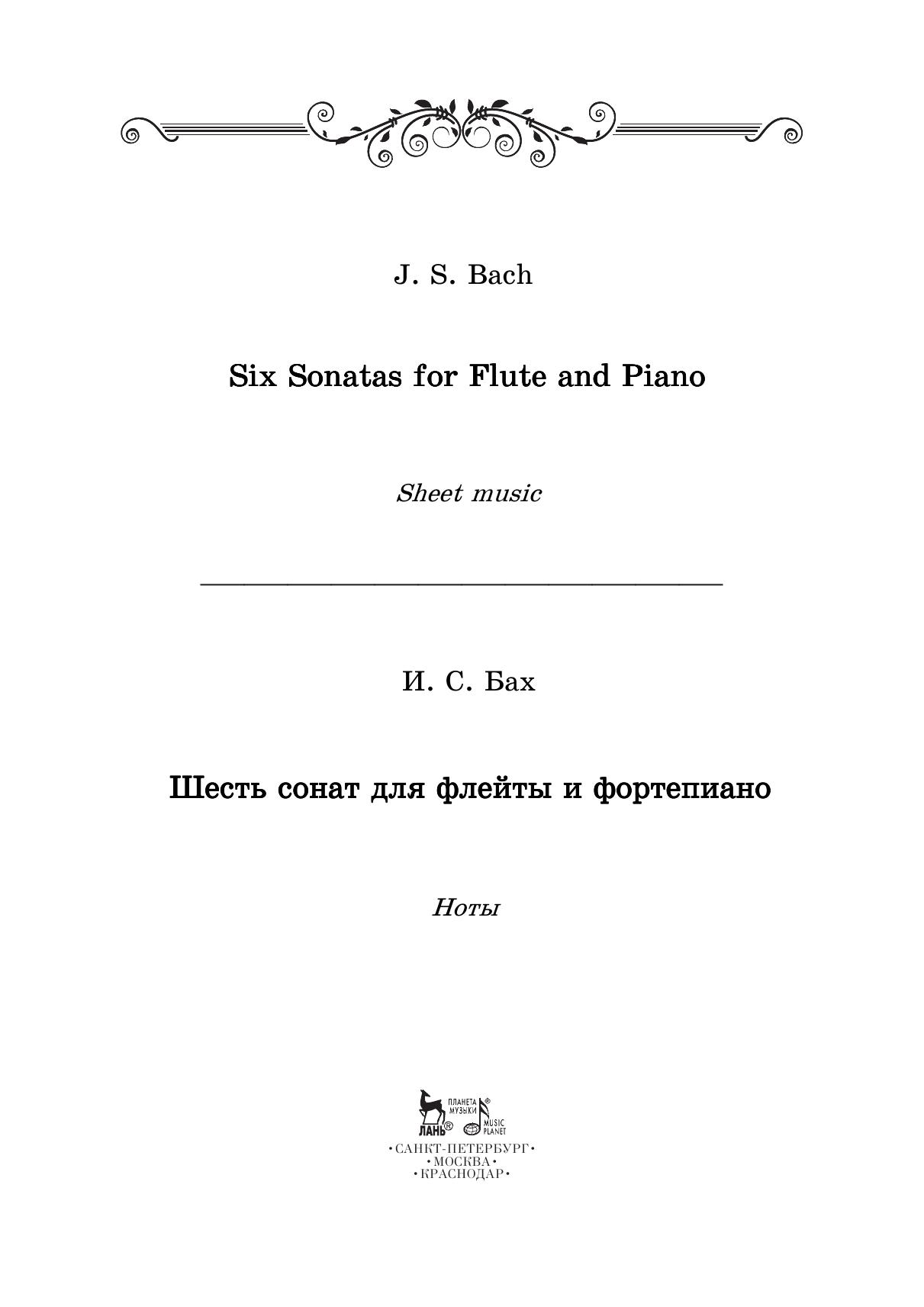 Среди сочинений великого немецкого классика И. С. Баха (1685—1750) огромную роль играют сочинения камерного жанра. Особое положение занимают инструментальные сонаты, в развитие которых композитор внёс значительный для своего времени вклад. Предлагаемое издание включает в себя две тетради. Первая тетрадь содержит шесть сонат для флейты и фортепиано BWV 1030—1035. Прилагаемая вторая тетрадь содержит флейтовую партию названных шести сонат и партиту для флейты соло BWV 1013. Цикл сонат являет собой чрезвычайное разнообразие не только композиционных техник и художественных образов, но и уровней технической сложности для флейтиста. Нотный текст сонат в данном издании максимально приближен к уртексту; авторские штрихи в партии флейты сохранены. Сборник адресован широкому кругу исполнителей на флейте, начиная с учащихся музыкальных школ до студентов консерватории и профессиональных исполнителей. Among the works by the great German classic J.S. Bach (1685–1750), the chamber works are of much importance. A special place belongs to instrumental sonatas, for whose development the composer made a significant contribution for his time. The current edition includes two books. This one, the first book consists of six sonatas for flute and piano (BWV 1030–1035). The enclosed second book contains the flute part of the above mentioned six sonatas and partita for solo flute (BWV 1013). The cycle of sonatas is very diverse not only in its compositional techniques and artistic images, but also in levels of technical complexity for the flautist. The sonatas’ score in this edition is as close as possible to the urtext; the author's articulation in the flute are preserved. The collection is addressed to a wide range of performers on the flute, from students of children's music schools to conservatory students and professional performers.