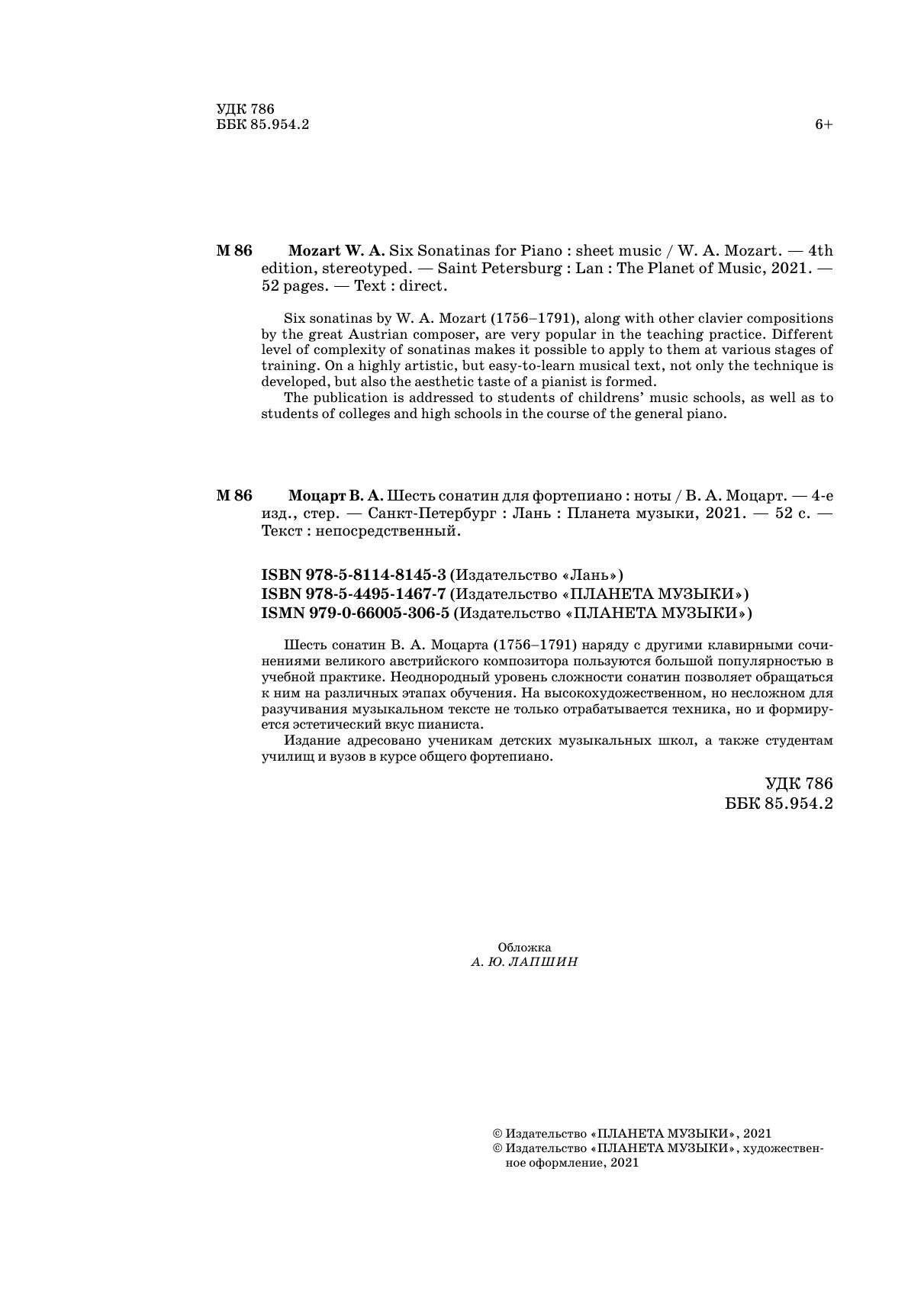 Шесть сонатин В. А. Моцарта (1756-1791) наряду с другими клавирными сочинениями великого австрийского композитора пользуются большой популярностью в учебной практике. Неоднородный уровень сложности сонатин позволяет обращаться к ним на различных этапах обучения. На высокохудожественном, но несложном для разучивания музыкальном тексте не только отрабатывается техника, но и формируется эстетический вкус пианиста. Издание адресовано ученикам детских музыкальных школ, а также студентам училищ и вузов в курсе общего фортепиано.