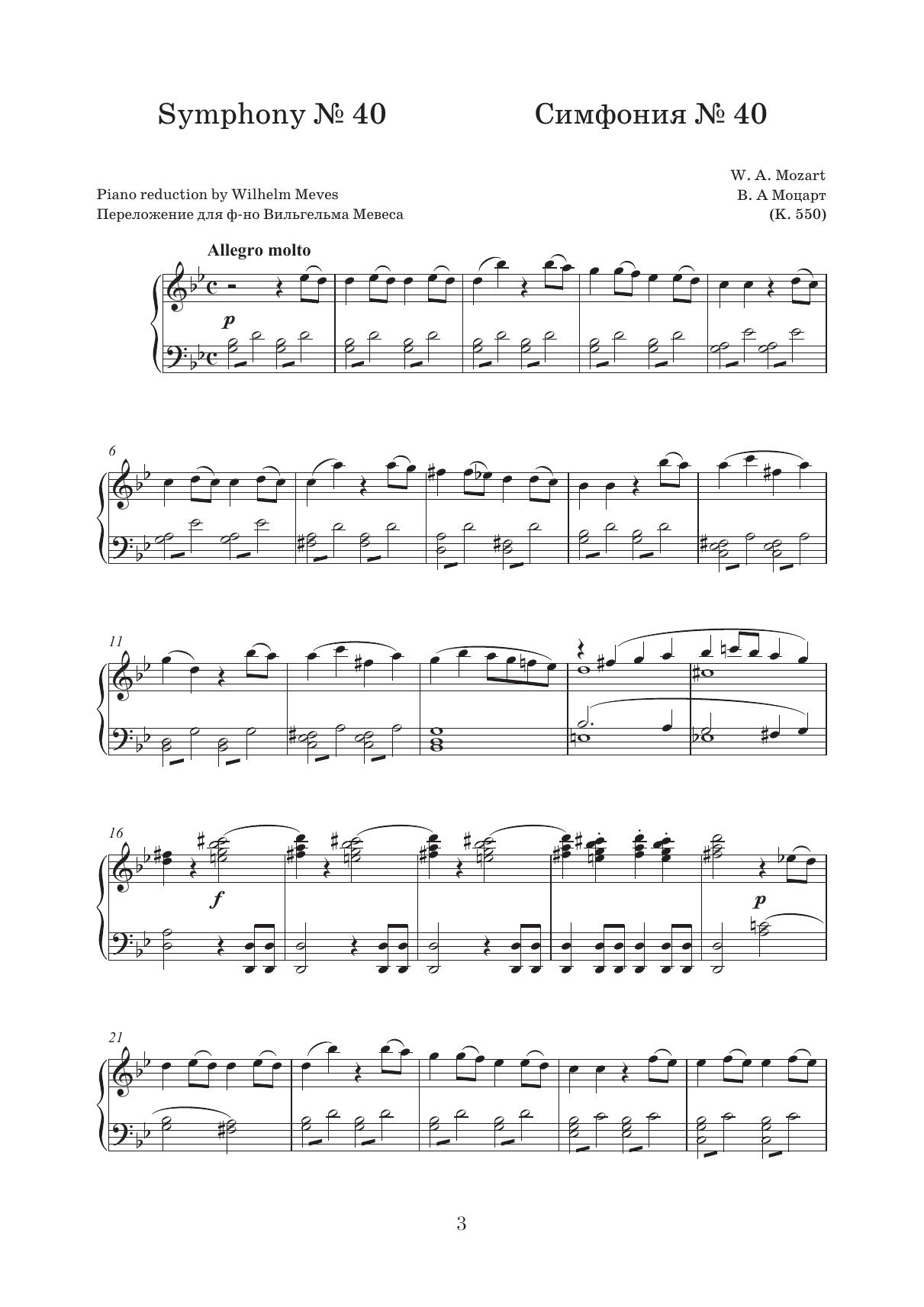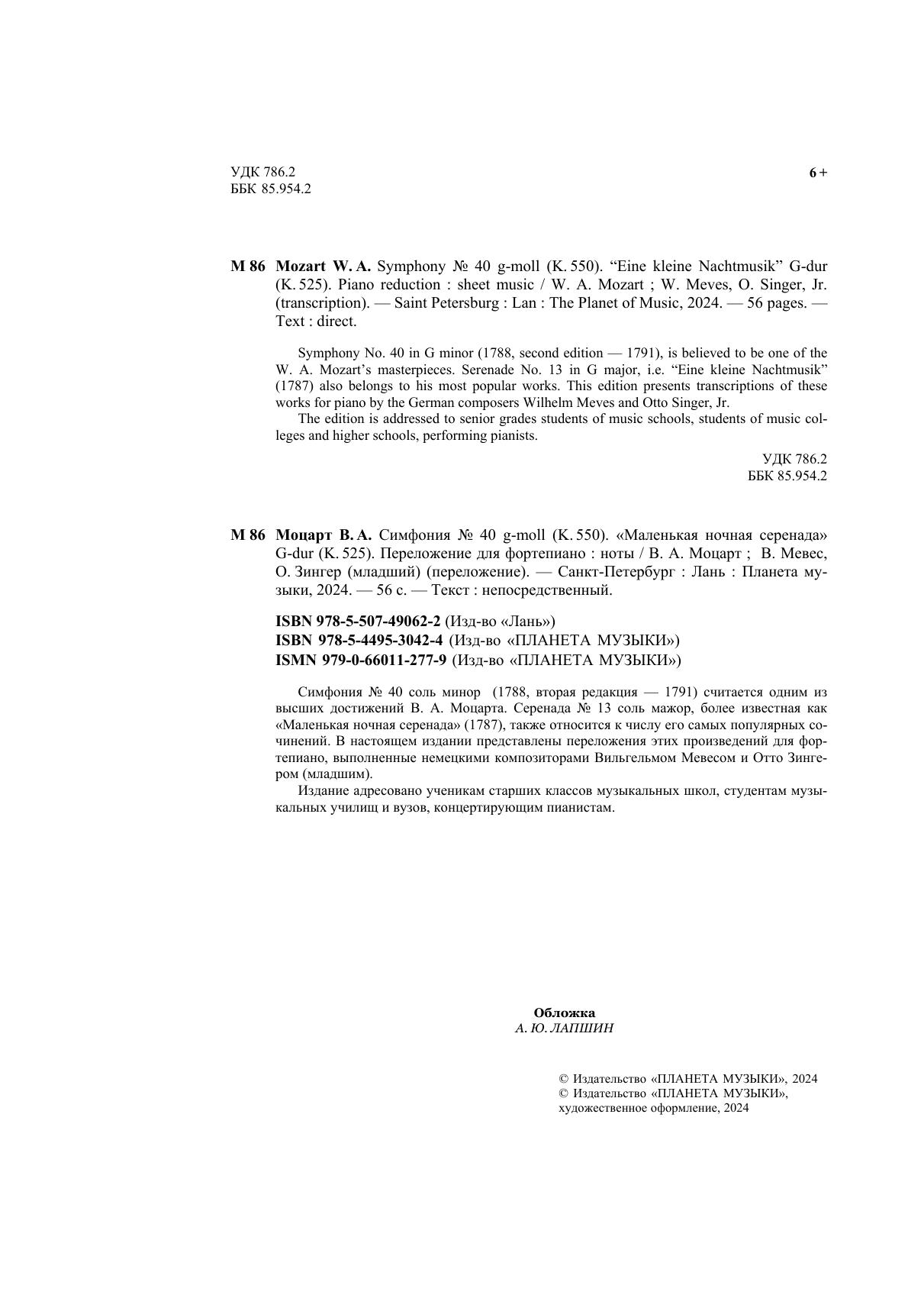 Симфония № 40 соль минор (1788, вторая редакция — 1791) считается одним из высших достижений В. А. Моцарта. Серенада № 13 соль мажор, более известная как «Маленькая ночная серенада» (1787), также относится к числу его самых популярных со-чинений. В настоящем издании представлены переложения этих произведений для фор-тепиано, выполненные немецкими композиторами Вильгельмом Мевесом и Отто Зинге-ром (младшим). Издание адресовано ученикам старших классов музыкальных школ, студентам музы-кальных училищ и вузов, концертирующим пианистам. Symphony No. 40 in G minor (1788, second edition — 1791), is believed to be one of the W. A. Mozart’s masterpieces. Serenade No. 13 in G major, i.e. “Eine kleine Nachtmusik” (1787) also belongs to his most popular works. This edition presents transcriptions of these works for piano by the German composers Wilhelm Meves and Otto Singer, Jr. The edition is addressed to senior grades students of music schools, students of music col-leges and higher schools, performing pianists.