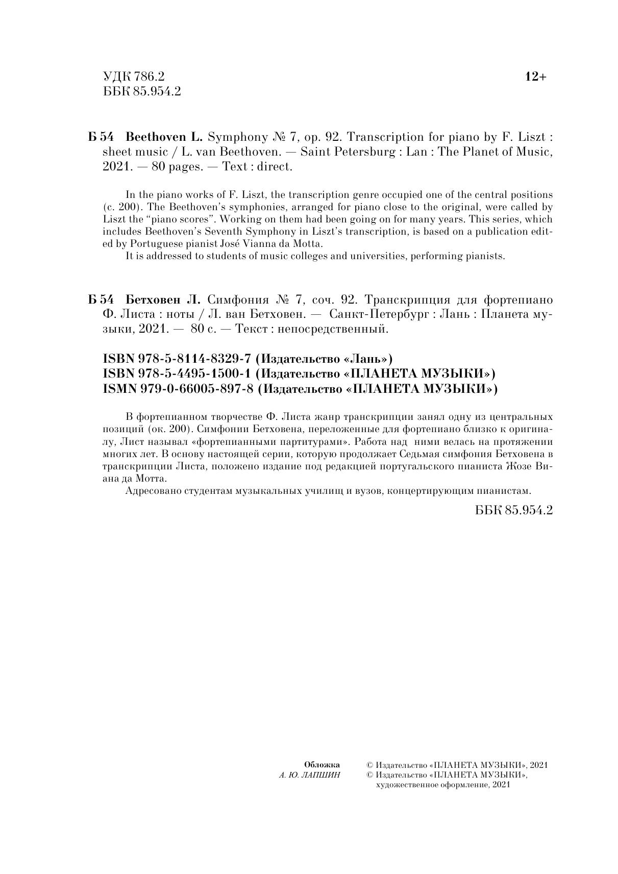 Симфония № 7. Соч. 92. Транскрипция для фортепиано Ф. Листа. Symphony № 7. Op. 92. Transcription for piano by F. Liszt