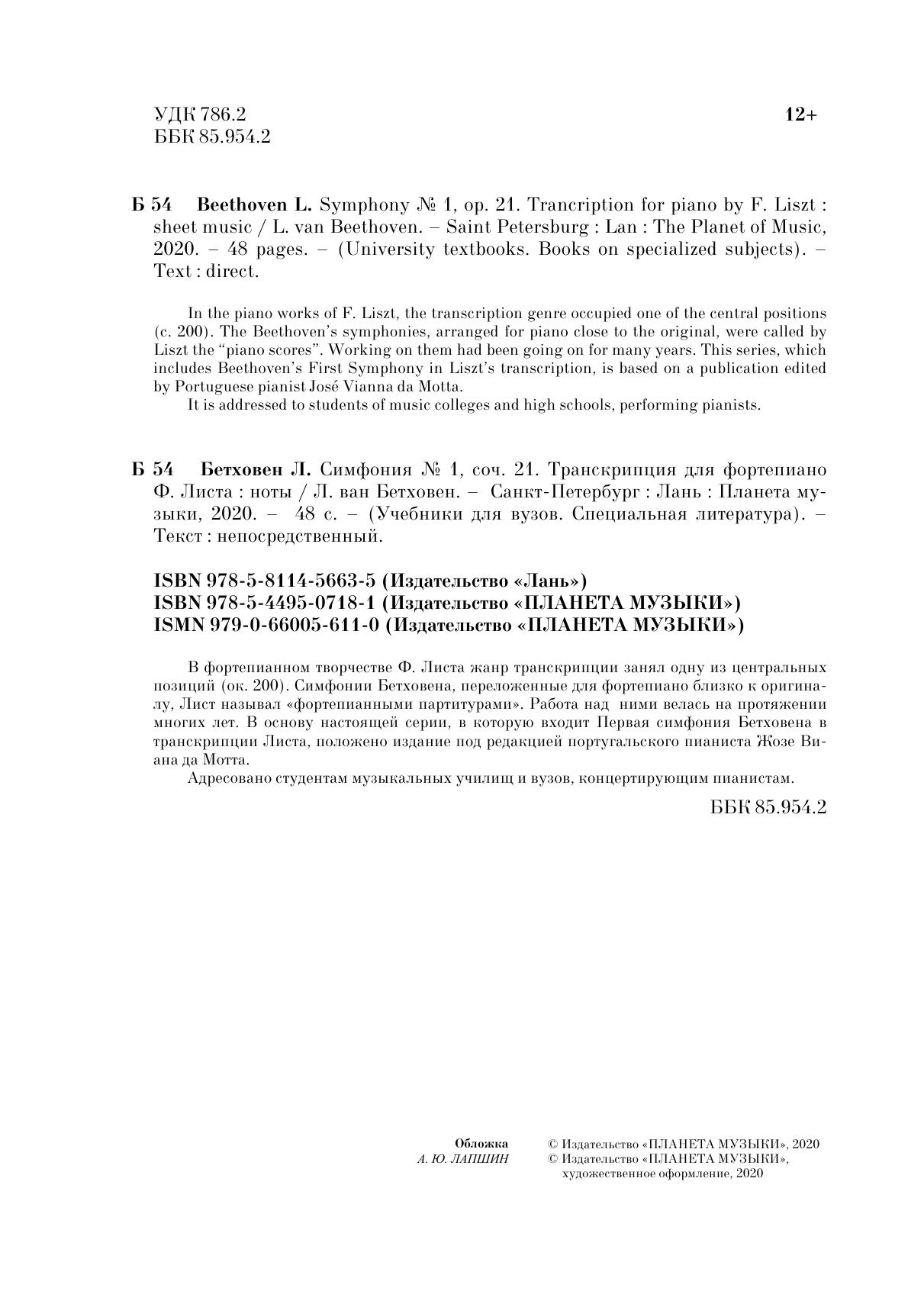 В фортепианном творчестве Ф. Листа жанр транскрипции занял одну из центральных позиций (ок.200). Симфонии Бетховена, переложенные для фортепиано близко к оригиналу, Лист называл "фортепианными партитурами". Работа над ними велась на протяжении многих лет. В основу настоящей серии, в которую входит Первая симфония Бетховена, положено издание под редакцией португальского пианиста Жозе Виана да Мотта.