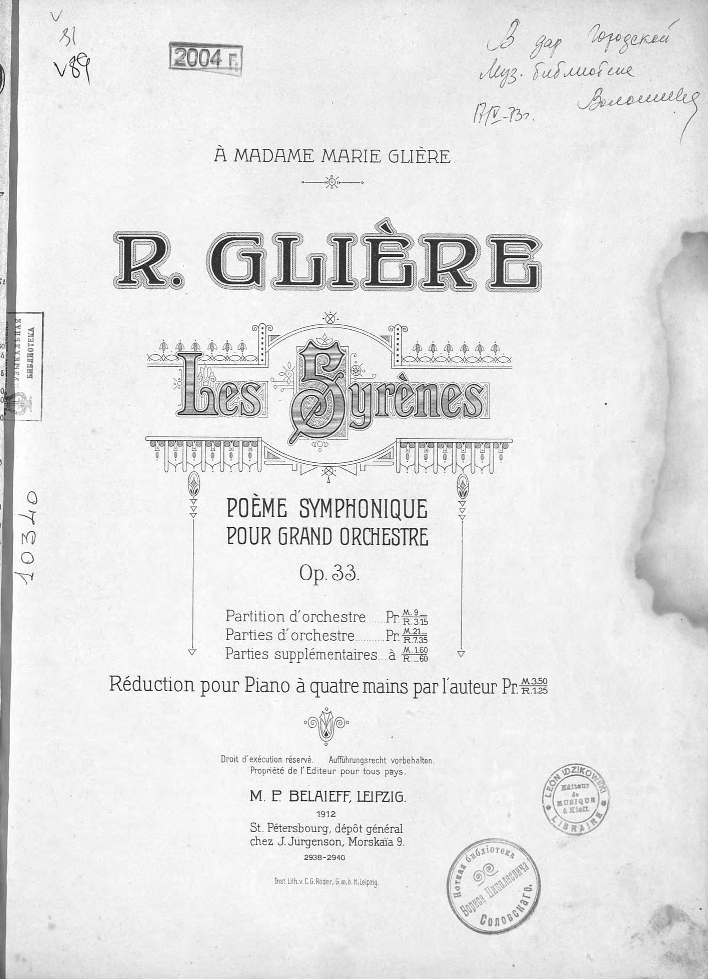 Перешедшие в общественное достояние материалы электронного фонда ЦГПБ им. В.В. Маяковского. Сведения о издательстве или типографии: изд. М. П. Беляева. Место издания: Лейпциг