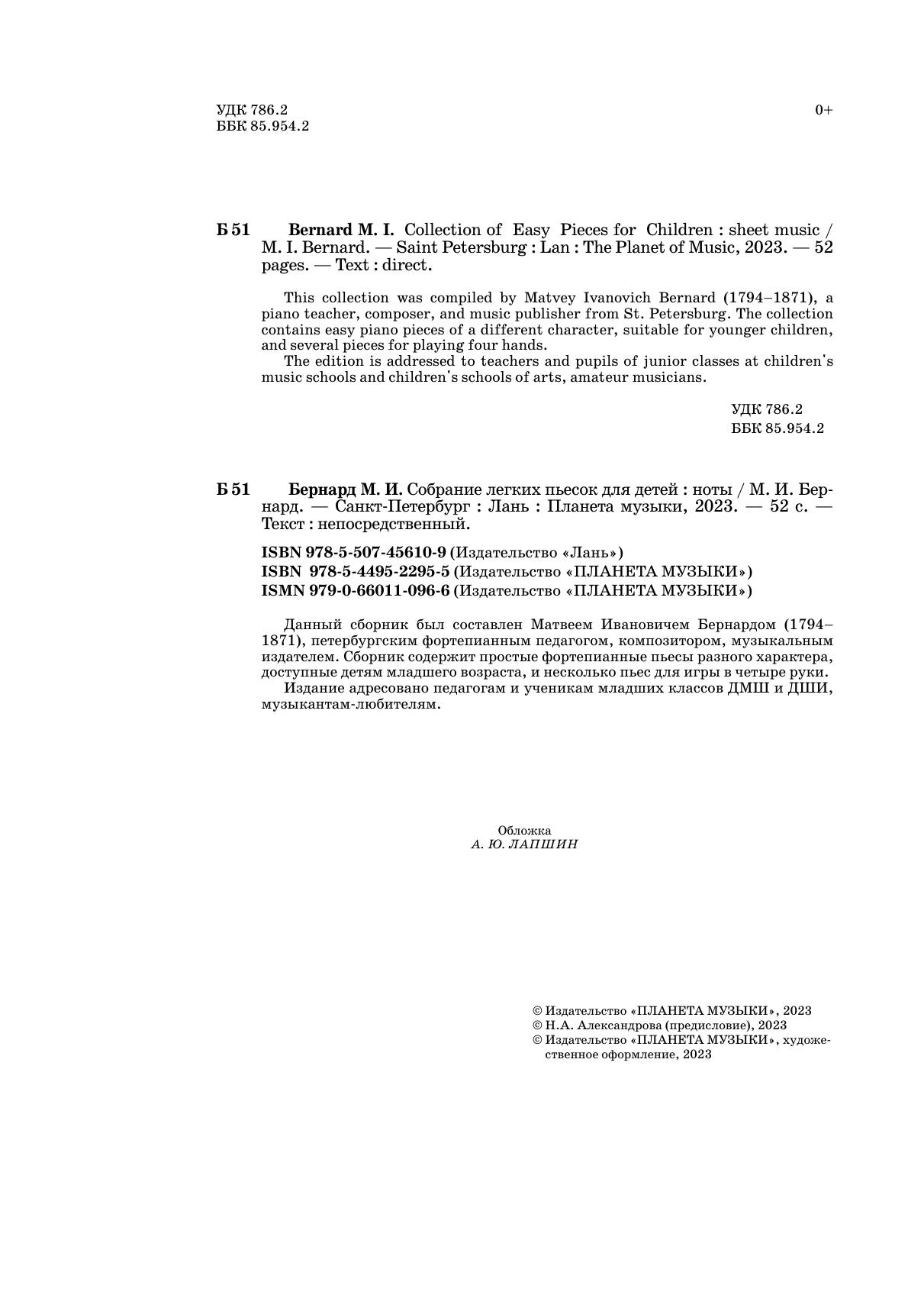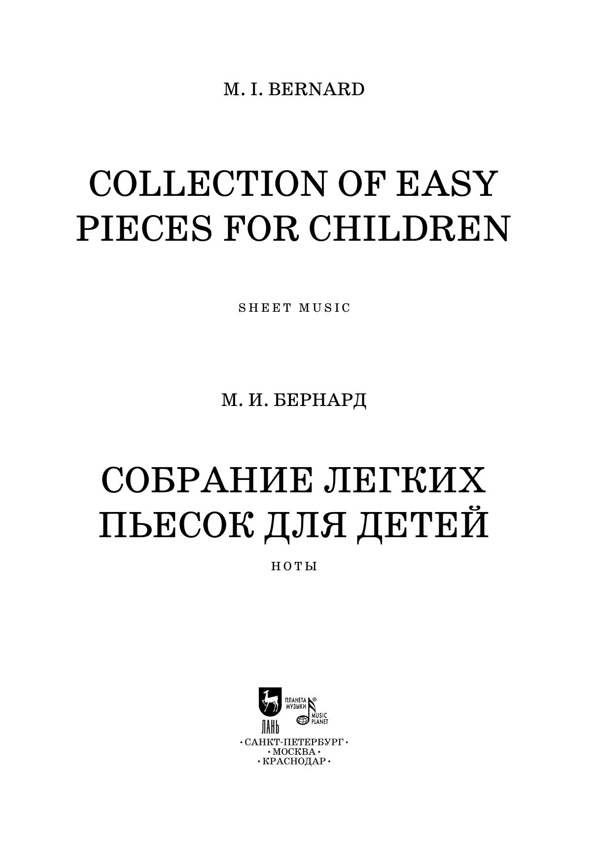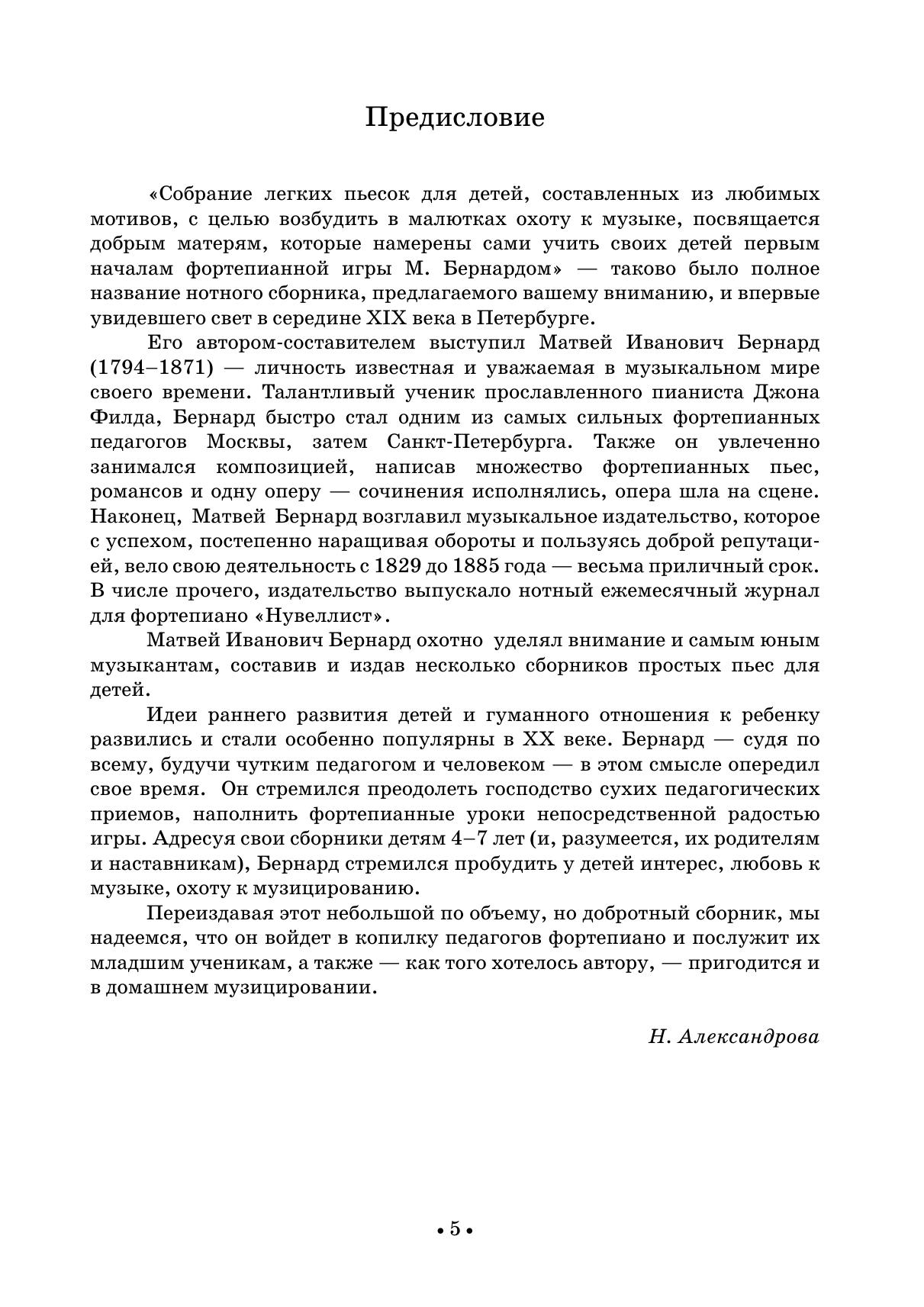 This collection was compiled by Matvey Ivanovich Bernard (1794–1871), a piano teacher, composer, and music publisher from St. Petersburg. The collection contains easy piano pieces of a different character, suitable for younger children, and several pieces for playing four hands.