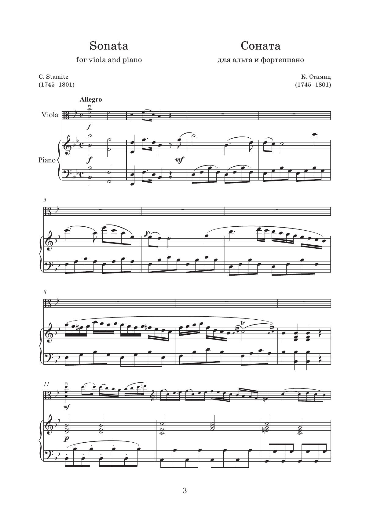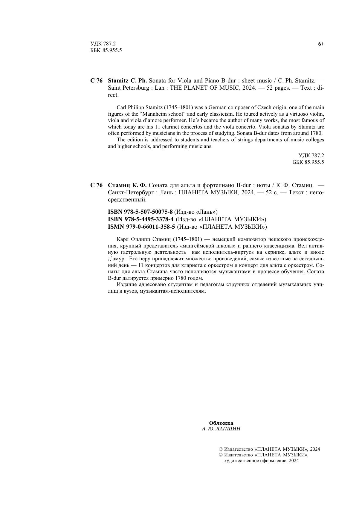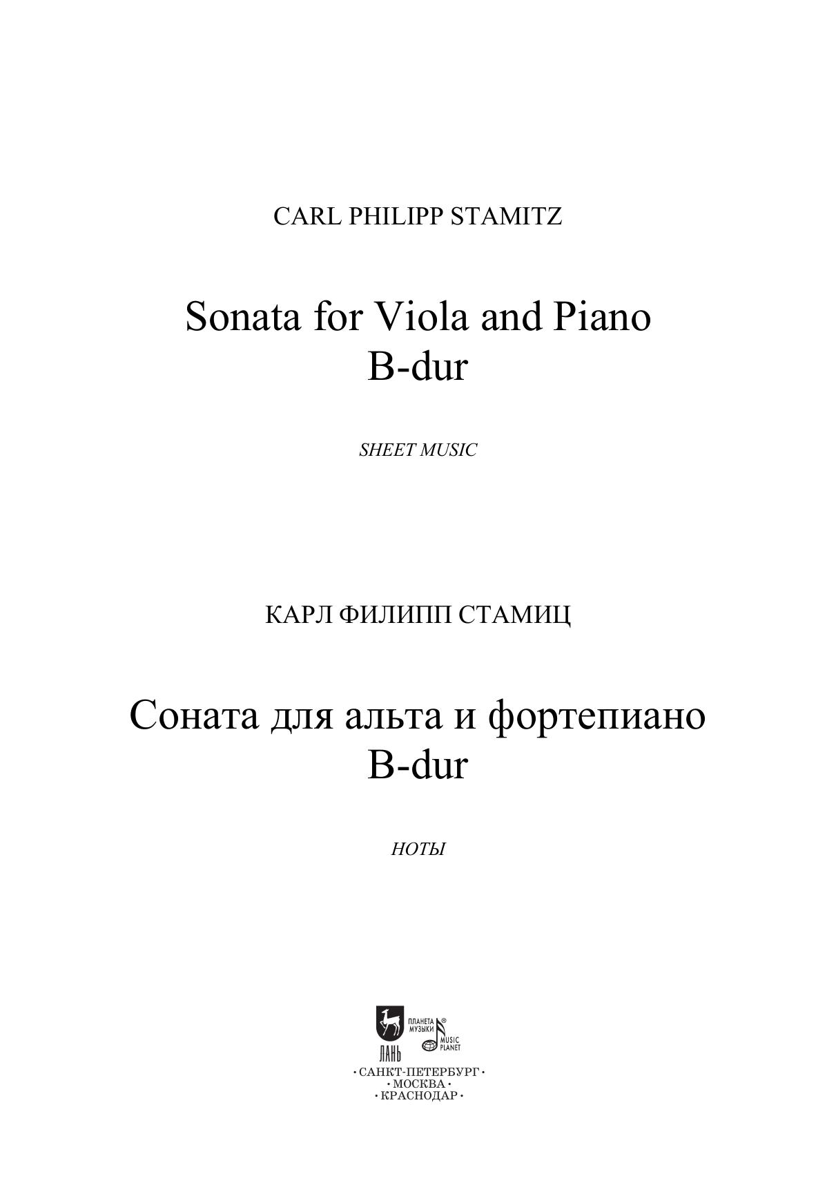 Карл Стамиц (1745–1801) — крупный представитель «мангеймской школы» и раннего классицизма. Вел активную гастрольную деятельность как исполнитель-виртуоз на скрипке, альте и виоле д’амур. Его перу принадлежит множество произведений, самые известные на сегодняшний день — 11 концертов для кларнета с оркестром и концерт для альта с оркестром. Сонаты для альта Стамица часто исполняются музыкантами в процессе обучения. Соната B-dur датируется примерно 1780 годом. Издание адресовано студентам и педагогам струнных отделений музыкальных училищ и вузов, музыкантам-исполнителям. Carl Philipp Stamitz (1745–1801) was a German composer of Czech origin, one of the main figures of the “Mannheim school” and early classicism. He toured actively as a virtuoso violin, viola and viola d’amore performer. He’s became the author of many works, the most famous of which today are his 11 clarinet concertos and the viola concerto. Viola sonatas by Stamitz are often performed by musicians in the process of studying. Sonata B-dur dates from around 1780. The edition is addressed to students and teachers of strings departments of music colleges and higher schools, and performing musicians.