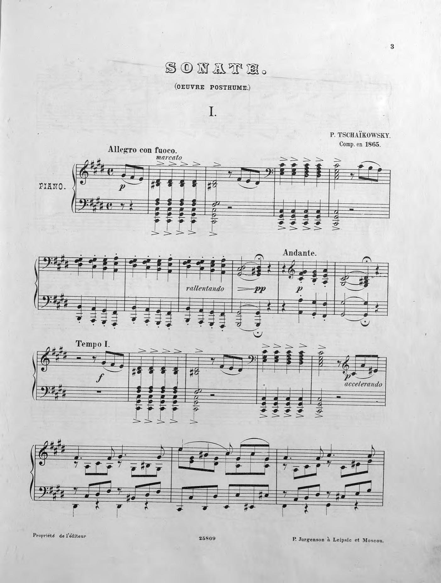 Sonate (Oeuvre posthume) comp. en 1865 par P. Tschaikowsky