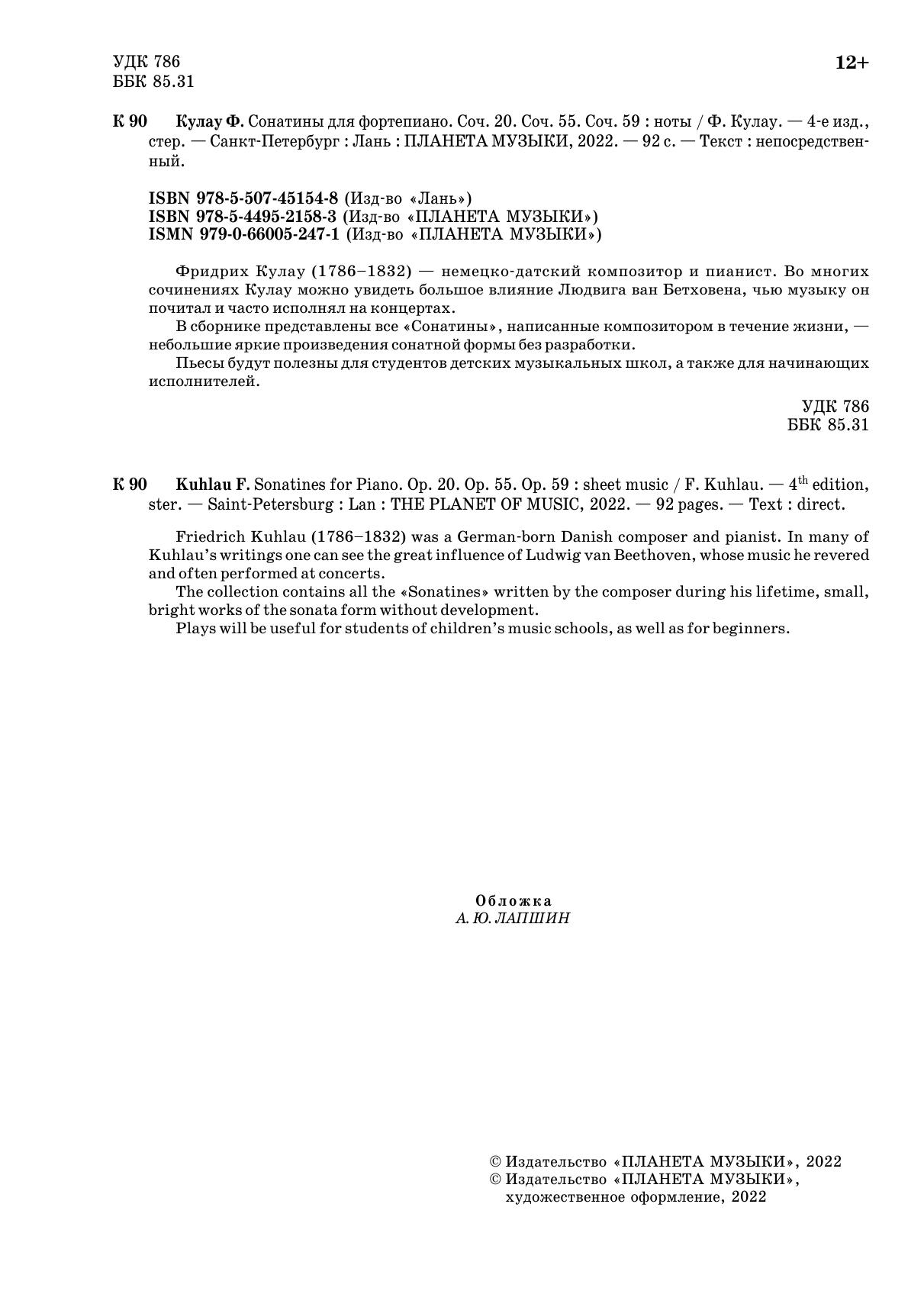 Фридрих Кулау (1786–1832) — немецко-датский композитор и пианист. Во многих сочинениях Кулау можно увидеть большое влияние Людвига ван Бетховена, чью музыку он почитал и часто исполнял на концертах. В сборнике представлены все «Сонатины», написанные композитором в течение жизни, — небольшие яркие произведения сонатной формы без разработки. Пьесы буду полезны для студентов детских музыкальных школ, а также для начинающих исполнителей.