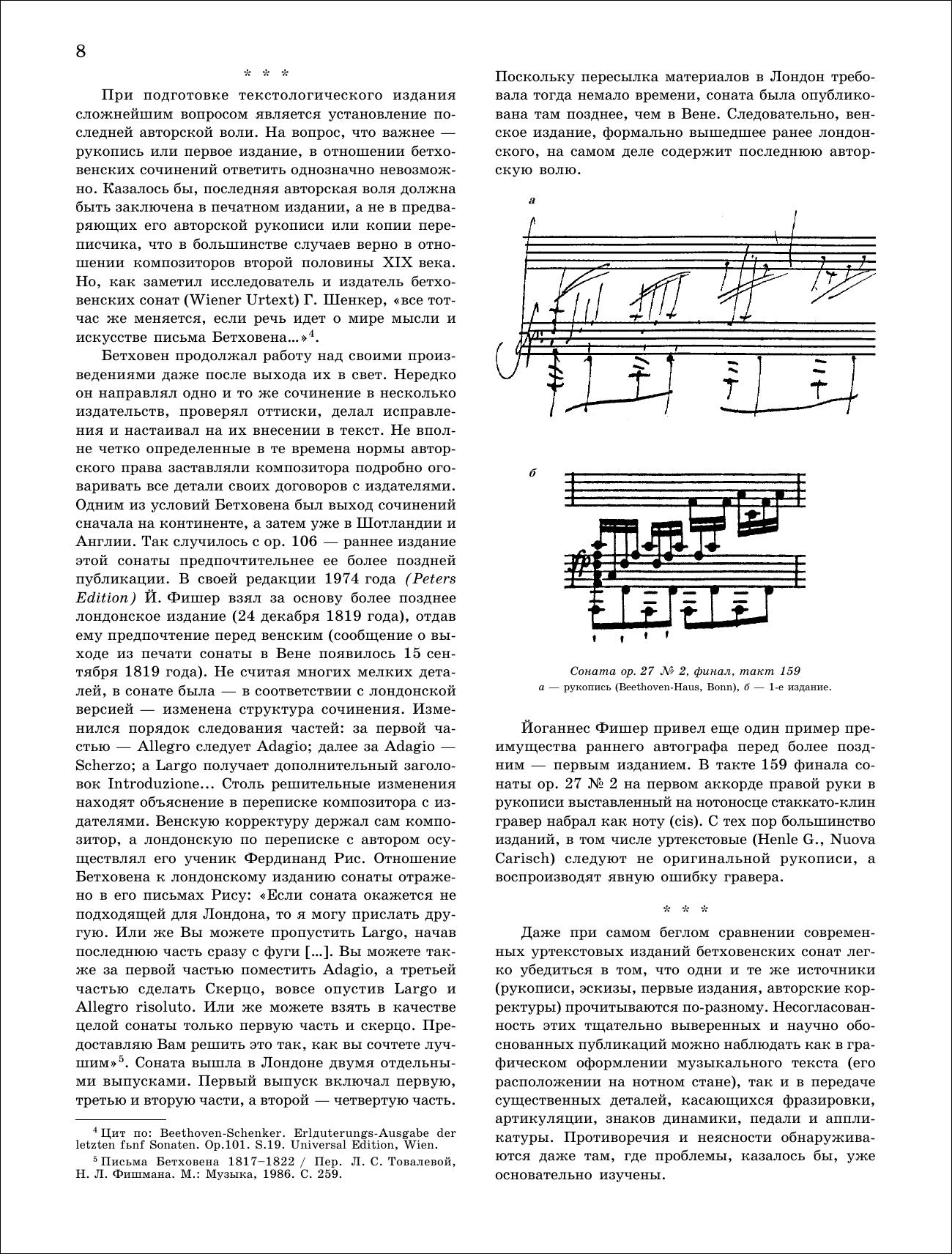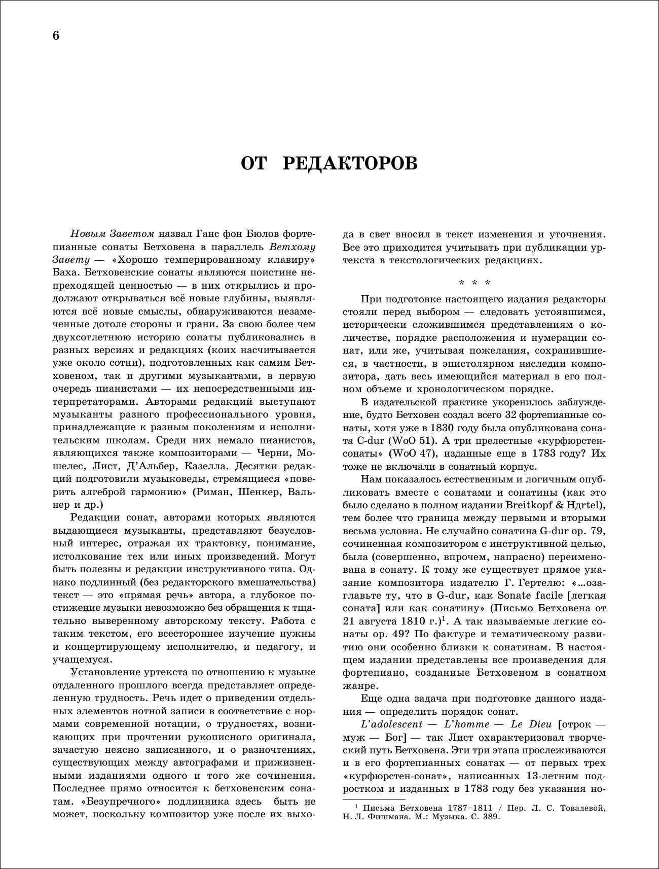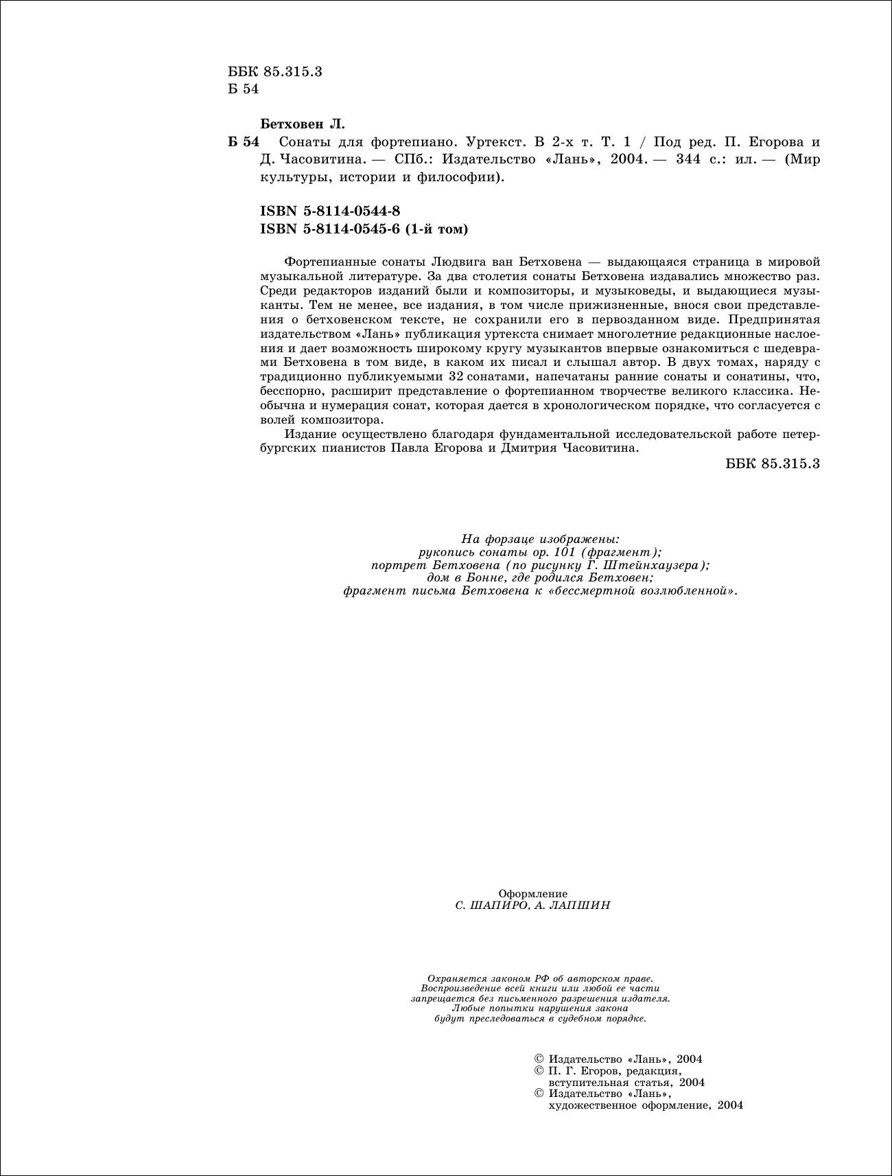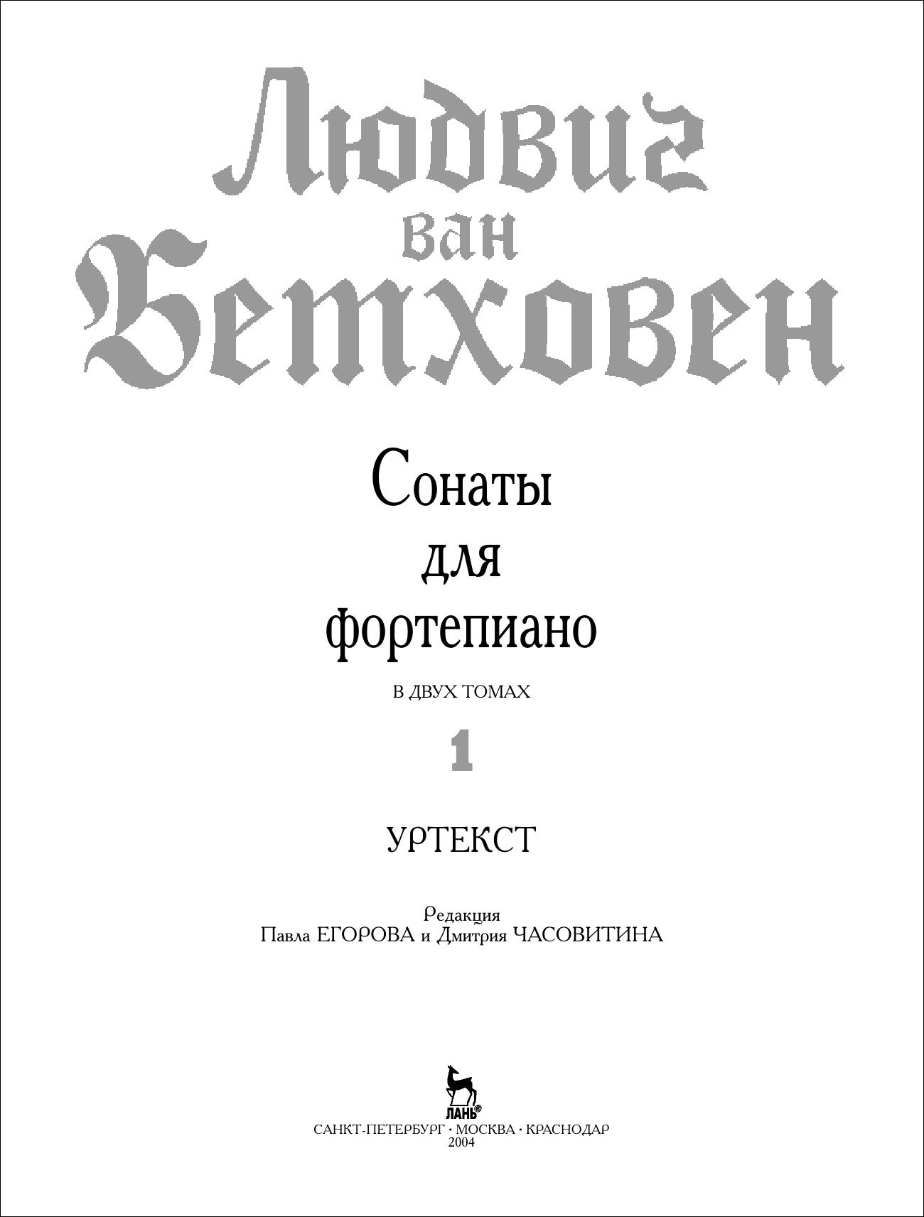 Фортепианные сонаты Людвига ван Бетховена — выдающаяся страница в мировой музыкальной литературе. За два столетия сонаты Бетховена издавались множество раз. Среди редакторов изданий были и композиторы, и музыковеды, и выдающиеся музыканты. Тем не менее, все издания, в том числе прижизненные, внося свои представления о бетховенском тексте, не сохранили его в первозданном виде. Предпринятая издательством «Лань» публикация уртекста снимает многолетние редакционные наслоения и дает возможность широкому кругу музыкантов впервые ознакомиться с шедеврами Бетховена в том виде, в каком их писал и слышал автор. В двух томах, наряду с традиционно публикуемыми 32 сонатами, напечатаны ранние сонаты и сонатины, что, бесспорно, расширит представление о фортепианном творчестве великого классика. Необычна и нумерация сонат, которая дается в хронологическом порядке, что согласуется с волей композитора. Издание осуществлено благодаря фундаментальной исследовательской работе петербургских пианистов Павла Егорова и Дмитрия Часовитина.