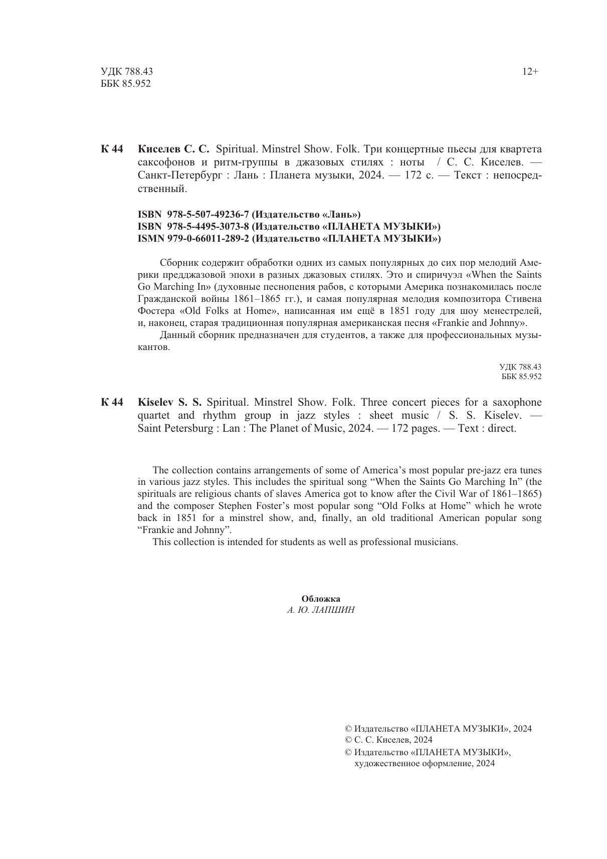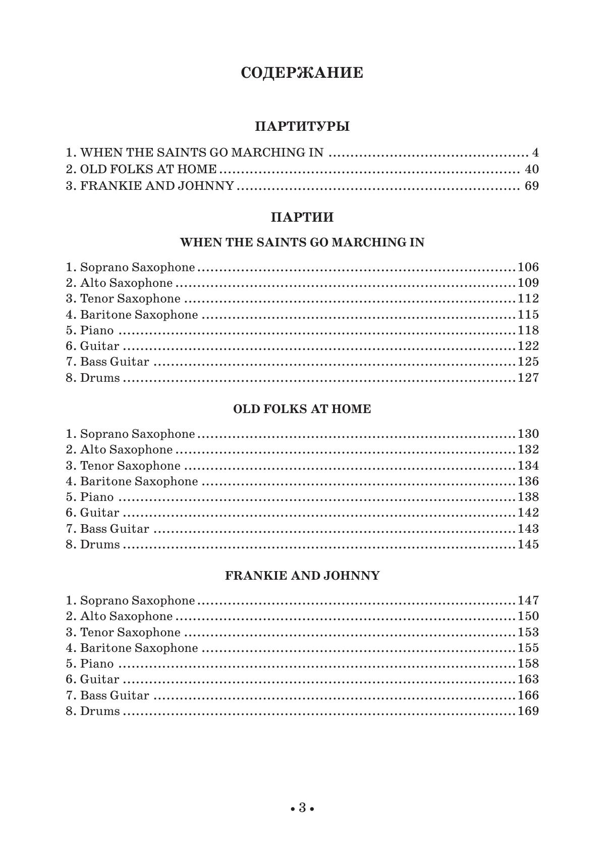 Сборник содержит обработки одних из самых популярных до сих пор мелодий Америки предджазовой эпохи в разных джазовых стилях. Это и спиричуэл «When the Saints Go Marching In» (духовные песнопения рабов, с которыми Америка познакомилась после Гражданской войны 1861–1865 гг.), и самая популярная мелодия композитора Стивена Фостера «Old Folks at Home», написанная им ещё в 1851 году для шоу менестрелей, и, наконец, старая традиционная популярная американская песня «Frankie and Johnny». Данный сборник предназначен для студентов, а также для профессиональных музыкантов. The collection contains arrangements of some of America’s most popular pre-jazz era tunes in various jazz styles. Among them i the spiritual song “When the Saints Go Marching In” (the spirituals are religious chants of slaves America got to know after the Civil War of 1861–1865) and the composer Stephen Foster’s most popular song “Old Folks at Home” which he wrote back in 1851 for a minstrel show, and, finally, an old traditional American popular song “Frankie and Johnny”. This collection is intended for students as well as professional musicians.