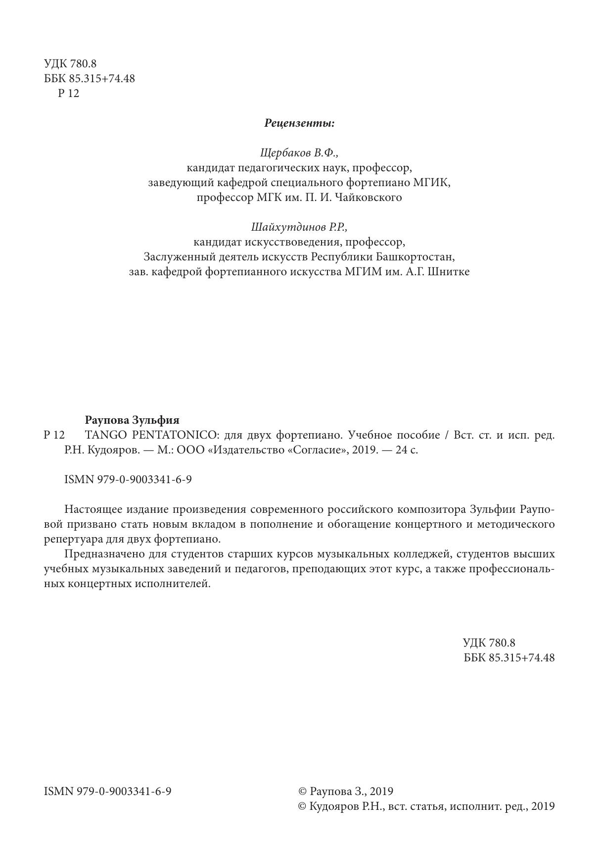 Настоящее издание произведения современного российского композитора Зульфии Рауповой призвано стать новым вкладом в пополнение и обогащение концертного и методического репертуара для двух фортепиано. Предназначено для студентов старших курсов музыкальных колледжей, студентов высших учебных музыкальных заведений и педагогов, преподающих этот курс, а также профессиональных концертных исполнителей.