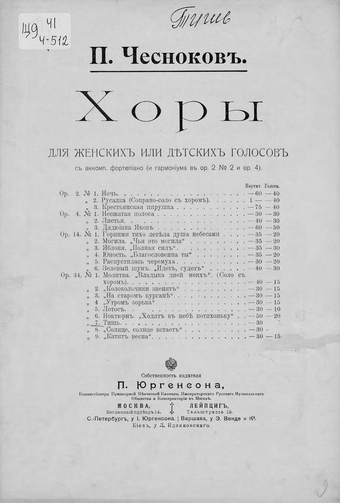 Перешедшие в общественное достояние материалы электронного фонда ЦГПБ им. В.В. Маяковского. Сведения о издательстве или типографии: П. Юргенсон. Место издания: Москва