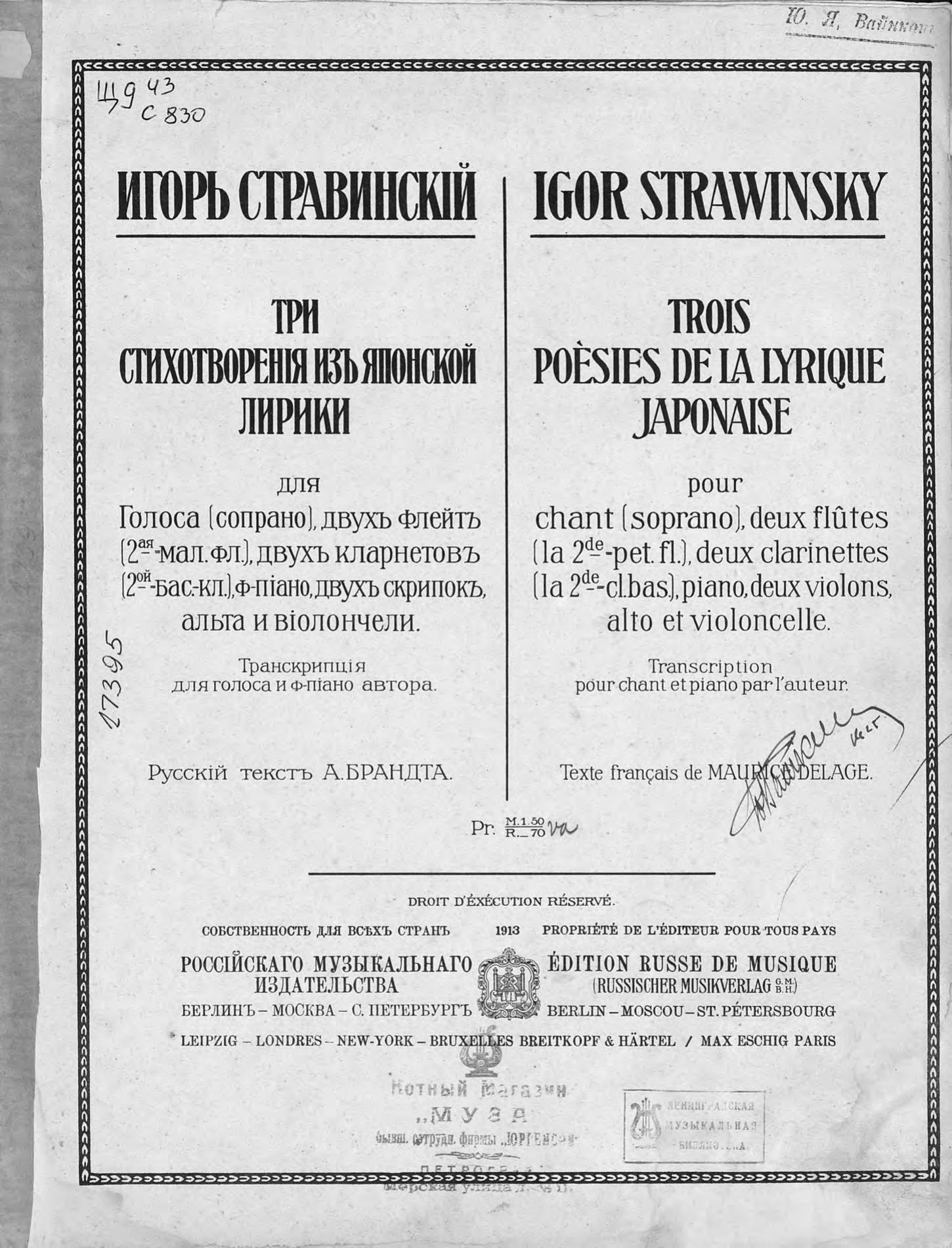 Перешедшие в общественное достояние материалы электронного фонда ЦГПБ им. В.В. Маяковского. Сведения о издательстве или типографии: Российское муз. изд-во. Место издания: Берлин