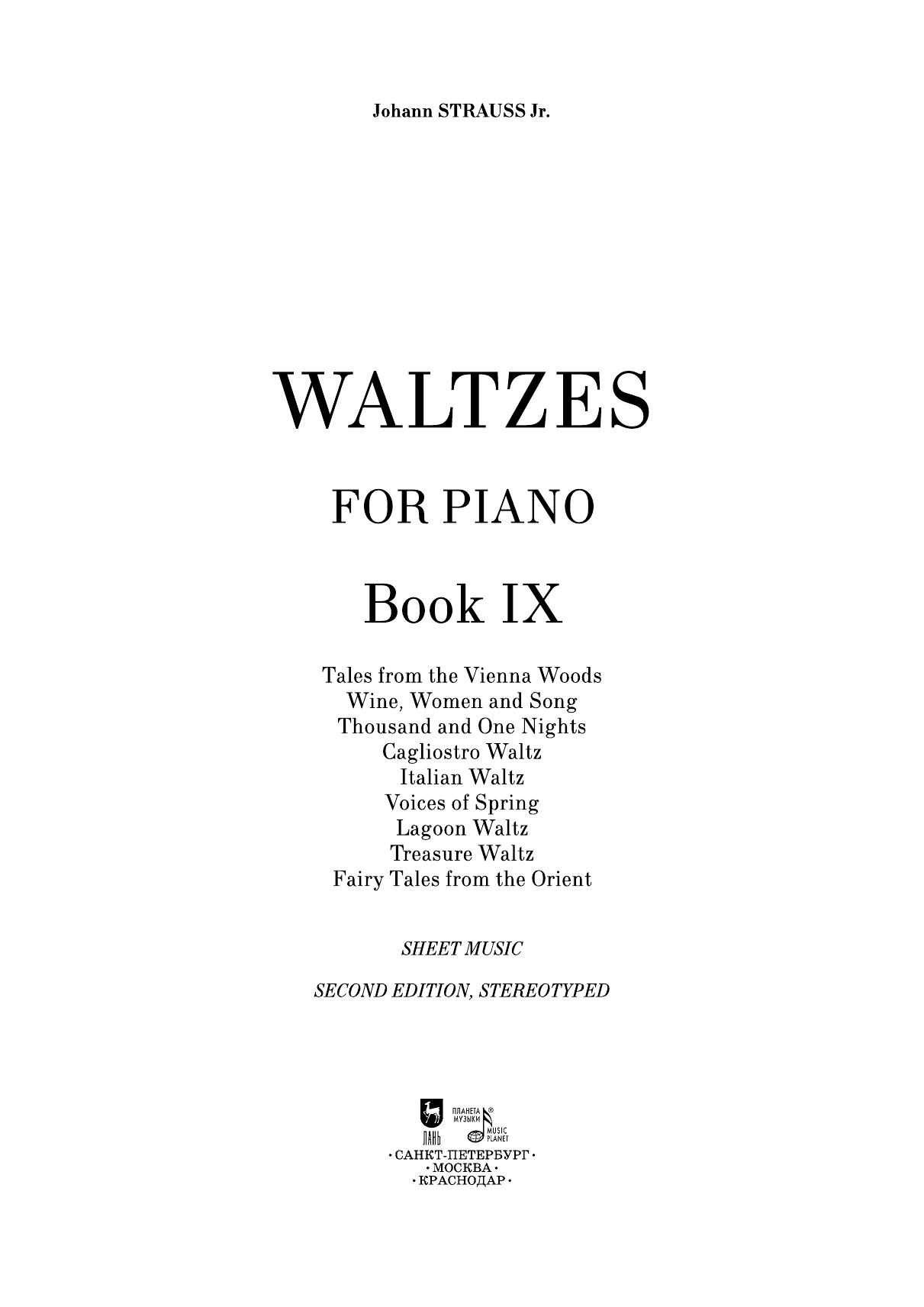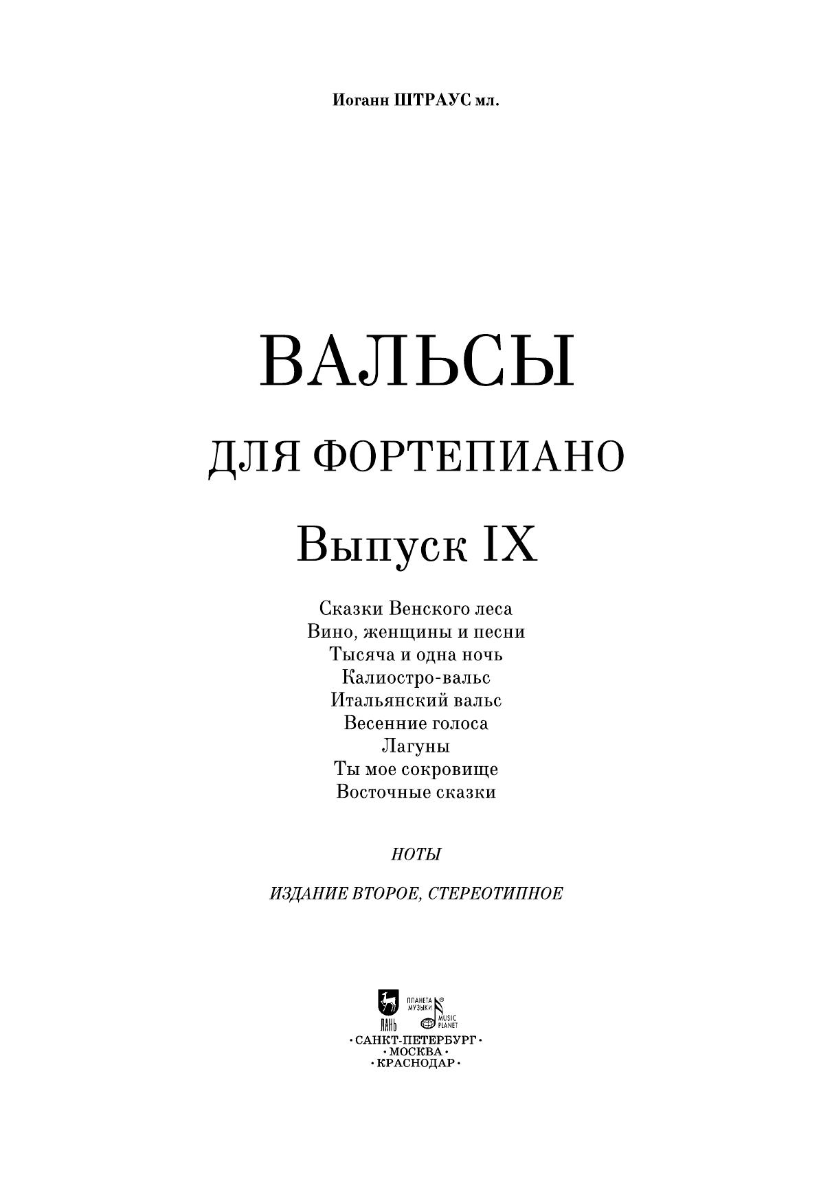 Вальсы. Для фортепиано. Выпуск IX. Сказки Венского леса. Вино, женщины и песни. Тысяча и одна ночь. Калиостро-вальс. Итальянский вальс. Весенние голоса. Лагуны
