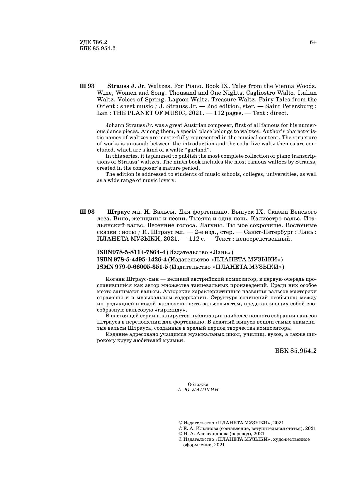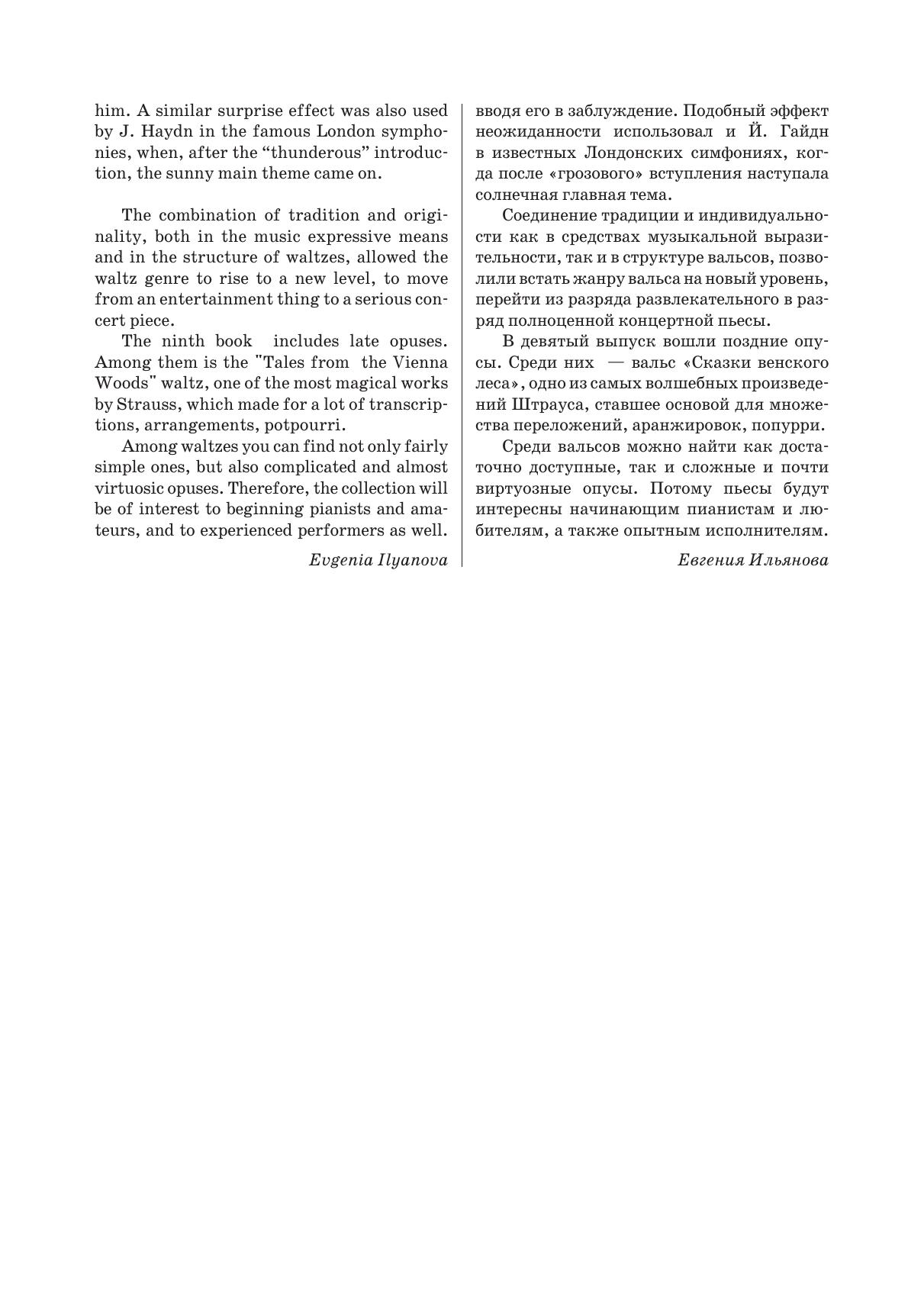 В настоящей серии планируется публикация наиболее полного собрания вальсов Штрауса в переложении для фортепиано. В девятый выпуск вошли самые знаменитые вальсы Штрауса, созданные в зрелый период творчества композитора.