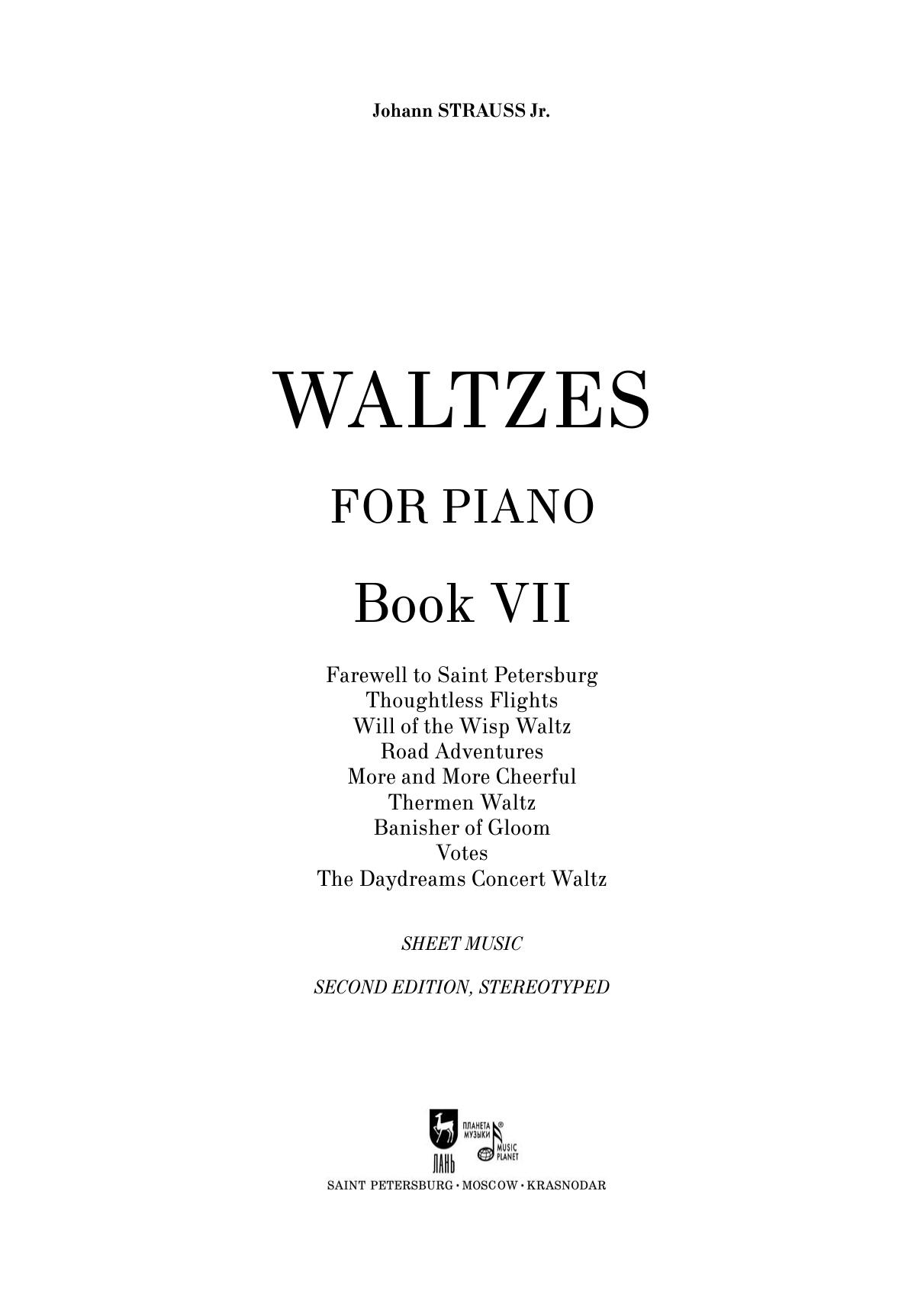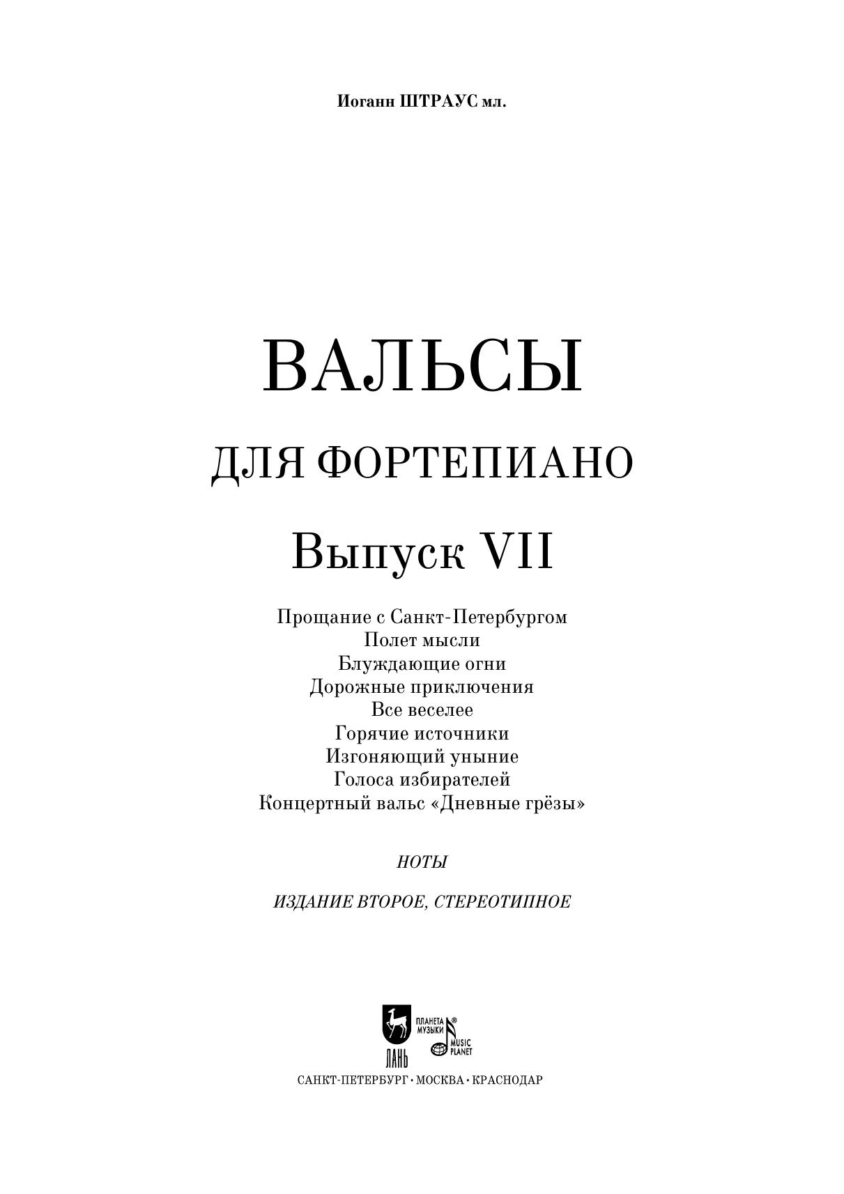 Вальсы. Для фортепиано. Выпуск VII. Прощание с Санкт-Петербургом. Полет мысли. Блуждающие огни. Дорожные приключения. Все веселее. Горячие источники. Изгоняющий уныние. Голоса избирателей. Концертный вальс «Дневные грёзы»