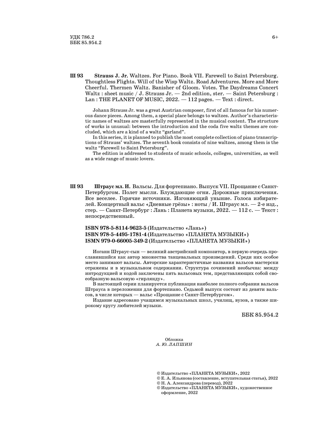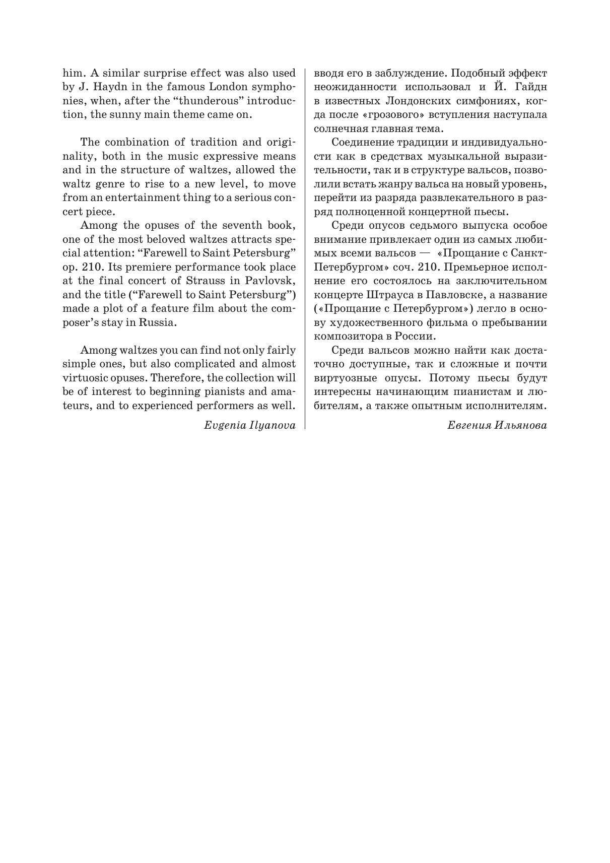 В настоящей серии планируется публикация наиболее полного собрания вальсов Штрауса в переложении для фортепиано. Седьмой выпуск состоит из девяти вальсов, в числе которых — вальс «Прощание с Санкт-Петербургом».