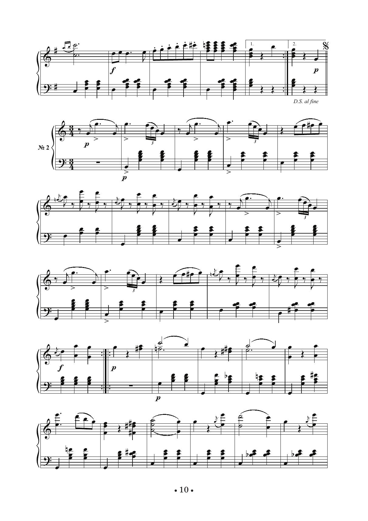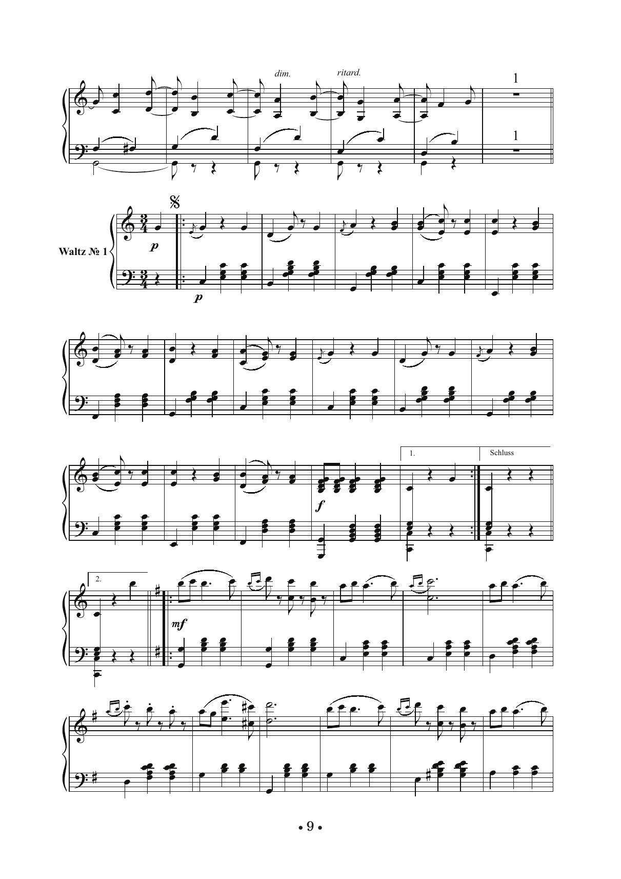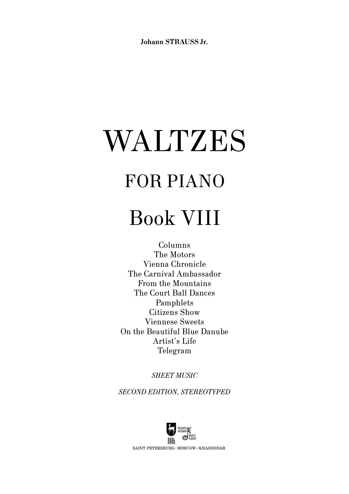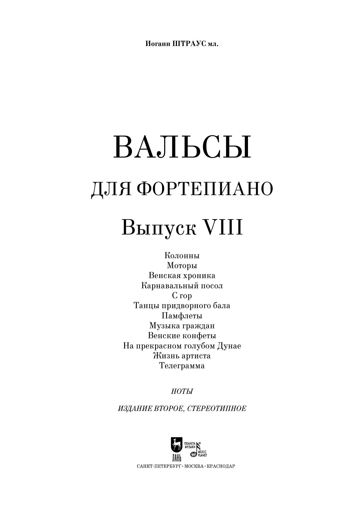 Вальсы. Для фортепиано. Выпуск VIII. Колонны. Моторы. Венская хроника. Карнавальный посол. С гор. Танцы придворного бала. Памфлеты. Музыка граждан. Венские конфеты. На прекрасном голубом Дунае. Жизнь артиста. Телеграмма