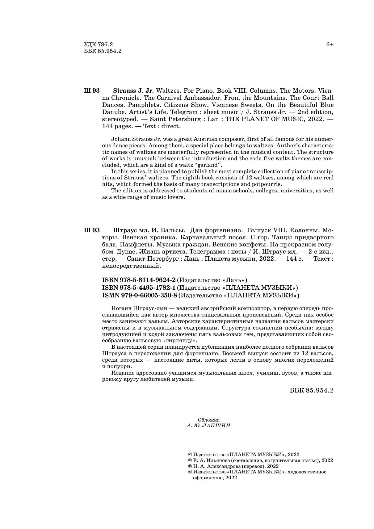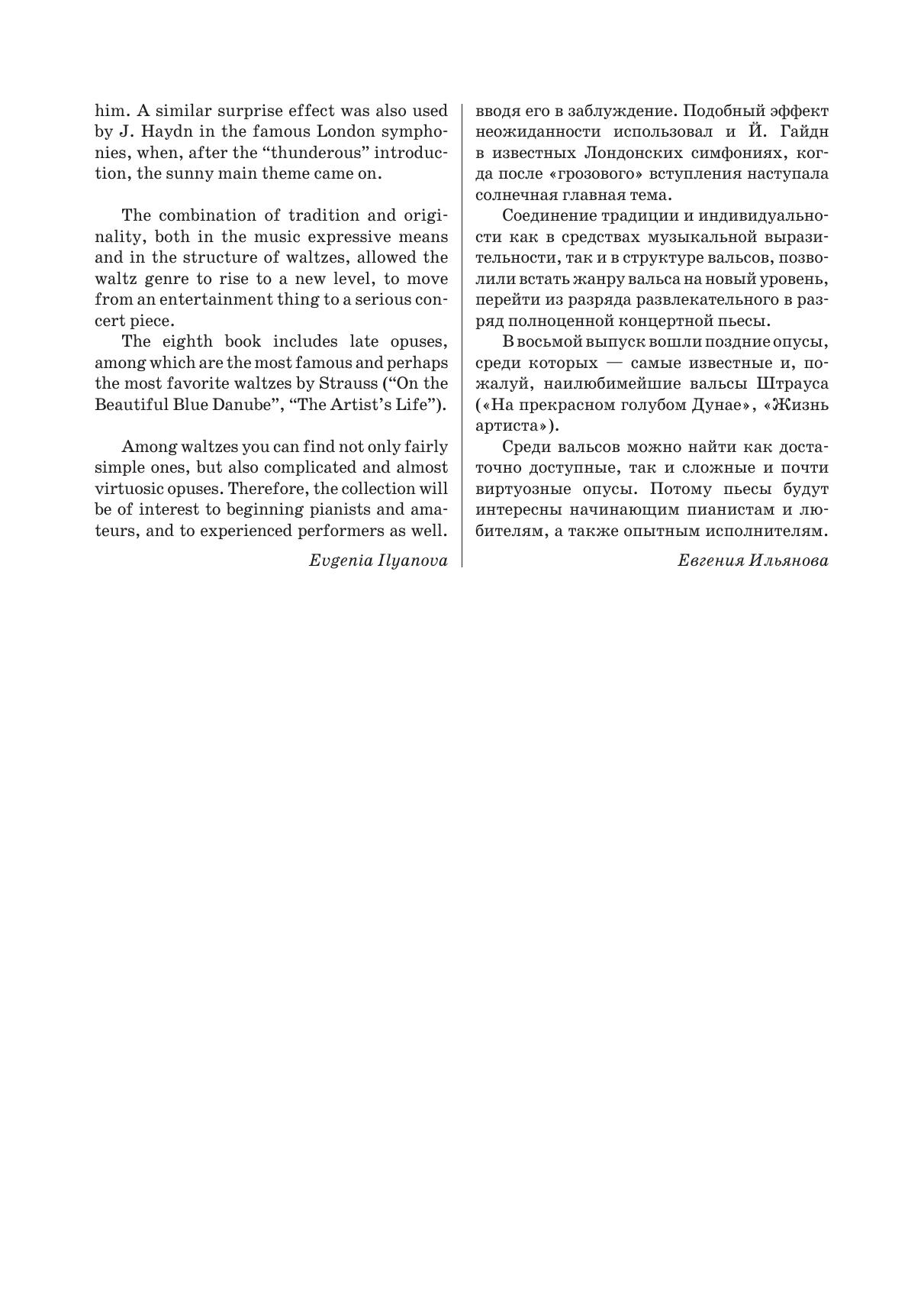 В настоящей серии планируется публикация наиболее полного собрания вальсов Штрауса в переложении для фортепиано. Восьмой выпуск состоит из 12 вальсов, среди которых — настоящие хиты, которые легли в основу многих переложений и попурри.