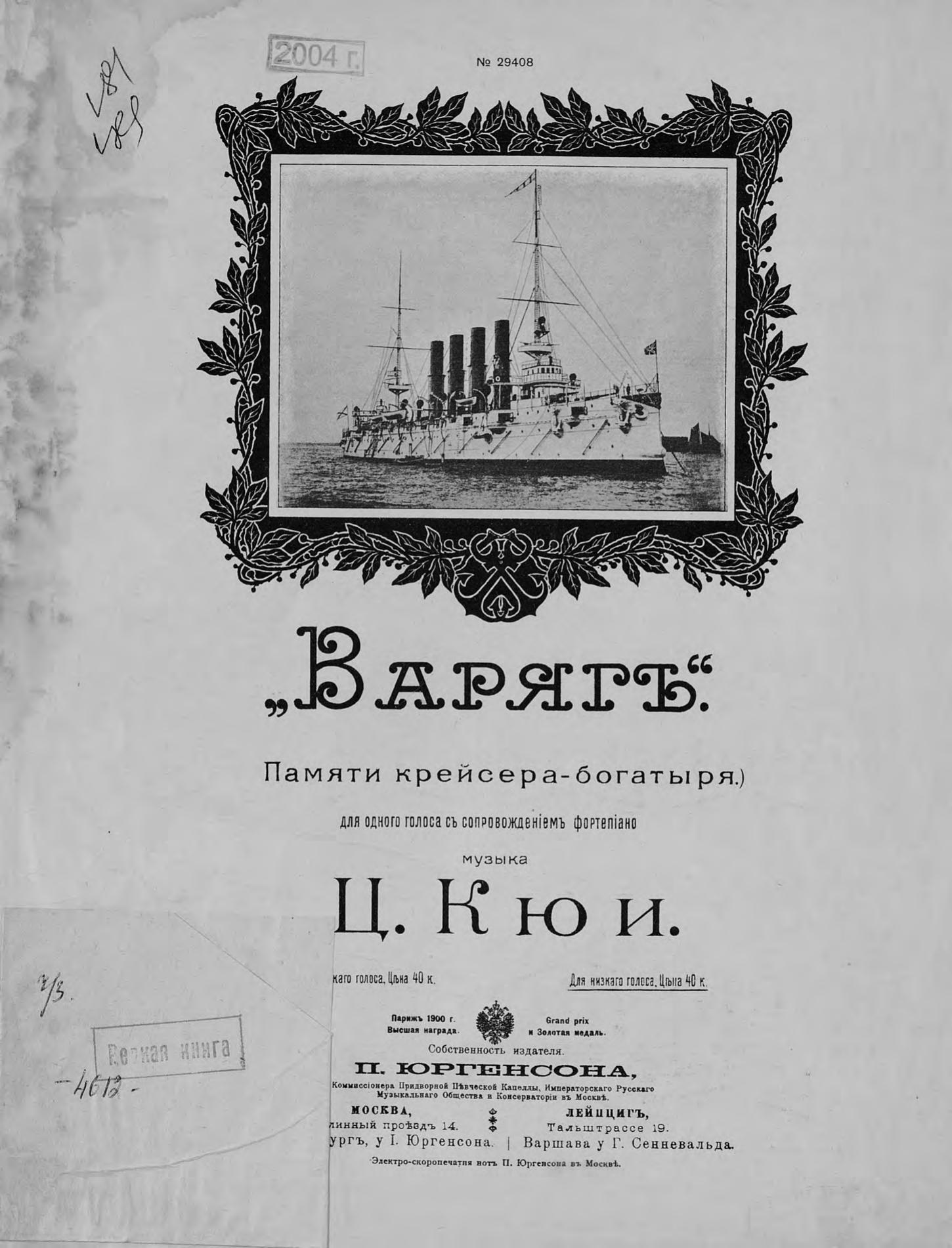 Перешедшие в общественное достояние материалы электронного фонда ЦГПБ им. В.В. Маяковского. Сведения о издательстве или типографии: П. Юргенсон. Место издания: Москва