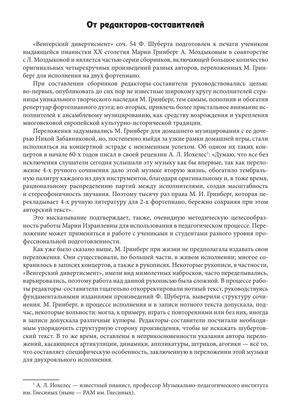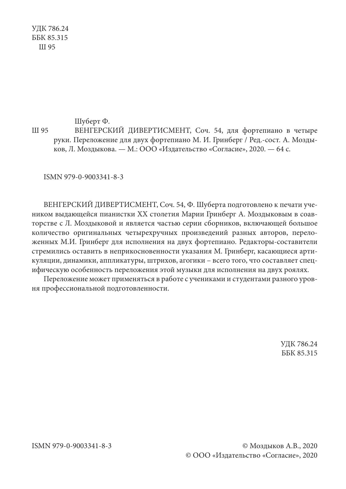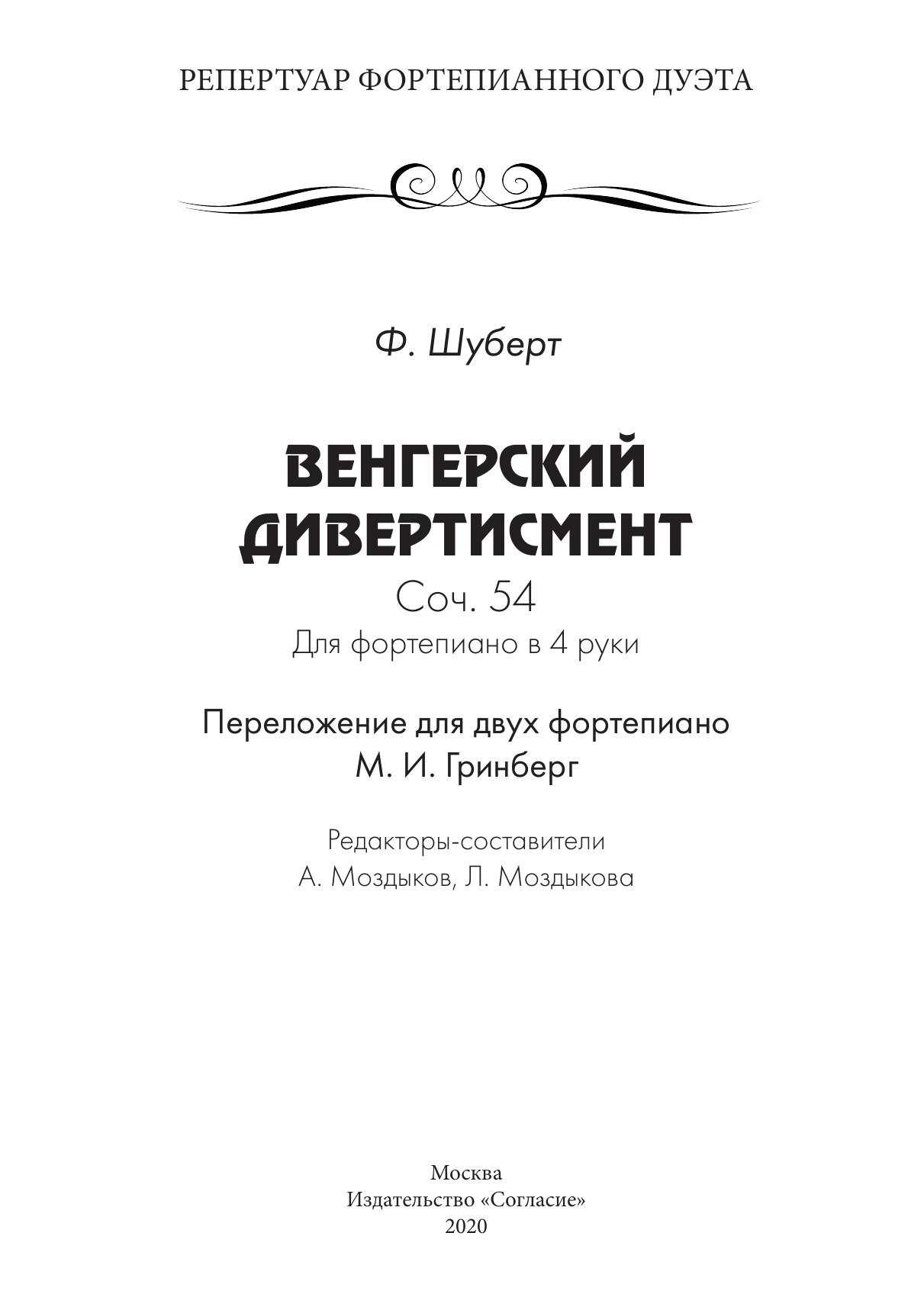 ВЕНГЕРСКИЙ ДИВЕРТИСМЕНТ, Соч. 54, Ф. Шуберта подготовлено к печати учеником выдающейся пианистки XX столетия Марии Гринберг А. Моздыковым в соавторстве с Л. Моздыковой и является частью серии сборников, включающей большое количество оригинальных четырехручных произведений разных авторов, переложенных М.И. Гринберг для исполнения на двух фортепиано. Редакторы-составители стремились оставить в неприкосновенности указания М. Гринберг, касающиеся артикуляции, динамики, аппликатуры, штрихов, агогики – всего того, что составляет специфическую особенность переложения этой музыки для исполнения на двух роялях. Переложение может применяться в работе с учениками и студентами разного уровня профессиональной подготовленности.