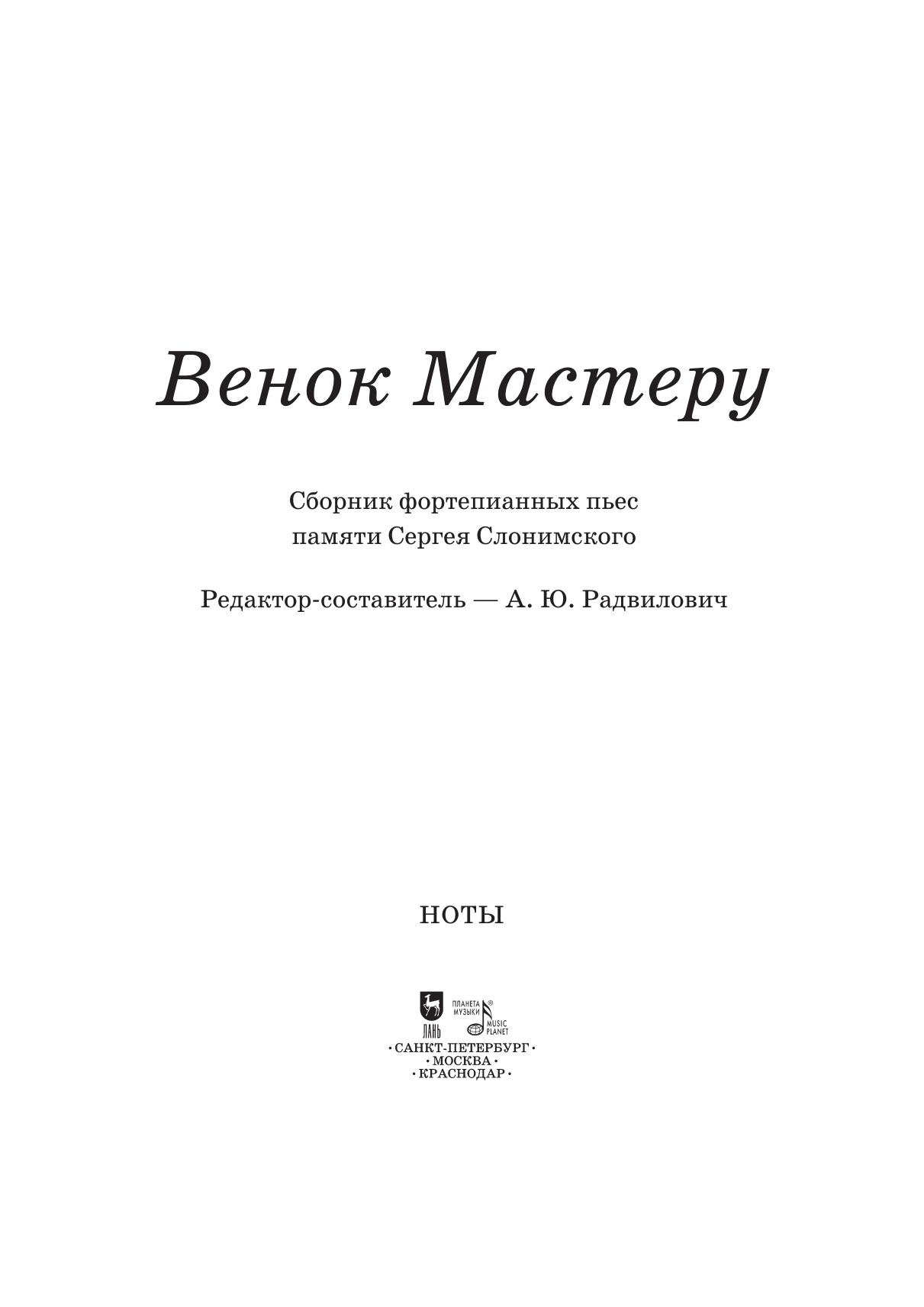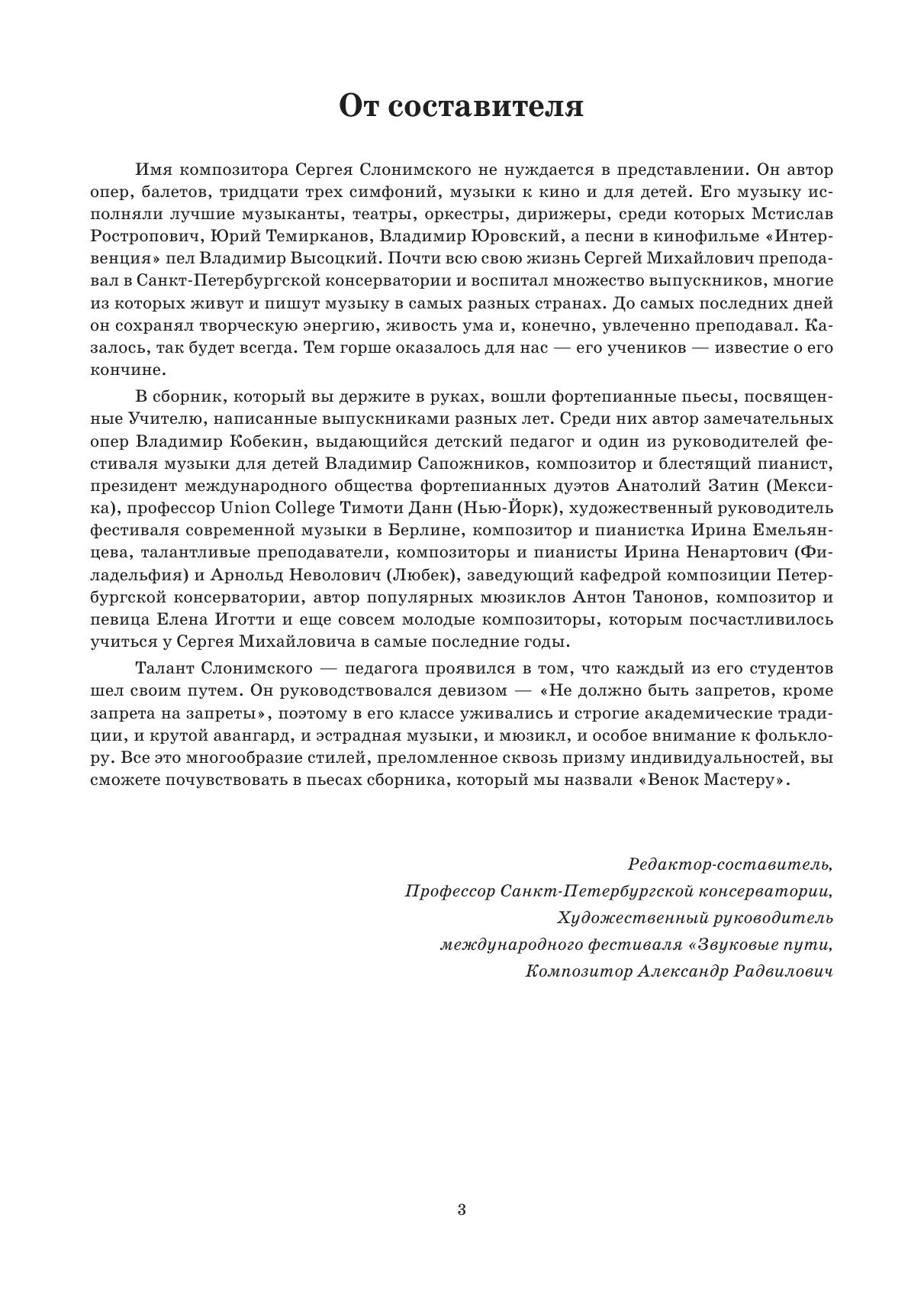 Перед вами сборник фортепианных пьес – приношений выдающемуся русскому композитору Сергею Слонимскому. Их написали выпускники композитора, которые живут и пишут музыку в России и за рубежом. Почти всю свою жизнь Сергей Михайлович преподавал в Санкт-Петербургской консерватории и всегда руководствовался девизом – «Не должно быть запретов, кроме запрета на запреты», поэтому в его классе уживались и строгие академические традиции, и крутой авангард, и эстрадная музыка, и мюзикл, и особое внимание к фольклору. Все это многообразие стилей, преломленное сквозь призму индивидуальностей, вы почувствуете в пьесах сборника, который сейчас держите в руках.