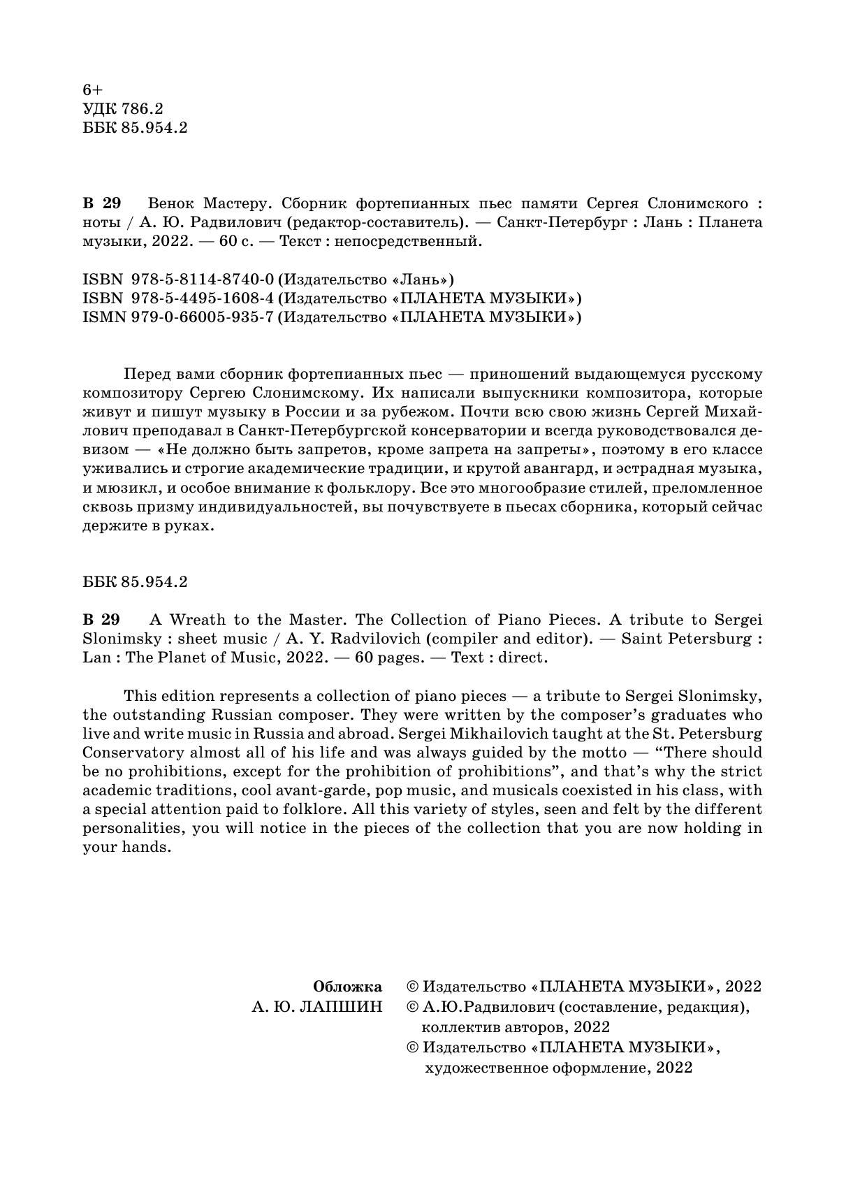 This edition represents a collection of piano pieces— a tribute to Sergei Slonimsky, the outstanding Russian composer. They were written by the composer’s graduates who live and write music in Russia and abroad. Sergei Mikhailovich taught at the St. Petersburg Conservatory almost all of his life and was always guided by the motto — “There should be no prohibitions, except for the prohibition of prohibitions”, and that’s why the strict academic traditions, cool avant-garde, pop music, and musicals coexisted in his class, with a special attention paid to folklore. All this variety of styles, seen and felt by the different personalities, you will notice in the pieces of the collection that you are now holding in your hands.