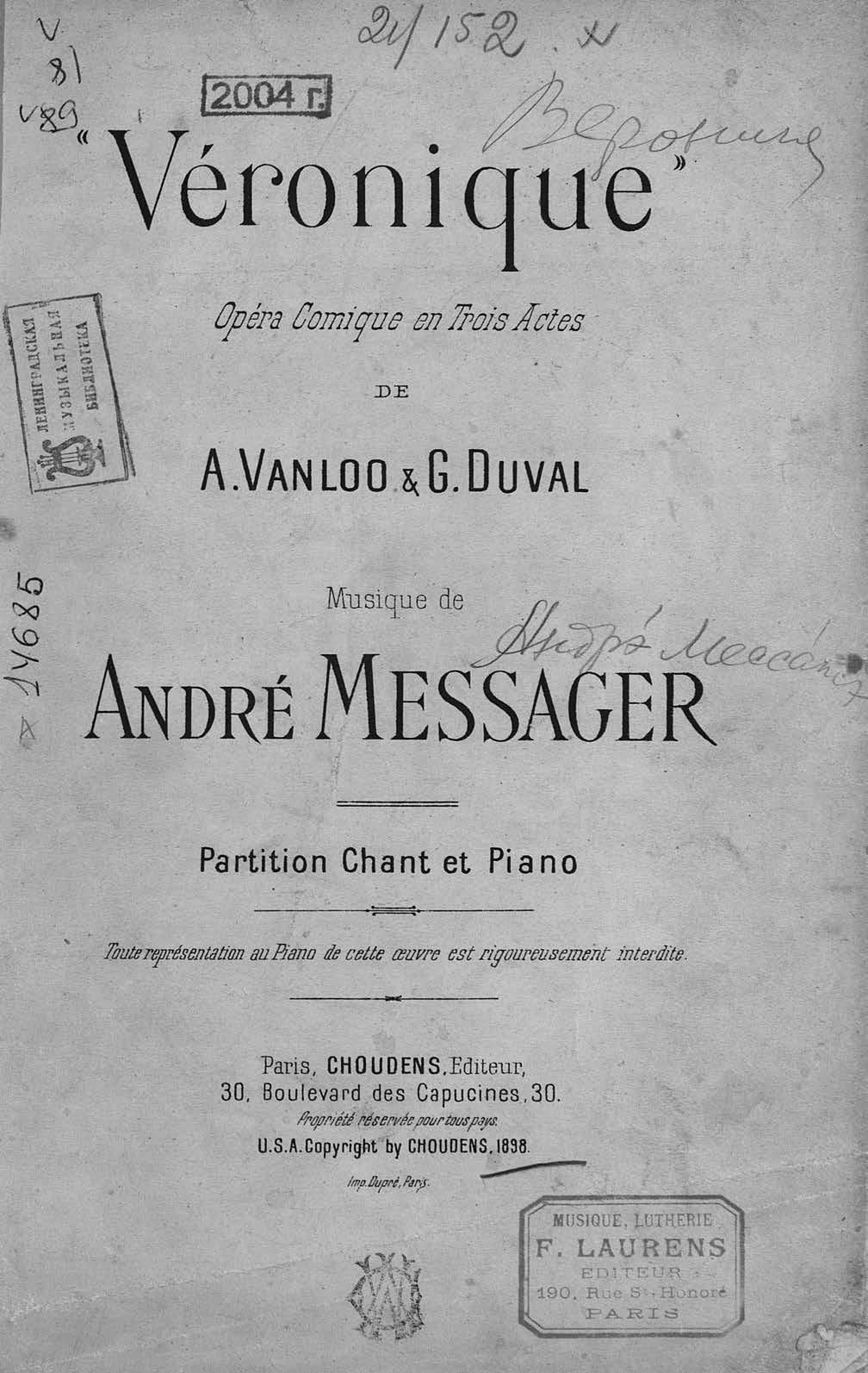 Перешедшие в общественное достояние материалы электронного фонда ЦГПБ им. В.В. Маяковского. Сведения о издательстве или типографии: Choudens (ранее Choudens P?re et Fils). Место издания: Париж