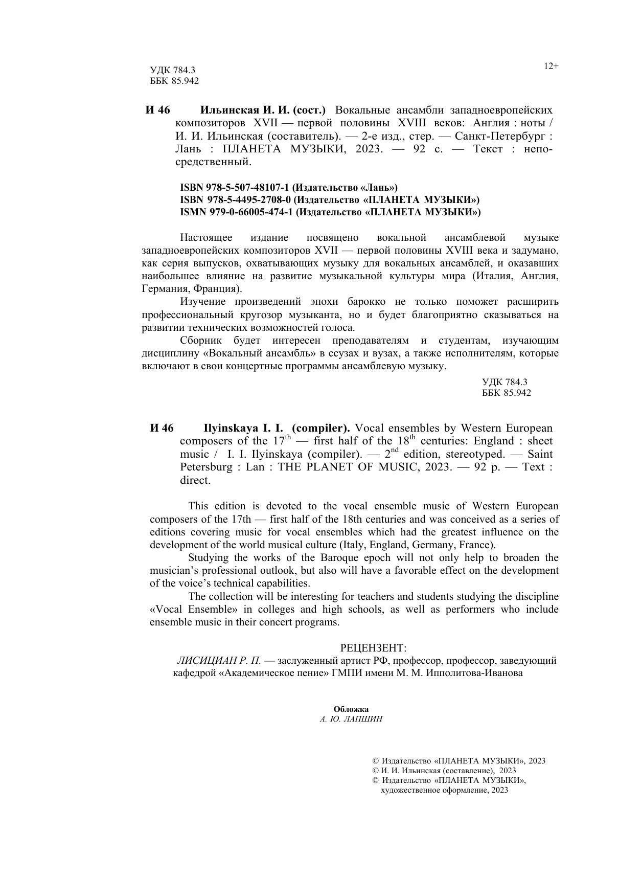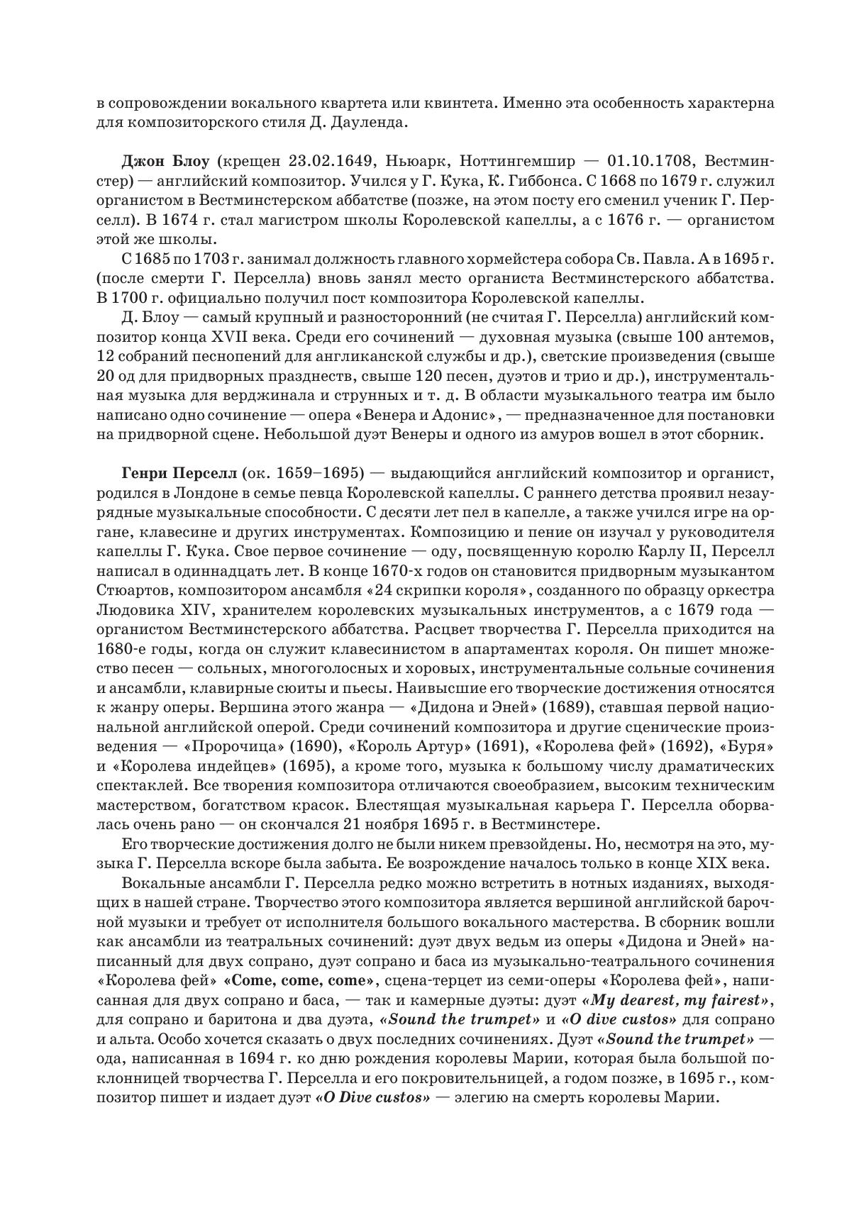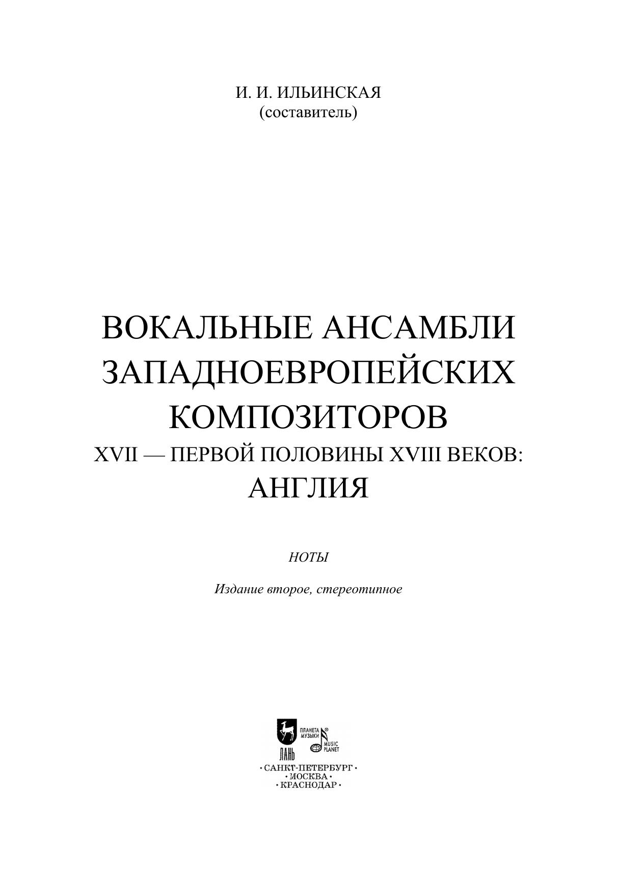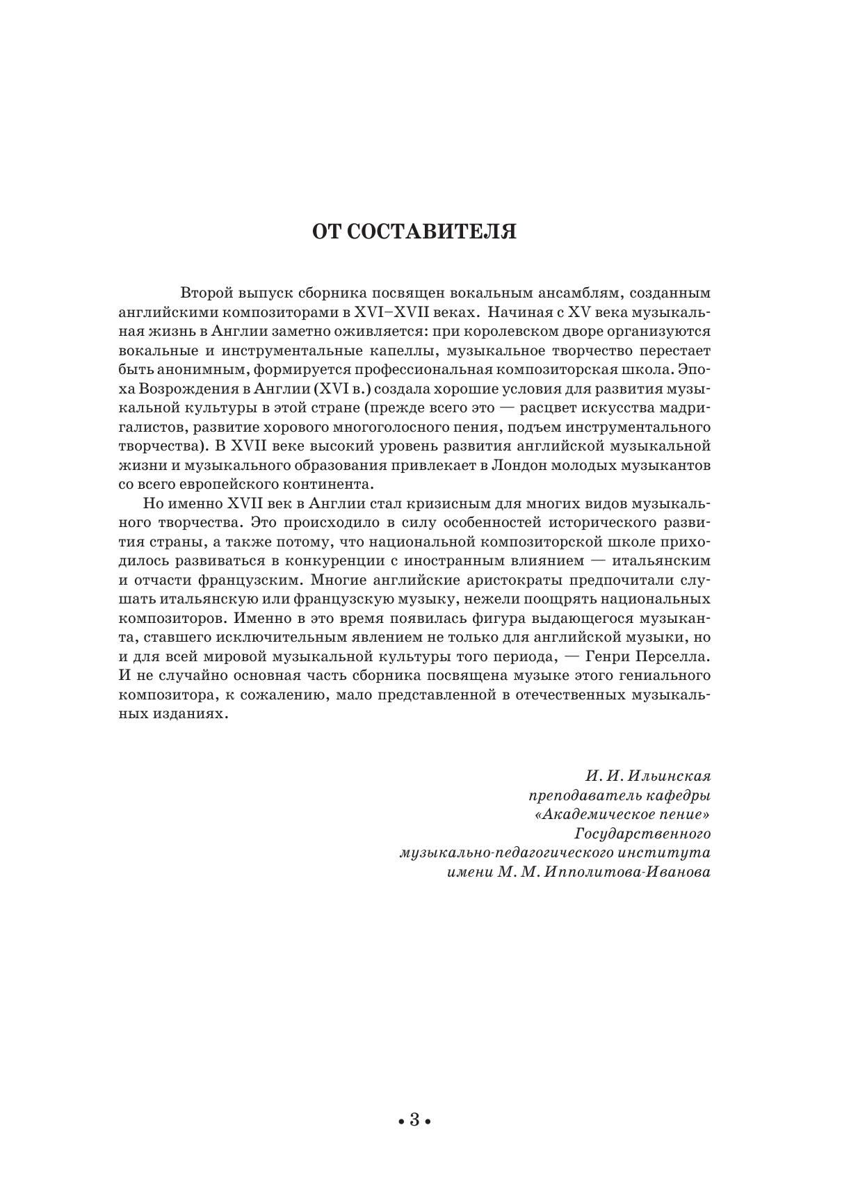 Настоящее издание посвящено вокальной ансамблевой музыке западноевропейских композиторов XVII – первой половины XVIII веков и задумано, как серия выпусков, охватывающих музыку для вокальных ансамблей, созданную в странах Западной Европы, оказавших наибольшее влияние на развитие музыкальной культуры мира (Италия, Англия, Германия, Франция). Изучение произведений эпохи барокко не только поможет расширить профессиональный кругозор музыканта, но и будет благоприятно сказываться на развитии технических возможностей голоса. Сборник будет интересен преподавателям и студентам, изучающим дисциплину «Вокальный ансамбль» в ссузах и вузах, а также исполнителям, которые включают в свои концертные программы ансамблевую музыку. This edition is devoted to the vocal ensemble music of Western European composers of the 17th — first half of the 18th centuries and was conceived as a series of editions covering music for vocal ensembles which had the greatest influence on the development of the world musical culture (Italy, England, Germany, France). Studying the works of the Baroque epoch will not only help to broaden the musician’s professional outlook, but also will have a favorable effect on the development of the voice’s technical capabilities. The collection will be interesting for teachers and students studying the discipline «Vocal Ensemble» in colleges and high schools, as well as performers who include ensemble music in their concert programs.