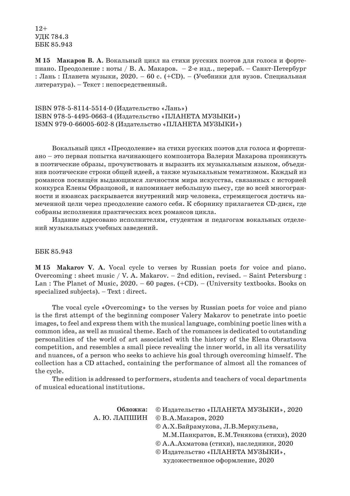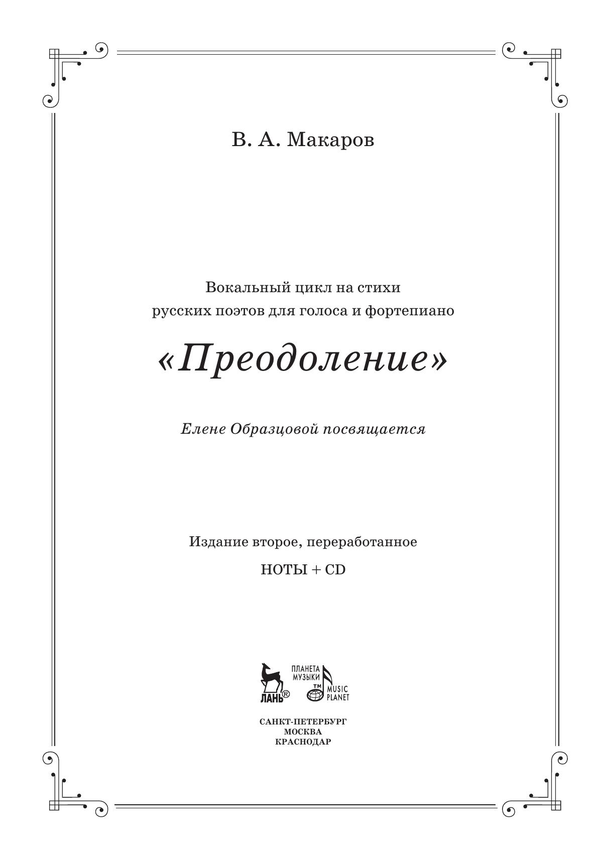 Вокальный цикл «Преодоление» на стихи русских поэтов для голоса и фортепиано - это первая попытка начинающего композитора Валерия Макарова проникнуть в поэтические образы, прочувствовать и выразить их музыкальным языком, объединив поэтические строки общей идеей, а также музыкальным тематизмом. Каждый из романсов посвящён выдающимся личностям мира искусства, связанных с историей конкурса Елены Образцовой, и напоминает небольшую пьесу, где во всей многогранности и нюансах раскрывается внутренний мир человека, стремящегося достичь намеченной цели через преодоление самого себя.