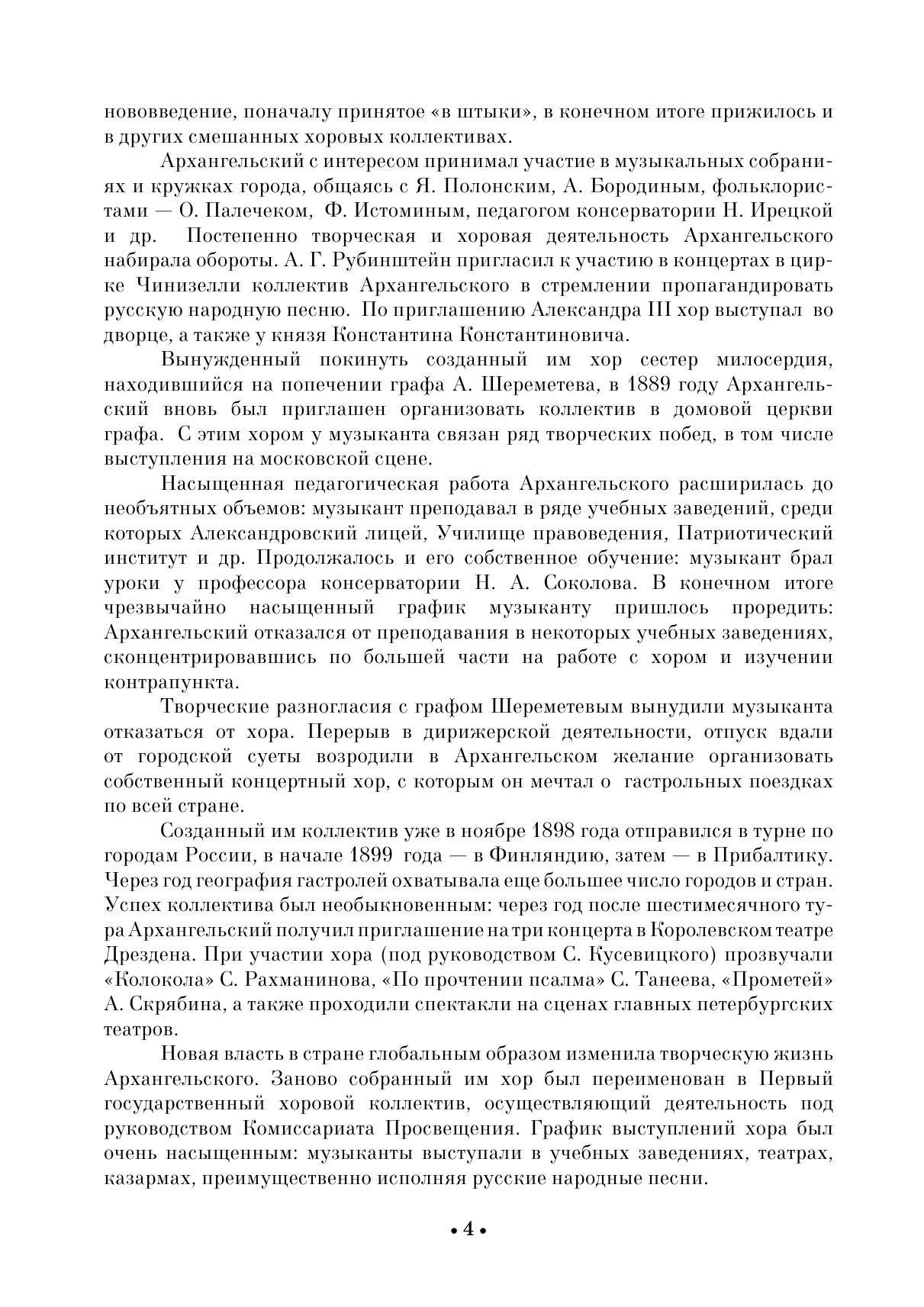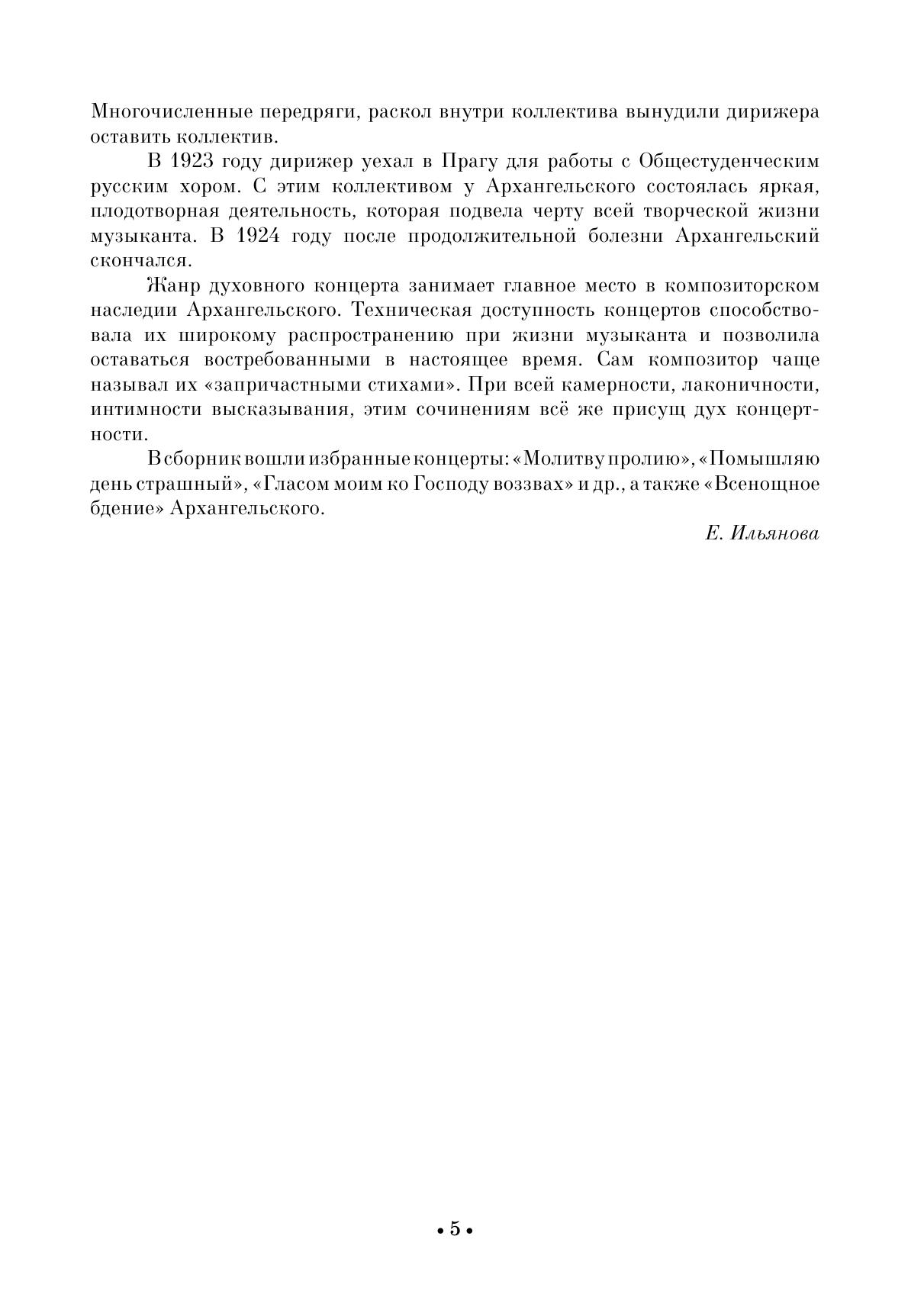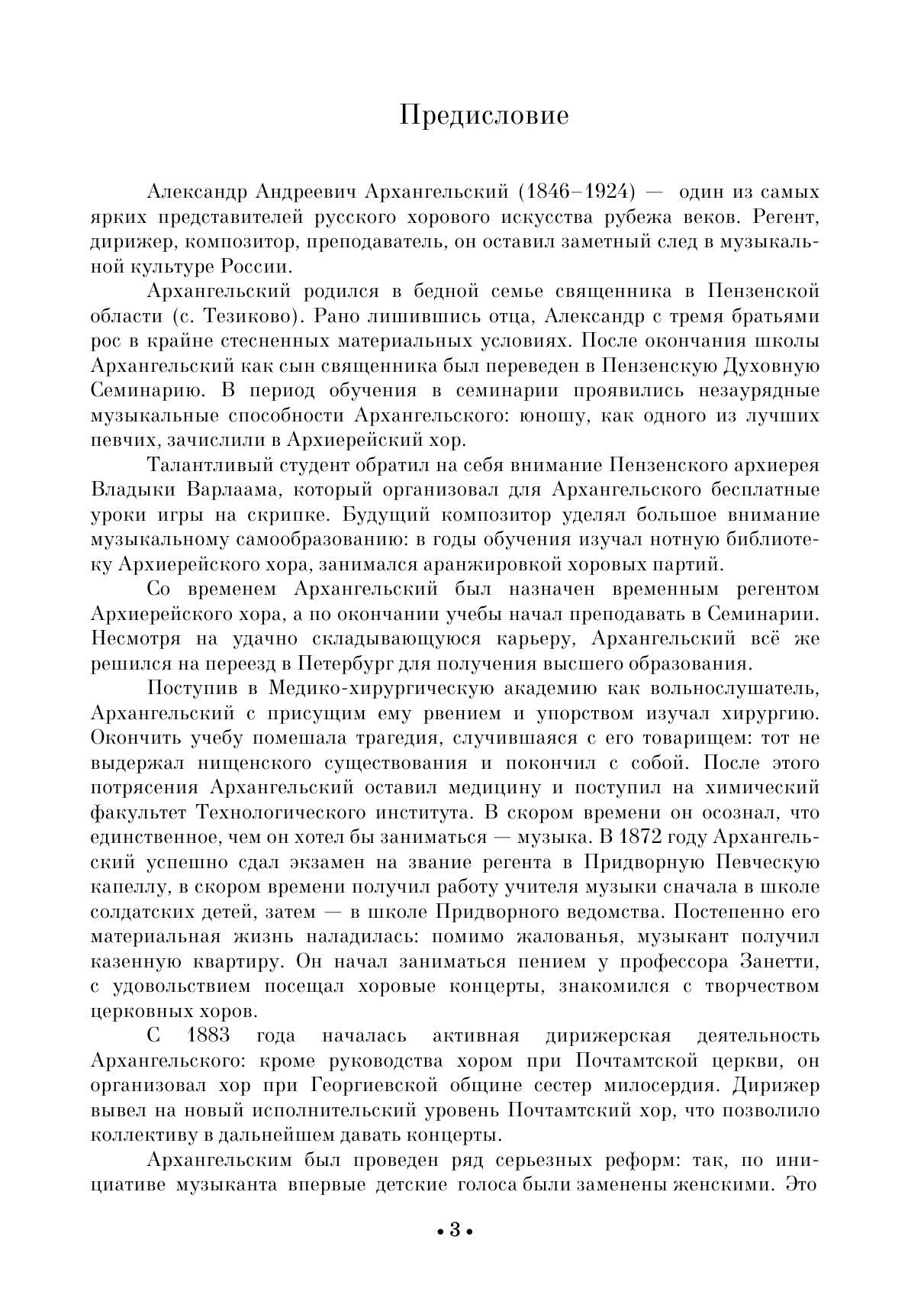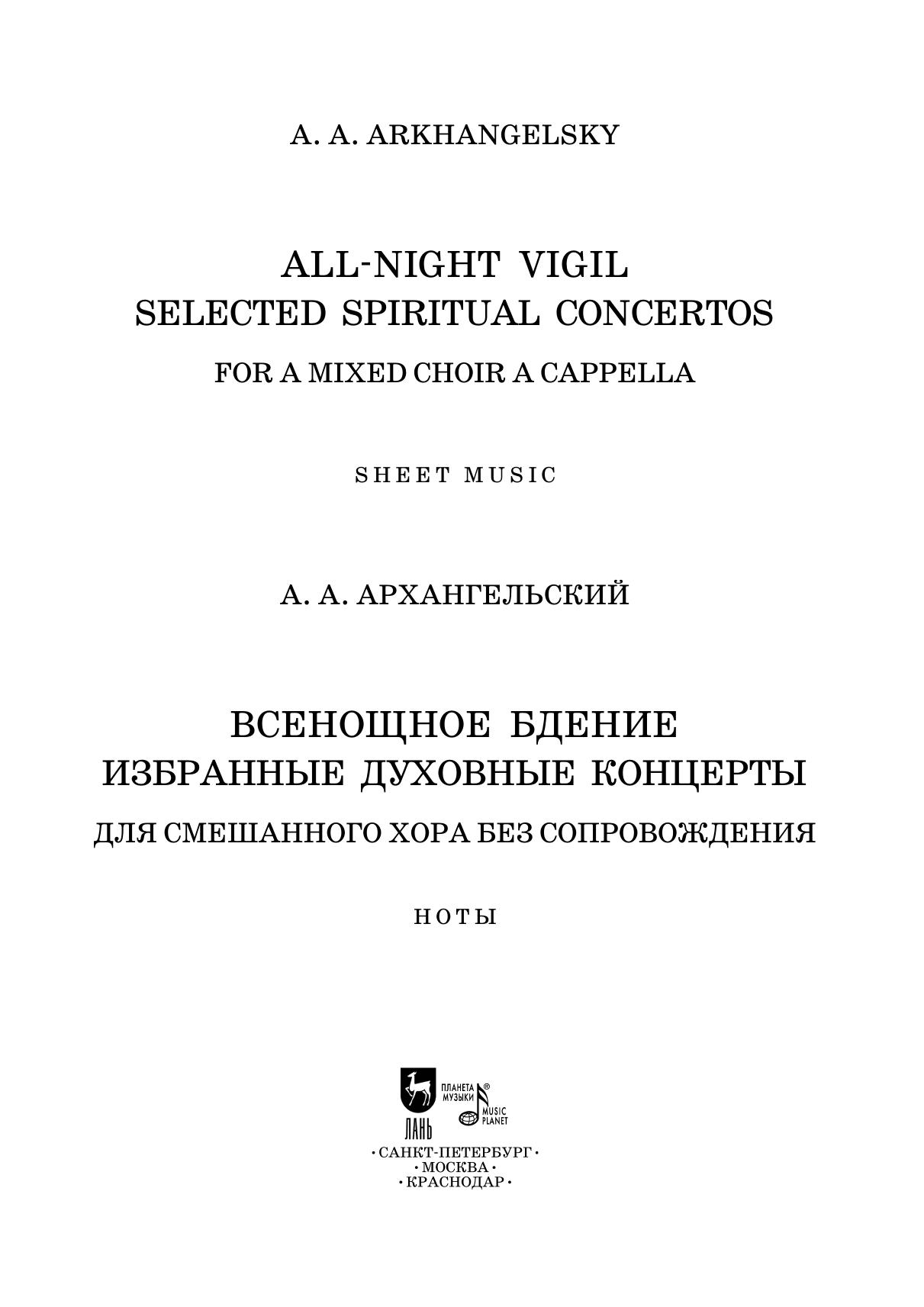 Alexander Andreevich Arkhangelsky (1846–1924) is one of the most prominent representatives of Russian choral art at the turn of the centuries. Regent, conductor, composer, teacher, he made a significant contribution in the musical culture of Russia. The technical level of concertos made it possible to be widely performed by their contemporaries. The composer himself often called them "Sacramental verses." Arkhangelsky wrote two All-night Vigils. The first one is a transcription of Greek, Kievan and Znamenny chants. The second one, included in this collection, is a author’s free composition.