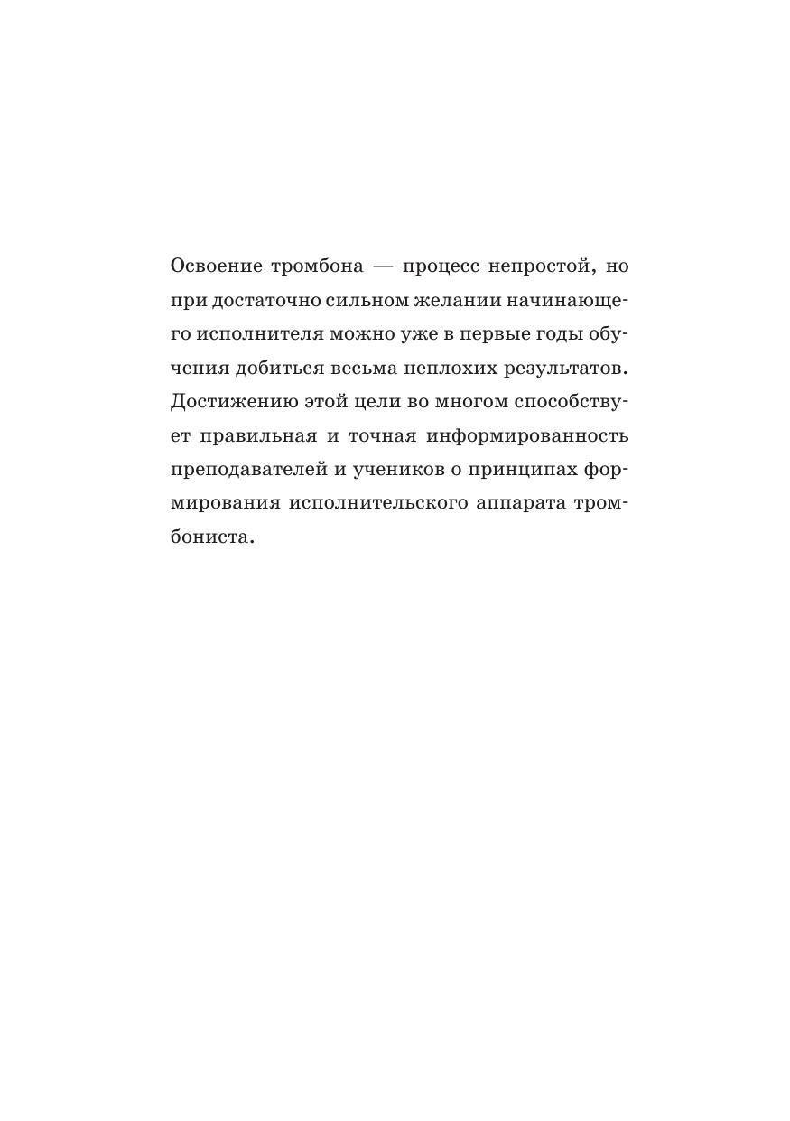 Настоящее учебное пособие включает в себя описание основных этапов освоения тромбона, в том числе подготовительного (обучение игре на эуфониуме, баритоне или теноре). Также в книге рассмотрены способы предотвращения и решения специфических проблем духовиков, представлены основные особенности работы в ансамблях и оркестрах, подробно описаны критерии выбора инструмента и мундштука, а также даны рекомендации по уходу за инструментом. Данная работа подойдет как в качестве учебно-методической базы для начинающих и профессиональных тромбонистов, так и для преподавателей по классу тромбона.