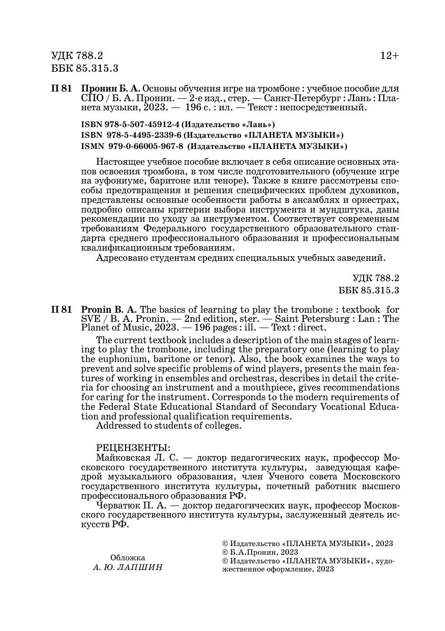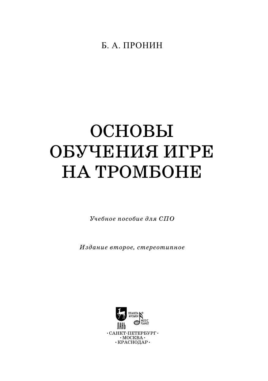 Настоящее учебное пособие включает в себя описание основных этапов освоения тромбона, в том числе подготовительного (обучение игре на эуфониуме, баритоне или теноре). Также в книге рассмотрены способы предотвращения и решения специфических проблем духовиков, представлены основные особенности работы в ансамблях и оркестрах, подробно описаны критерии выбора инструмента и мундштука, даны рекомендации по уходу за инструментом. Соответствует современным требованиям Федерального государственного образовательного стандарта среднего профессионального образования и профессиональным квалификационным требованиям.