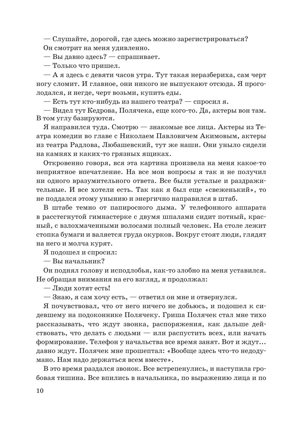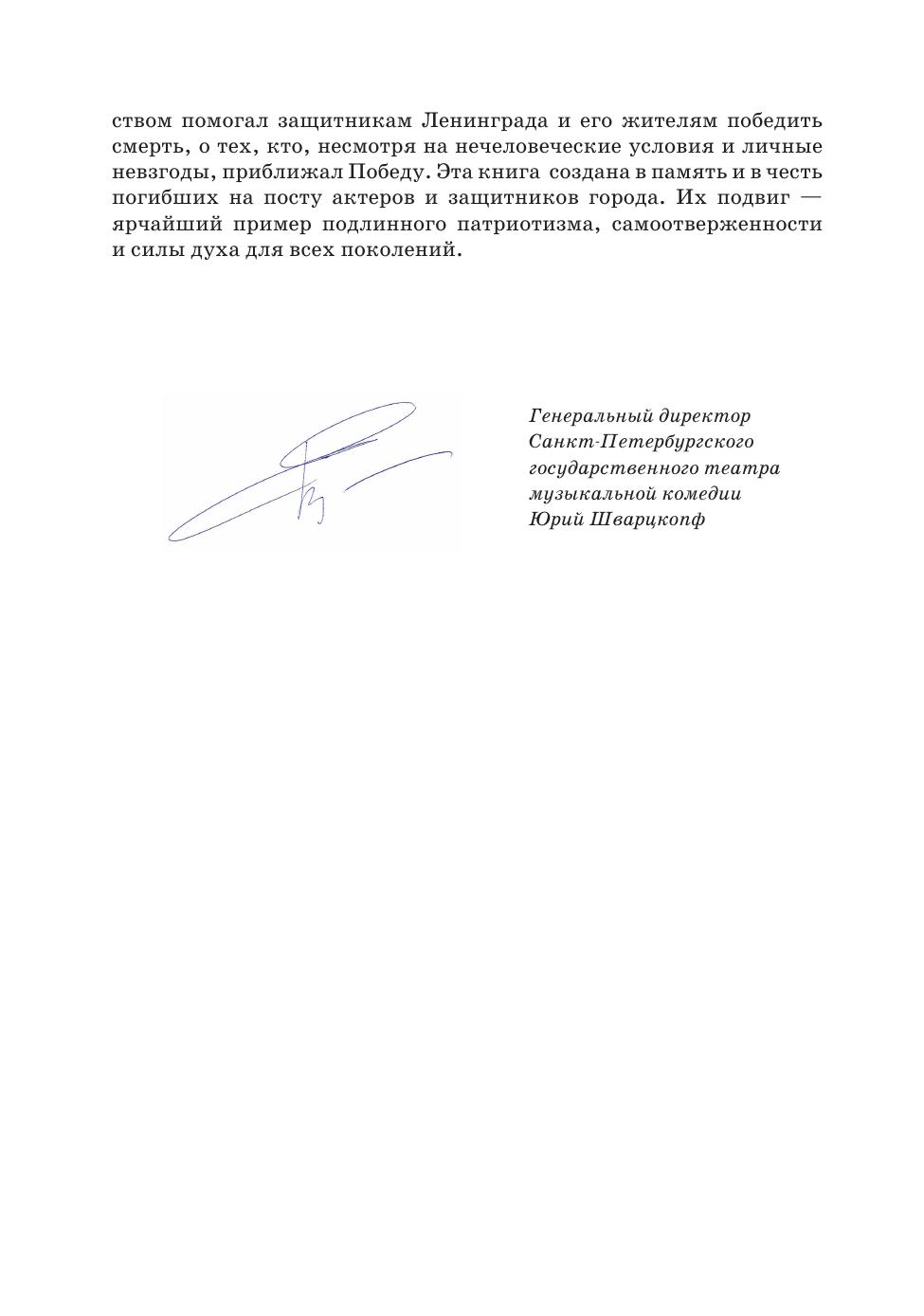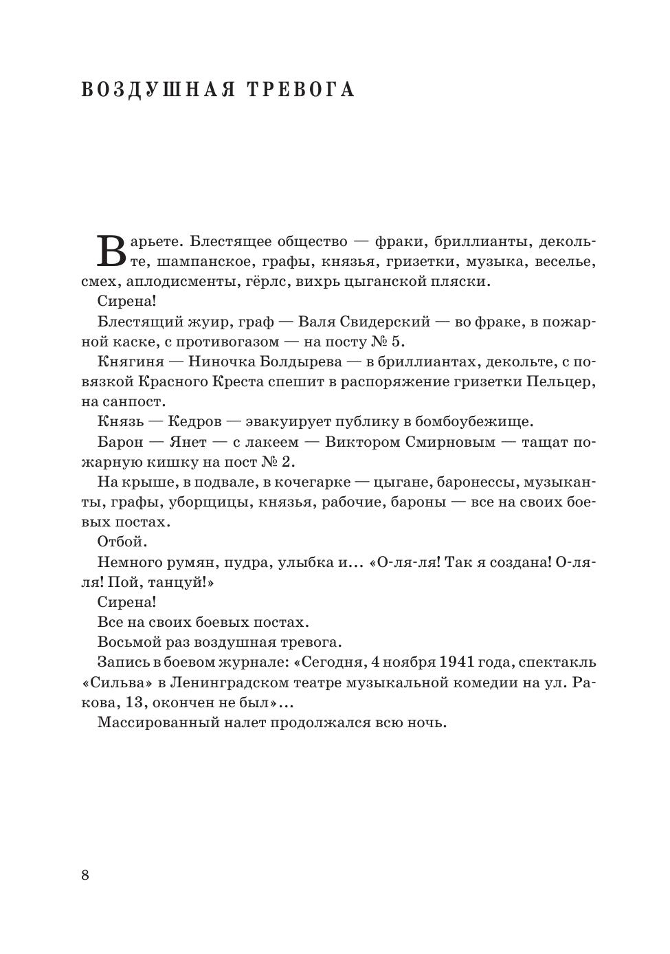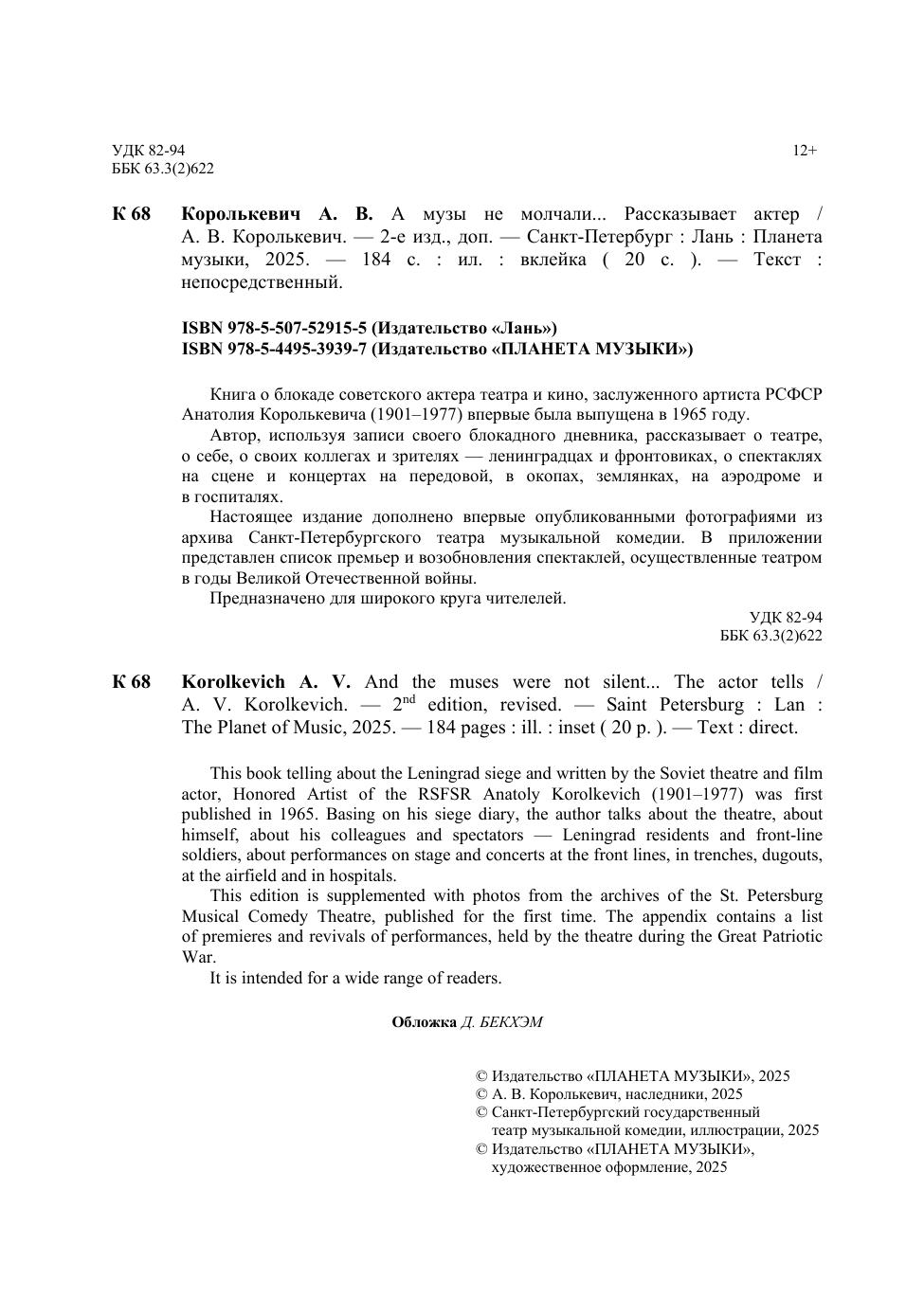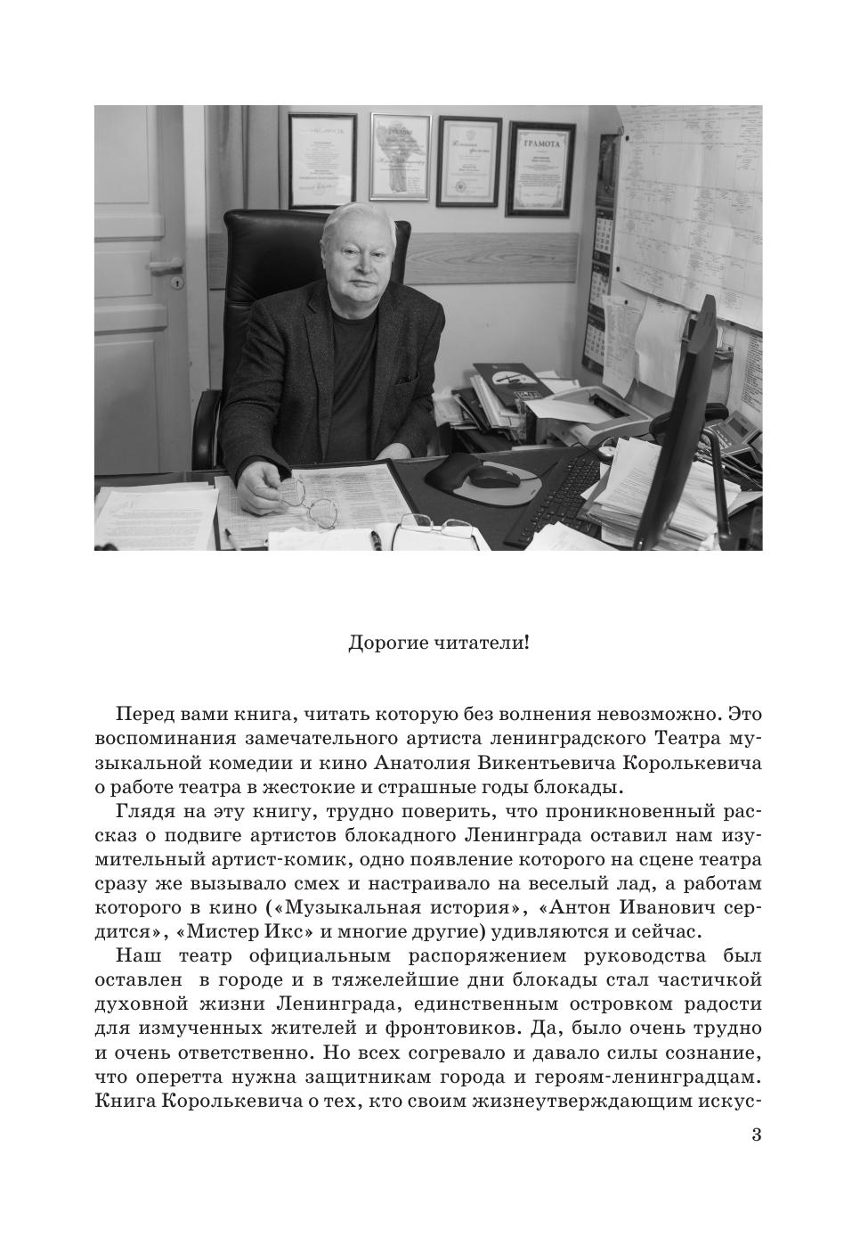 Книга о блокаде советского актёра театра и кино, заслуженного артиста РСФСР Анатолия Королькевича (1901–1977) впервые была выпущена в 1965 году. Автор, используя записи своего блокадного дневника, рассказывает о театре, о себе, о своих коллегах и зрителях — ленинградцах и фронтовиках, о спектаклях на сцене и концертах на передовой, в окопах, землянках, на аэродроме и в госпиталях. Настоящее издание дополнено впервые опубликованными фотографиями из архива Санкт-Петербургского театра музыкальной комедии. В приложении представлен список премьер и возобновления спектаклей, осуществленные театром в годы Великой Отечественной Войны. Предназначено для широкого круга читалелей. This book telling about the Leningrad siege and written by the Soviet theatre and film actor, Honored Artist of the RSFSR Anatoly Korolkevich (1901–1977) was first published in 1965. Basing on his siege diary, the author talks about the theatre, about himself, about his colleagues and spectators — Leningrad residents and front-line soldiers, about performances on stage and concerts at the front lines, in trenches, dugouts, at the airfield and in hospitals. This edition is supplemented with photos from the archives of the St. Petersburg Musical Comedy Theatre, published for the first time. The appendix contains a list of premieres and revivals of performances, held by the theatre during the Great Patriotic War. It is intended for a wide range of readers.