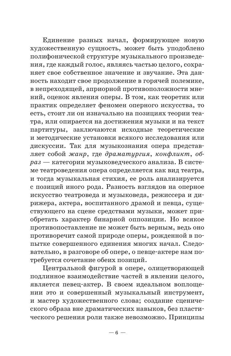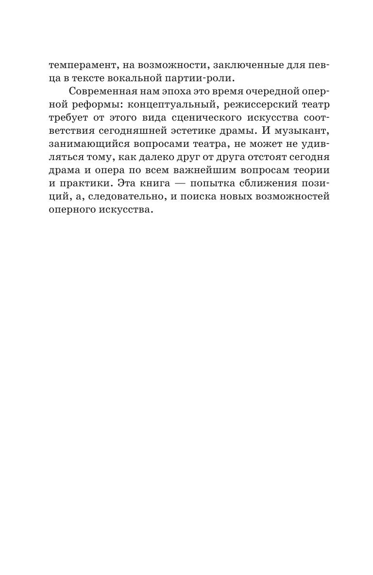 Современная нам эпоха это время очередной оперной реформы: концептуальный, режиссёрский театр требует от этого вида сценического искусства соответствия сегодняшней эстетике драмы. И музыкант, занимающийся вопросами театра, не может не удивляться тому, как далеко друг от друга отстают сегодня драма и опера по всем важнейшим вопросам теории и практики. Эта книга—попытка сближения позиций, а, следовательно, и поиска новых возможностей оперного искусства.