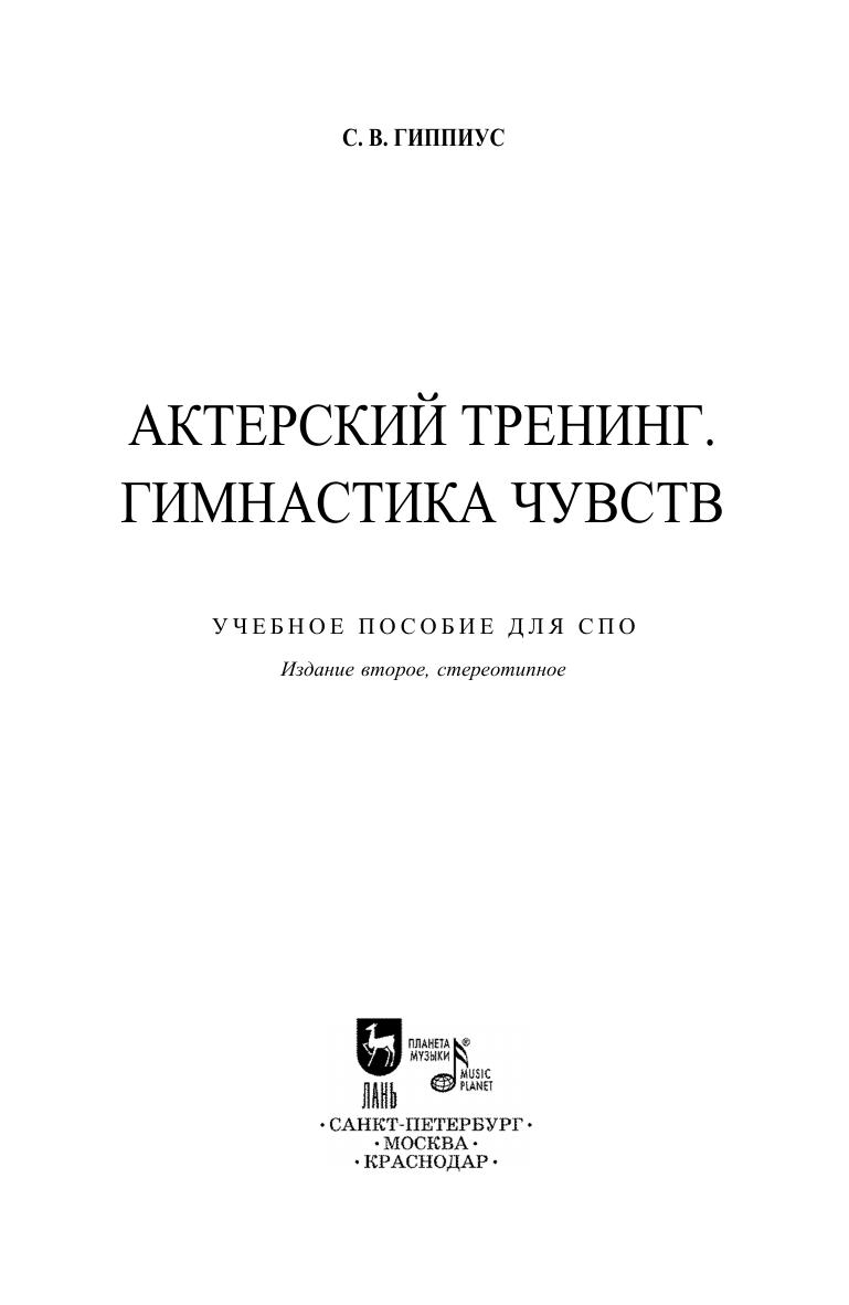 Cергей Гиппиус,1924–1981 – театральный педагог, режиссер. Книга Гимнастика чувств, впервые увидевшая свет в 1967 году, суммировала многолетний преподавательский опыт автора, одного из ведущих теоретиков и практиков актерского мастерства. Книга включает 400 упражнений на развитие актерской техники, ясно сформулированных и систематизированных. Соответствует современным требованиям Федерального государственного образовательного стандарта среднего профессионального образования и профессиональным квалификационным требованиям. Книга адресована студентам и педагогам средних специальных учебных заведений. Sergey Gippius, 1924-1981 was a theater teacher and director. The book Gymnastics of feelings, first published in 1967, summarized long-term teaching experience of the author, one of the leading theorists and practitioners of acting. The book includes 400 exercises on the development of the technique of acting, which are clearly defined and systematized. Corresponds to the modern requirements of the Federal State Educational Standard of Secondary Vocational Education and professional qualification requirements. The book is addressed to students and teachers of colleges.