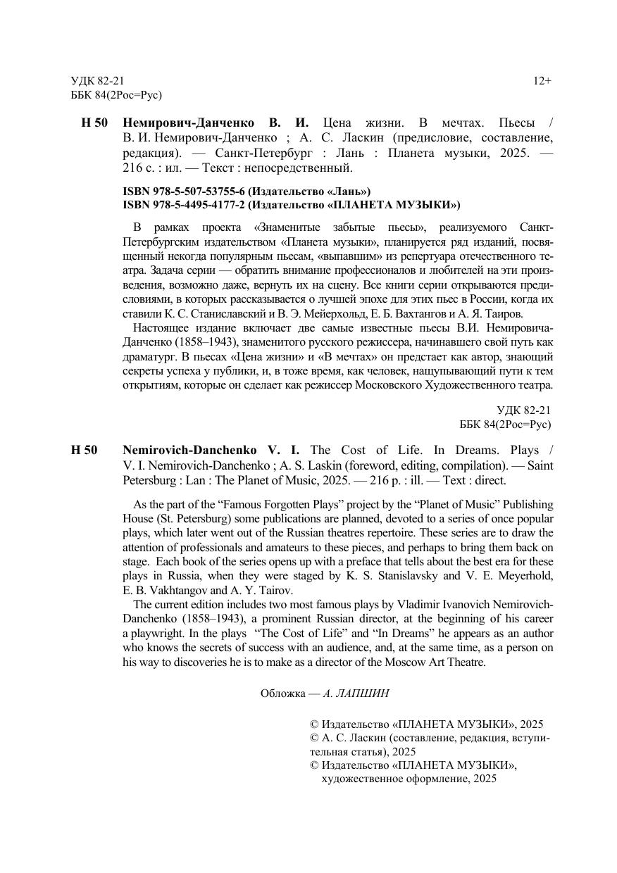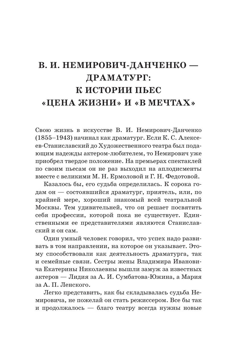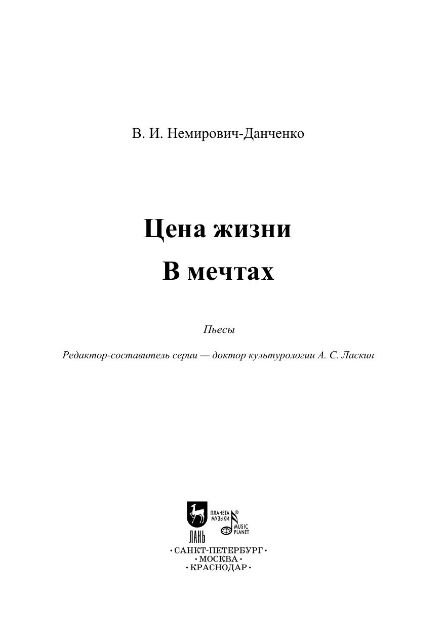 В рамках проекта «Знаменитые забытые пьесы», реализуемого Санкт-Петербургским издательством «Планета музыки», планируется ряд изданий, посвященный некогда популярным пьесам, «выпавшим» из репертуара отечественного театра. Задача серии — обратить внимание профессионалов и любителей на эти произведения, возможно даже, вернуть их на сцену. Все книги серии открываются предисловиями, в которых рассказывается о лучшей эпохе для этих пьес в России, когда их ставили К. С. Станиславский и В. Э. Мейерхольд, Е. Б. Вахтангов и А. Я. Таиров. Настоящее издание включает две самые известные пьесы В.И. Немировича-Данченко (1858–1943), знаменитого русского режиссера, начинавшего свой путь как драматург. В пьесах «Цена жизни» и «В мечтах» он предстает как автор, знающий секреты успеха у публики, и, в тоже время, как человек, нащупывающий пути к тем открытиям, которые он сделает как режиссер Московского Художественного театра. As the part of the “Famous Forgotten Plays” project by the “Planet of Music” Publishing House (St. Petersburg) some publications are planned, devoted to a series of once popular plays, which later went out of the Russian theatres repertoire. These series are to draw the attention of professionals and amateurs to these pieces, and perhaps to bring them back on stage. Each book of the series opens up with a preface that tells about the best era for these plays in Russia, when they were staged by K. S. Stanislavsky and V. E. Meyerhold, E. B. Vakhtangov and A. Y. Tairov. The current edition includes two most famous plays by Vladimir Ivanovich Nemirovich-Danchenko (1858–1943), a prominent Russian director, at the beginning of his career a playwright. In the plays “The Cost of Life” and “In Dreams” he appears as an author who knows the secrets of success with an audience, and, at the same time, as a person on his way to discoveries he is to make as a director of the Moscow Art Theatre.