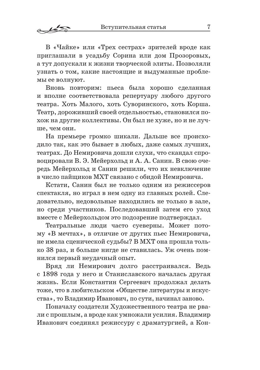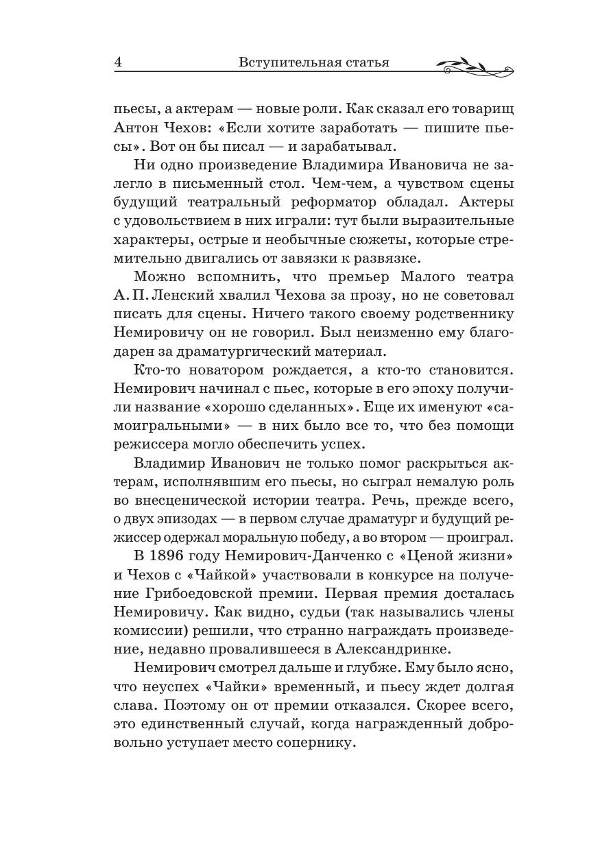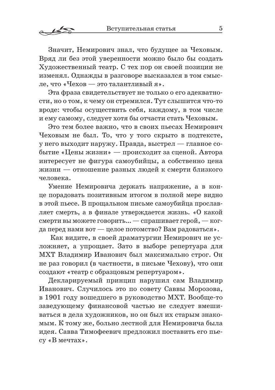 В рамках проекта «Знаменитые забытые пьесы», реализуемого Санкт-Петербургским издательством «Планета музыки», планируется ряд изданий, посвященный некогда популярным пьесам, «выпавшим» из репертуара отечественного театра. Задача серии — обратить внимание профессионалов и любителей на эти произведения, возможно даже, вернуть их на сцену. Все книги серии открываются предисловиями, в которых рассказывается о лучшей эпохе для этих пьес в России, когда их ставили К. С. Станиславский и В. Э. Мейерхольд, Е. Б. Вахтангов и А. Я. Таиров. Настоящее издание включает две самые известные пьесы В.И. Немировича-Данченко (1858–1943), знаменитого русского режиссера, начинавшего свой путь как драматург. В пьесах «Цена жизни» и «В мечтах» он предстает как автор, знающий секреты успеха у публики, и, в тоже время, как человек, нащупывающий пути к тем открытиям, которые он сделает как режиссер Московского Художественного театра. As the part of the “Famous Forgotten Plays” project by the “Planet of Music” Publishing House (St. Petersburg) some publications are planned, devoted to a series of once popular plays, which later went out of the Russian theatres repertoire. These series are to draw the attention of professionals and amateurs to these pieces, and perhaps to bring them back on stage. Each book of the series opens up with a preface that tells about the best era for these plays in Russia, when they were staged by K. S. Stanislavsky and V. E. Meyerhold, E. B. Vakhtangov and A. Y. Tairov. The current edition includes two most famous plays by Vladimir Ivanovich Nemirovich-Danchenko (1858–1943), a prominent Russian director, at the beginning of his career a playwright. In the plays “The Cost of Life” and “In Dreams” he appears as an author who knows the secrets of success with an audience, and, at the same time, as a person on his way to discoveries he is to make as a director of the Moscow Art Theatre.
