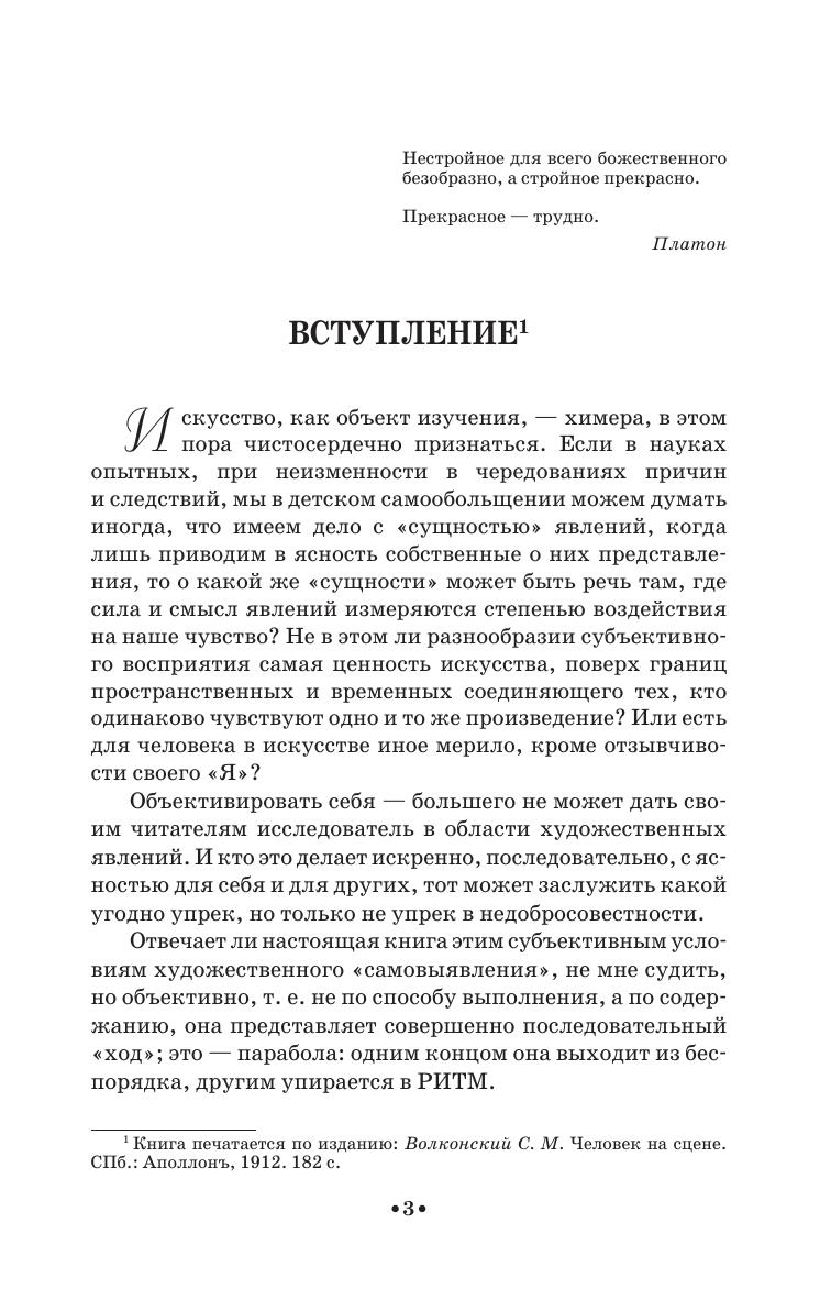С. М. Волконский (1860–1937) — выдающийся российский театральный деятель, режиссер, искусствовед, критик. Его книга «Человек на сцене» посвящена исследованию проблемы сценического существования актера. Автор рассматривает вопросы актерской техники, выразительности жеста и голоса; рассуждает о соотношении красоты и правды в изображении героев и событий на сцене, а также о человеке как «материале» искусства; исследует систему и школу ритмической гимнастики Далькроза; описывает собственные впечатления от театральных постановок на московской и берлинской сцене; затрагивает вопросы художественного воспитания личности.