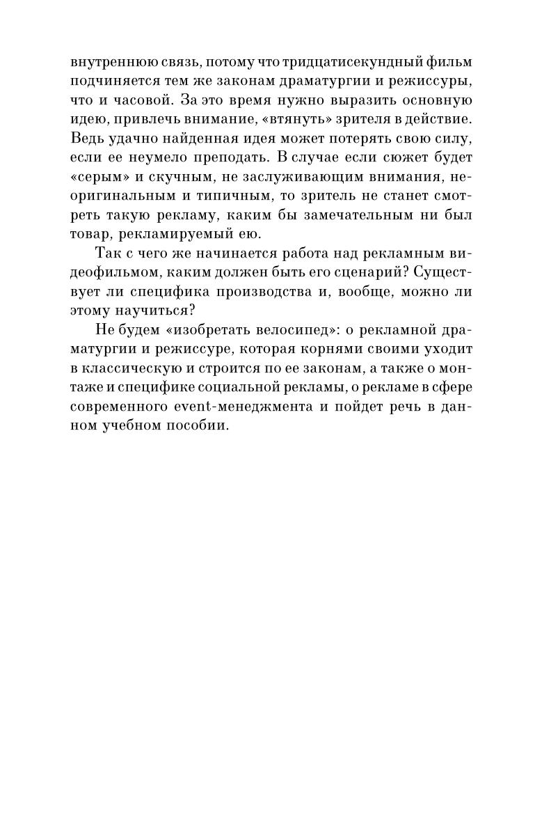 Настоящая книга создана на основе многолетнего преподавательского и творческого опыта автора, анализа многих последних публикаций в области творческих изысканий рекламного видео и PR. В основе – учение о рекламной драматургии и режиссуре, которое своими корнями уходит в классическую и строится по её законам. Также в учебном пособии идет речь о монтаже и специфике социальной видеорекламы, о рекламе в сфере современного event-менеджмента.