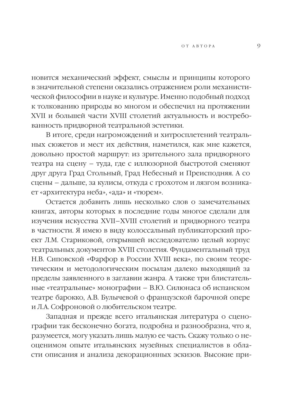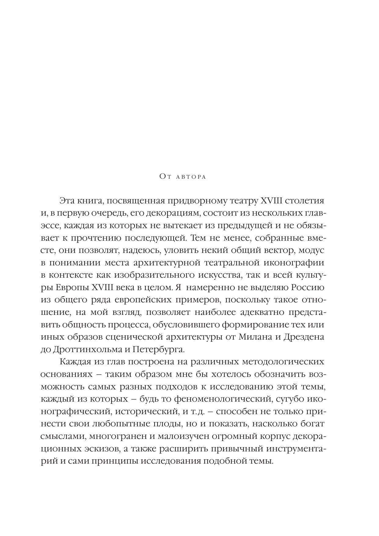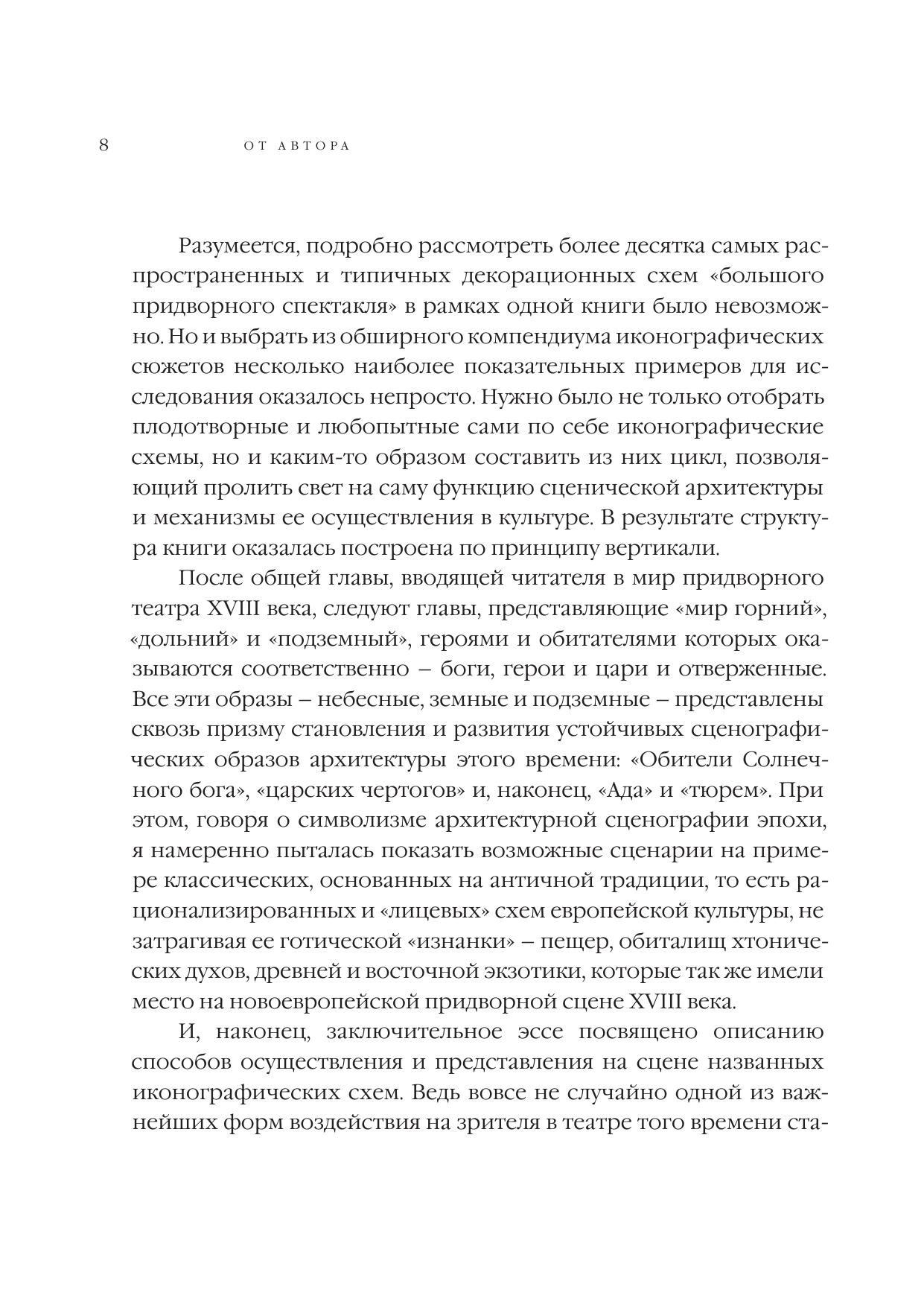 Эта книга, посвященная придворному театру барокко и Просвещения и его декорациям, состоит из нескольких глав-эссе. Прослеживая в них судьбу классических иконографических схем и популярных сюжетов на протяжении двух столетий, автор рассматривает возникновение и постепенное ослабление символической функции иллюзорной театральной архитектуры, как формы репрезентации монаршей власти. На конкретных примерах десятков декорационных эскизов и выполненных по их следам гравюр, запечатлевших сценическую архитектуру множества "Орфеев", "Психей", "Дидон" и других театральных коллизий XVII-XVIII веков, отчетливо проявляется значение основных мотивов архитектурной сценографии. При этом, метаморфозы придворной сцены исследуются сквозь призму политических и философских аллюзий, художественных тенденций эпохи, а также взглядов и мироощущения современников.