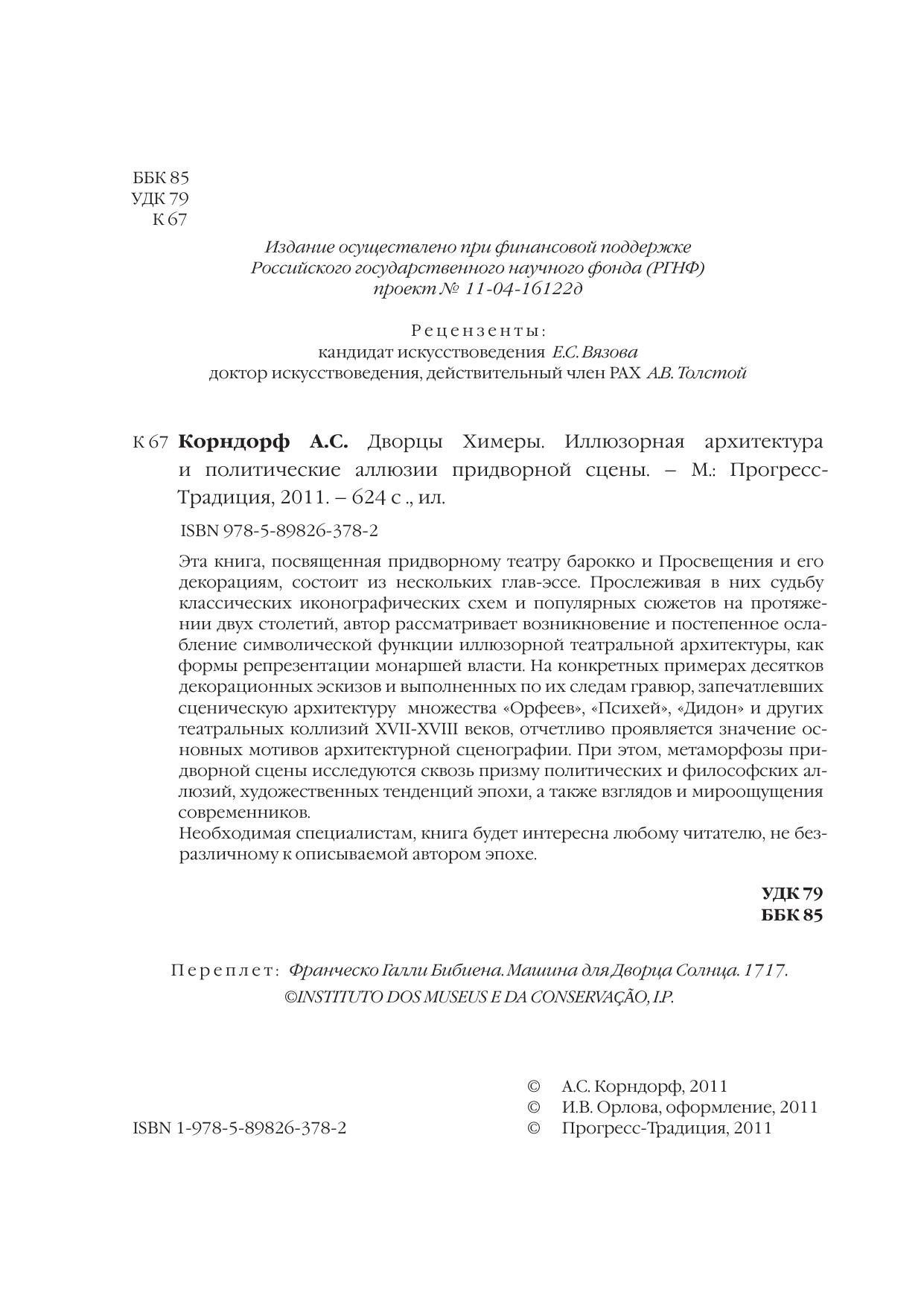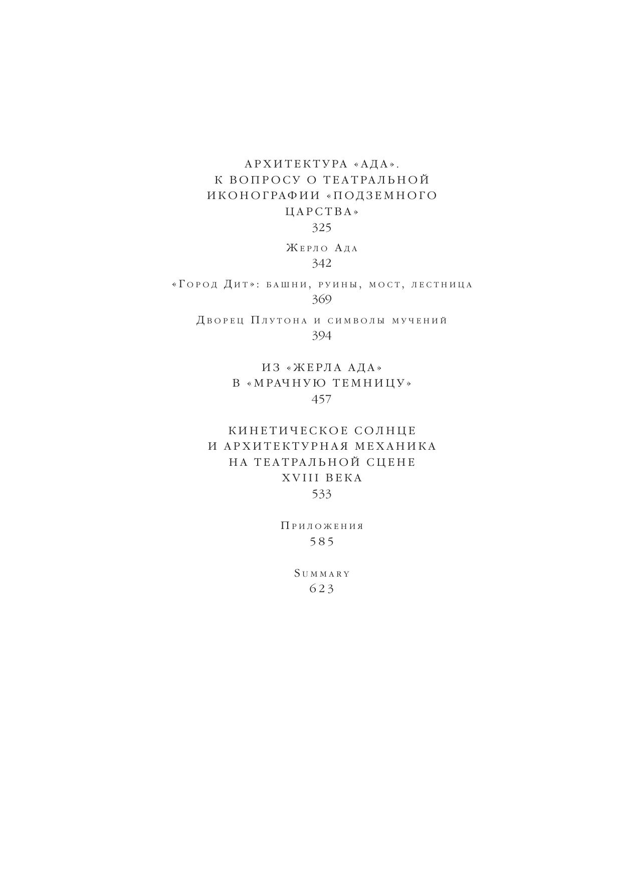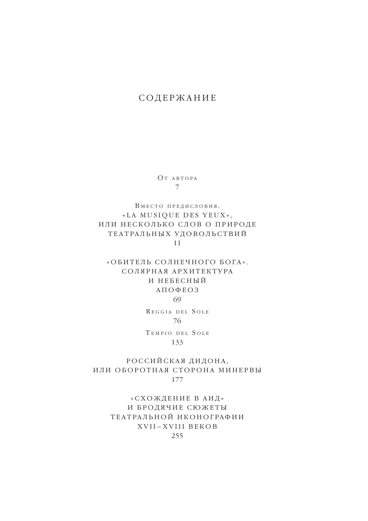 Эта книга, посвященная придворному театру барокко и Просвещения и его декорациям, состоит из нескольких глав-эссе. Прослеживая в них судьбу классических иконографических схем и популярных сюжетов на протяжении двух столетий, автор рассматривает возникновение и постепенное ослабление символической функции иллюзорной театральной архитектуры, как формы репрезентации монаршей власти. На конкретных примерах десятков декорационных эскизов и выполненных по их следам гравюр, запечатлевших сценическую архитектуру множества "Орфеев", "Психей", "Дидон" и других театральных коллизий XVII-XVIII веков, отчетливо проявляется значение основных мотивов архитектурной сценографии. При этом, метаморфозы придворной сцены исследуются сквозь призму политических и философских аллюзий, художественных тенденций эпохи, а также взглядов и мироощущения современников.
