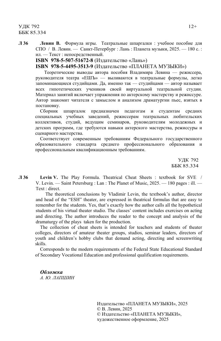 Теоретические выводы автора пособия Владимира Левина — режиссера, руководителя театра «ЕШЪ» — выливаются в театральные формулы, легко запоминающиеся студийцами. Да, именно так — студийцами — автор называет всех гипотетических учеников своей виртуальной театральной студии. Материал занятий включает упражнения по актерскому мастерству и режиссуре. Автор знакомит читателя с замыслом и анализом драматургии пьес, взятых в постановку. Сборник шпаргалок предназначен педагогам и студентам средних специальных учебных заведений, режиссерам театральных любительских коллективов, студий, ведущим семинаров, руководителям молодежных и детских программ, где требуются навыки актерского мастерства, режиссуры и сценарного мастерства. Соответствует современным требованиям Федерального государственного образовательного стандарта среднего профессионального образования и профессиональным квалификационным требованиям. The theoretical conclusions by Vladimir Levin, the textbook’s author, director and head of the “ESH” theater, are expressed in theatrical formulas that are easy to remember for the students. Yes, that’s exactly how the author calls all the hypothetical students of his virtual theatеr studio. The classes’ content includes exercises on acting and directing. The author introduces the reader to the concept and analysis of the dramaturgy of the plays taken for the production. The collection of cheat sheets is intended for teachers and students of theater colleges, directors of amateur theatеr groups, studios, seminar leaders, directors of youth and children’s hobby clubs that demand acting, directing and screenwriting skills. Corresponds to the modern requirements of the Federal State Educational Standard of Secondary Vocational Education and professional qualification requirements.