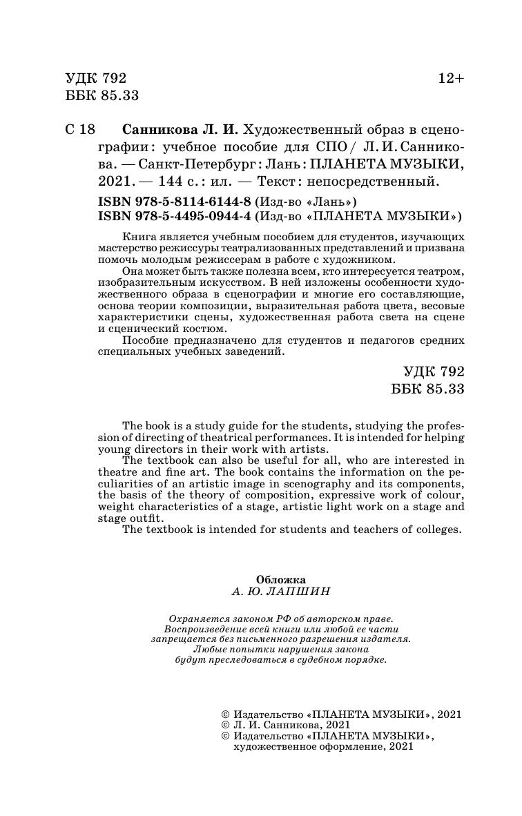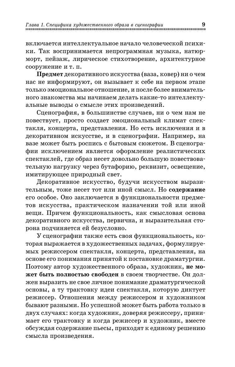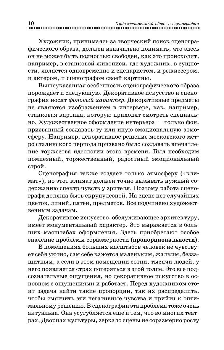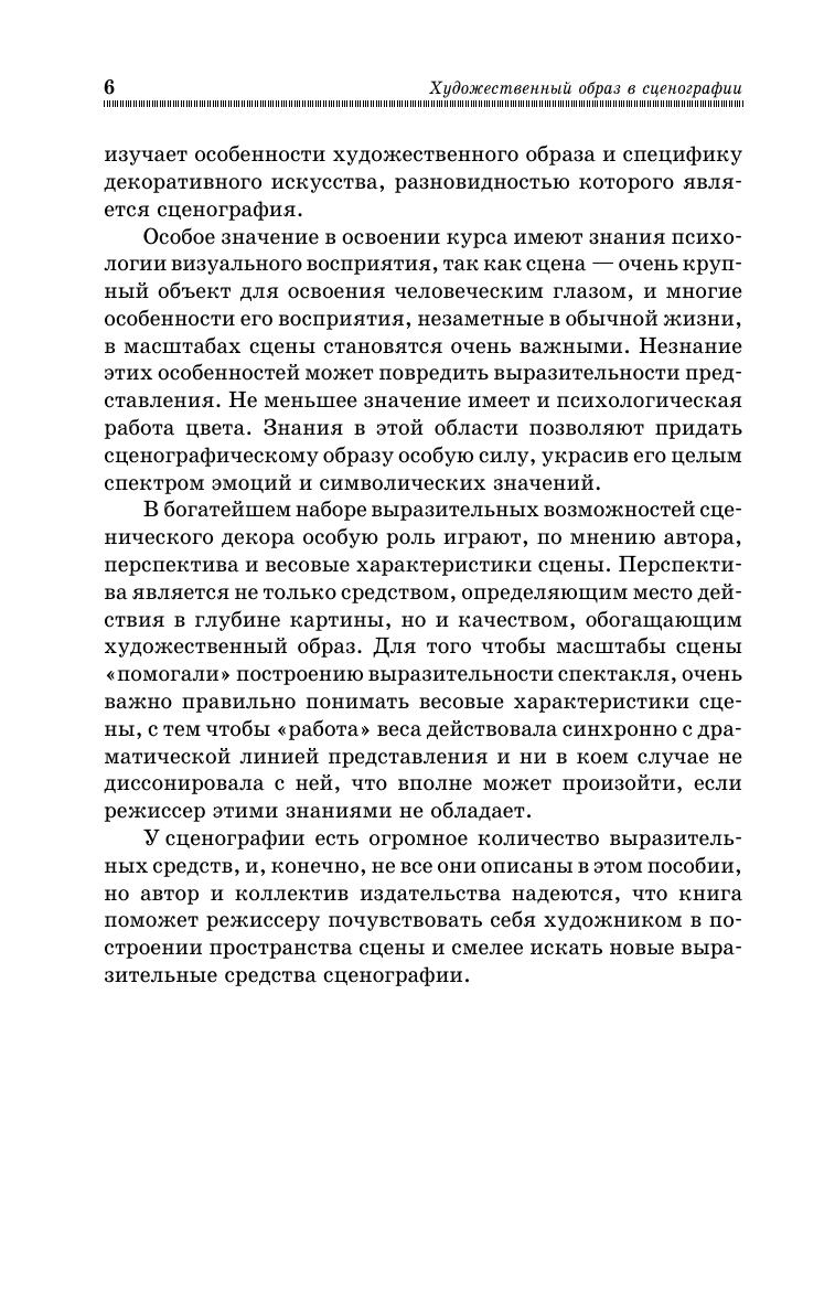 Книга является учебным пособием для студентов, изучающих мастерство режиссуры театрализованных представлений и призвана помочь молодым режиссерам в работе с художником. Она может быть также полезна всем, кто интересуется театром, изобразительным искусством. В ней изложены особенности художественного образа в сценографии и многие его составляющие, основа теории композиции, выразительная работа цвета, весовые характеристики сцены, художественная работа света на сцене и сценический костюм.