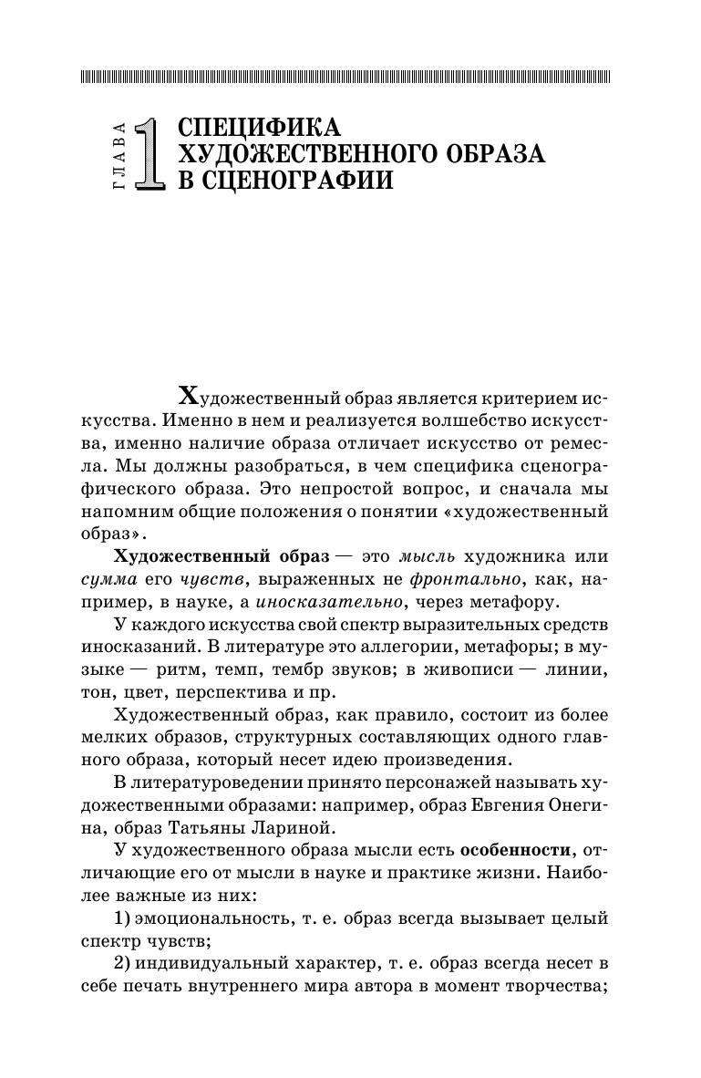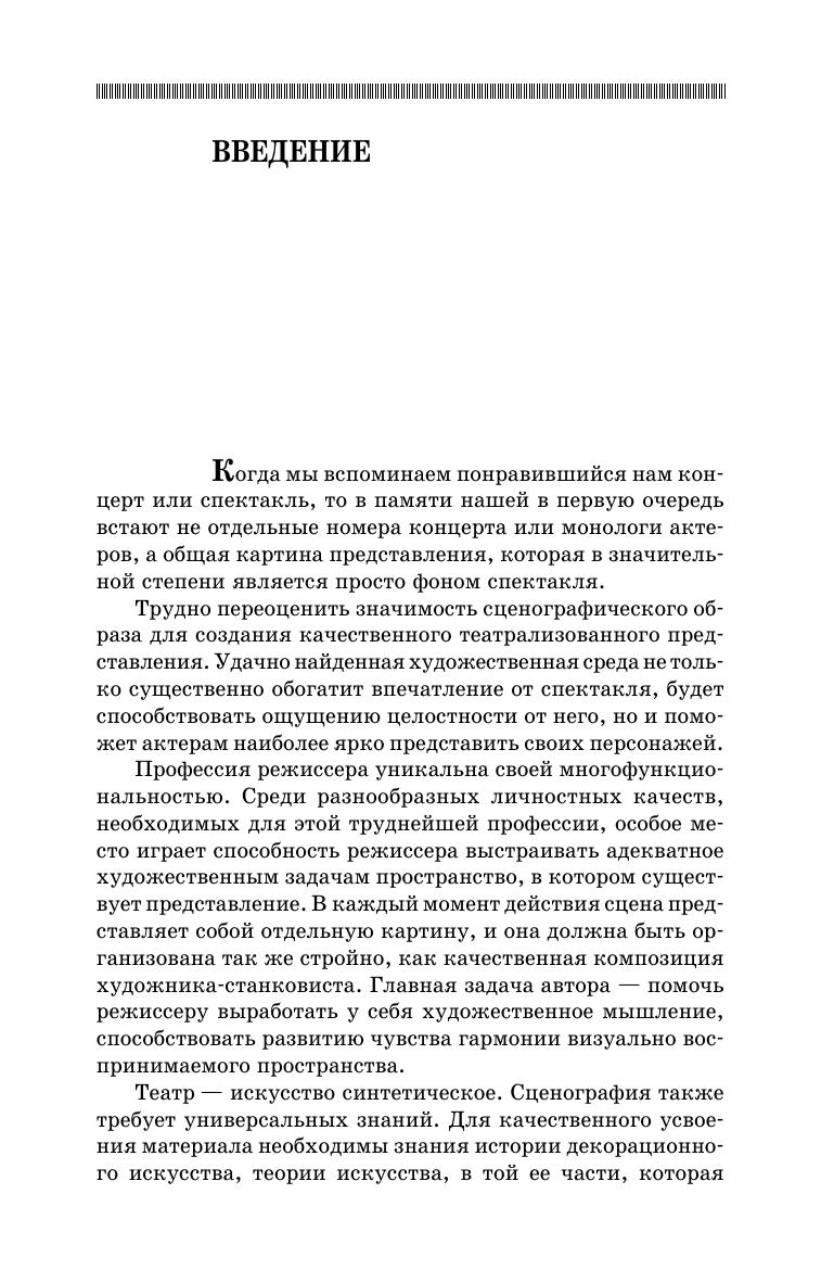 Книга является учебным пособием для студентов, изучающих мастерство театральной режиссуры и режиссуры театрализованных представлений и призвана помочь молодым режиссерам в работе с художником. Она может быть также полезна всем, кто интересуется театром, изобразительным искусством. В ней изложены особенности художественного образа в сценографии и многие его составляющие, основа теории композиции, выразительная работа цвета, весовые характеристики сцены, художественная работа света на сцене и сценический костюм. The book is a study guide for the students, studying the profession of a theatre director and directing of theatrical performances. It is intended for helping young directors in their work with artists. The textbook can also be useful for all, who are interested in theatre and fine art. The book contains the information on the peculiarities of an artistic image in scenography and its components, the basis of the theory of composition, expressive work of colour, weight characteristics of a stage, artistic light work on a stage and stage outfit
