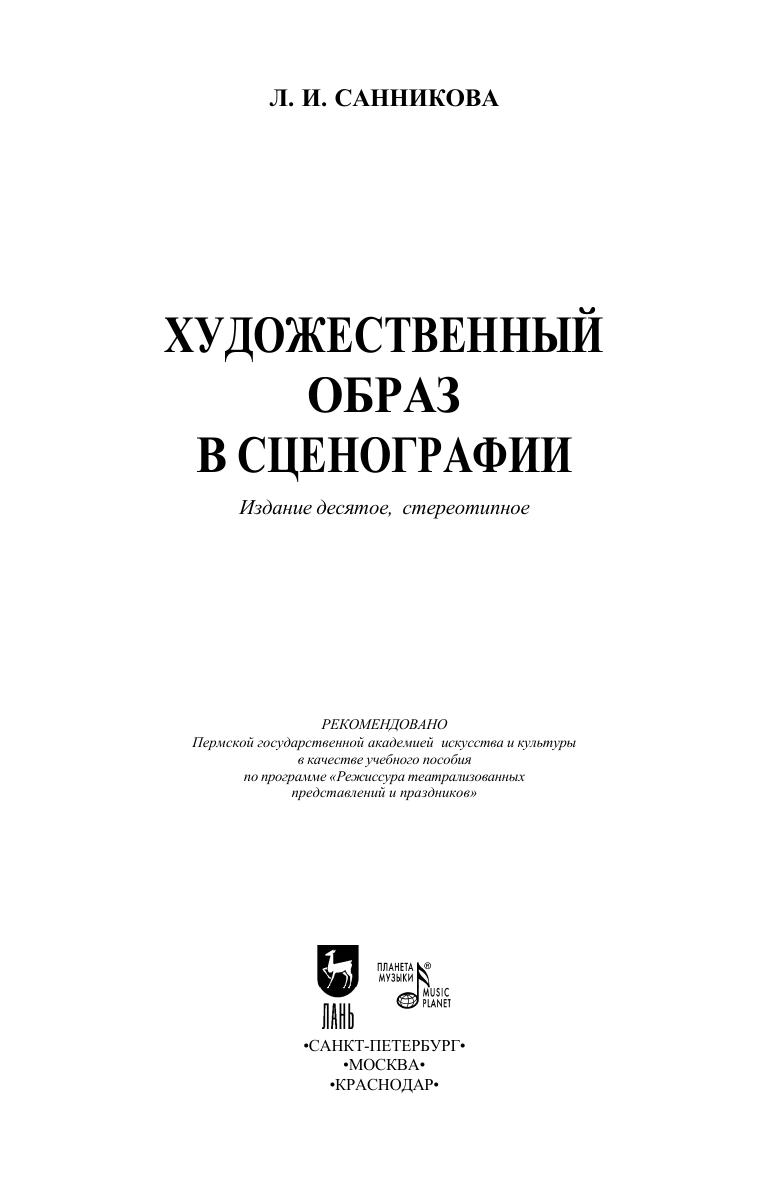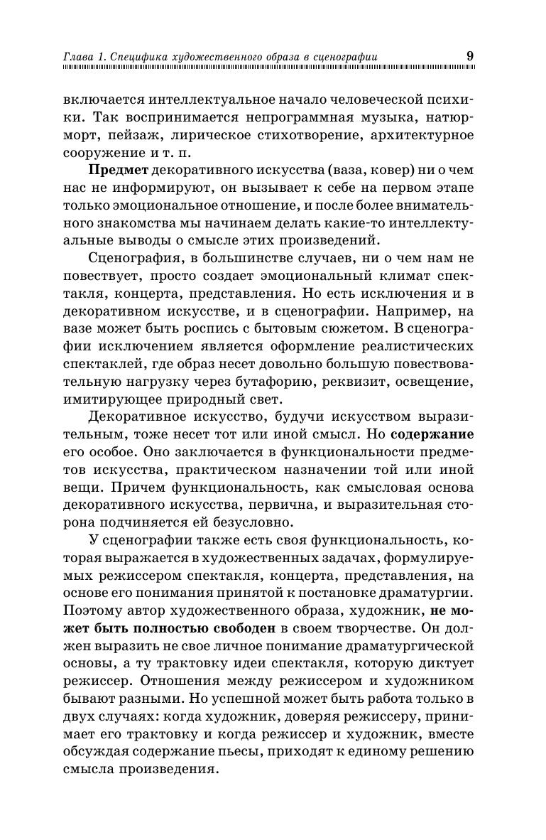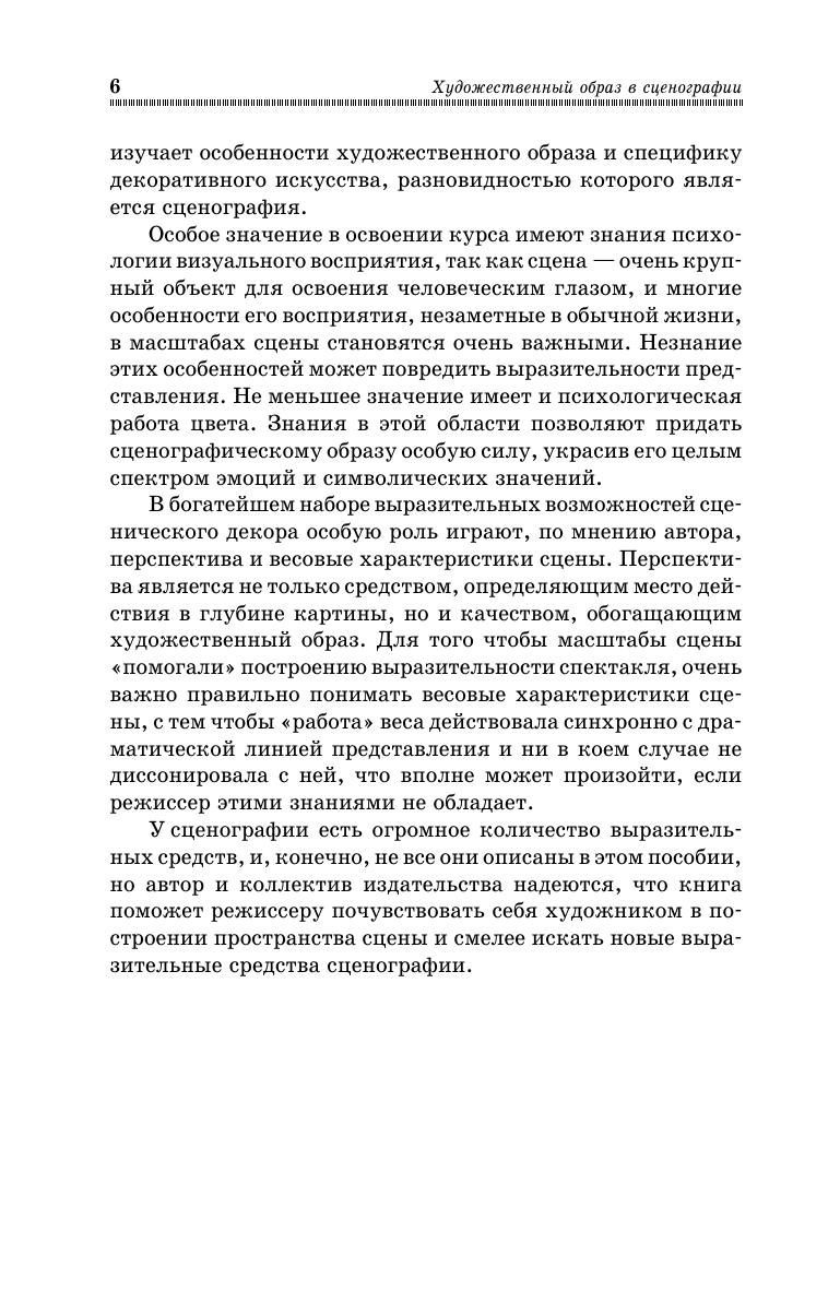 Книга является учебным пособием для студентов, изучающих мастерство театральной режиссуры и режиссуры театрализованных представлений и призвана помочь молодым режиссерам в работе с художником. Она может быть также полезна всем, кто интересуется театром, изобразительным искусством. В ней изложены особенности художественного образа в сценографии и многие его составляющие, основа теории композиции, выразительная работа цвета, весовые характеристики сцены, художественная работа света на сцене и сценический костюм. The book is a study guide for the students, studying the profession of a theatre director and directing of theatrical performances. It is intended for helping young directors in their work with artists. The textbook can also be useful for all, who are interested in theatre and fine art. The book contains the information on the peculiarities of an artistic image in scenography and its components, the basis of the theory of composition, expressive work of colour, weight characteristics of a stage, artistic light work on a stage and stage outfit