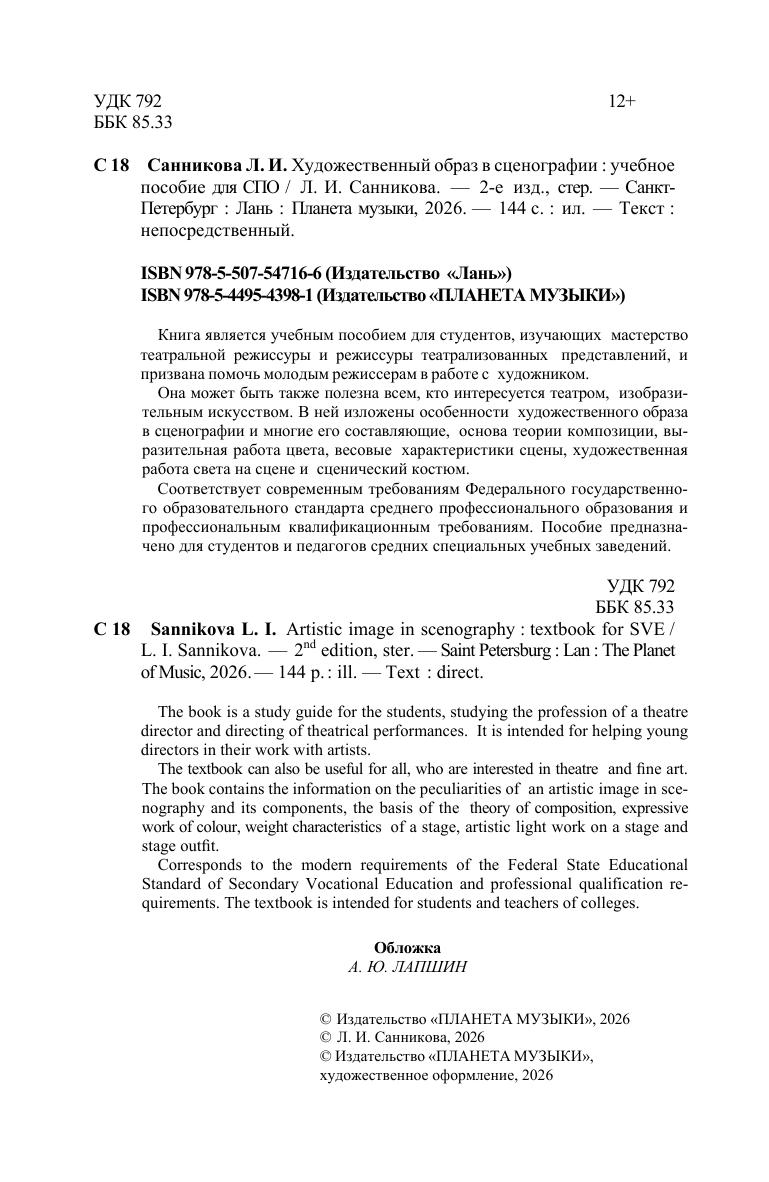 Книга является учебным пособием для студентов, изучающих мастерство режиссуры театрализованных представлений и призвана помочь молодым режиссерам в работе с художником. Она может быть также полезна всем, кто интересуется театром, изобразительным искусством. В ней изложены особенности художественного образа в сценографии и многие его составляющие, основа теории композиции, выразительная работа цвета, весовые характеристики сцены, художественная работа света на сцене и сценический костюм. Пособие предназначено для студентов и педагогов средних специальных учебных заведений. The book is a study guide for the students, studying the profession of directing of theatrical performances. It is intended for helping young directors in their work with artists. The textbook can also be useful for all, who are interested in theatre and fine art. The book contains the information on the peculiarities of an artistic image in scenography and its components, the basis of the theory of composition, expressive work of colour, weight characteristics of a stage, artistic light work on a stage and stage outfit The manual is designed for students and teachers of colleges.