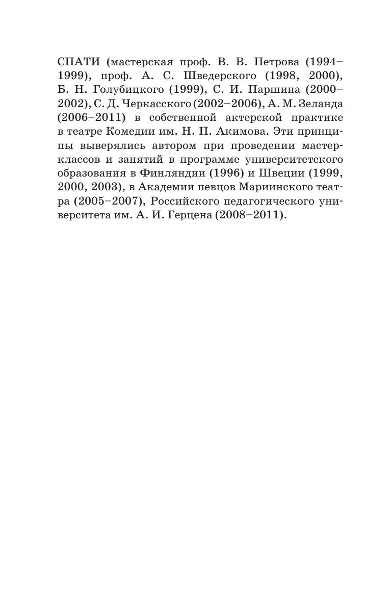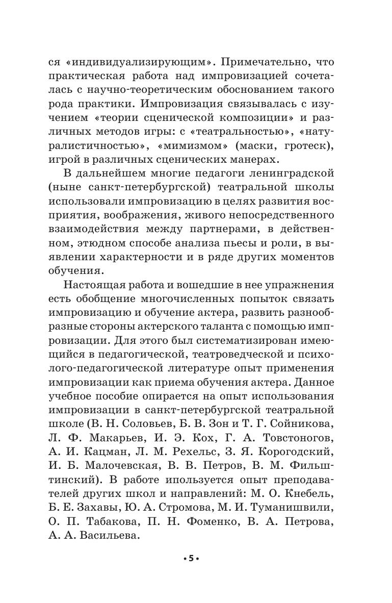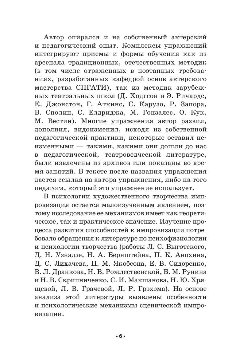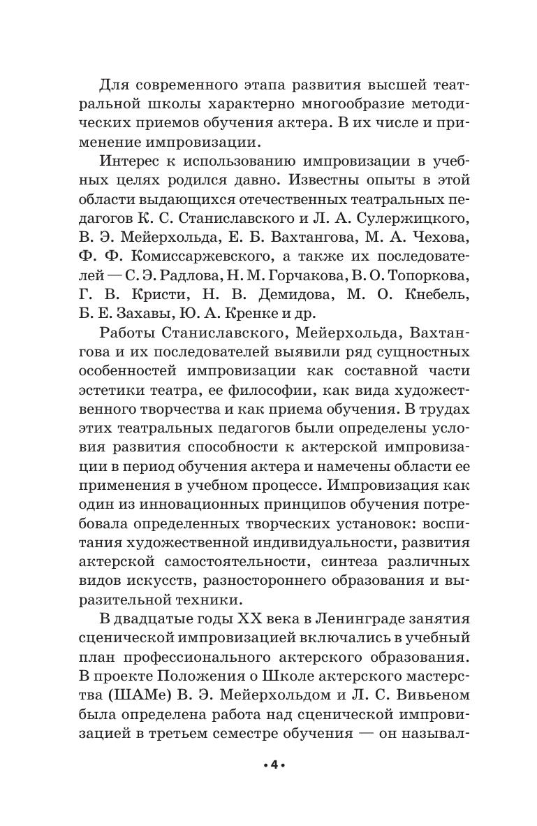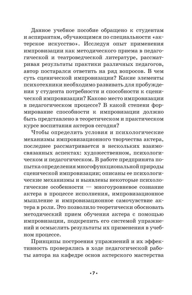 Данное учебное пособие обосновывает возможность широкого включения импровизации в программу обучения актера. Импровизационное творчество актера рассматривается в нескольких взаимосвязанных аспектах: художественном, психологическом и педагогическом. Комплексы упражнений интегрируют приемы и формы обучения как из арсенала традиционных, оте чественных, так и из методик зарубежных театральных школ, актерскую и педагогическую практику самого автора. Пособие адресовано студентам и аспирантам по специальности «Актерское искусство».