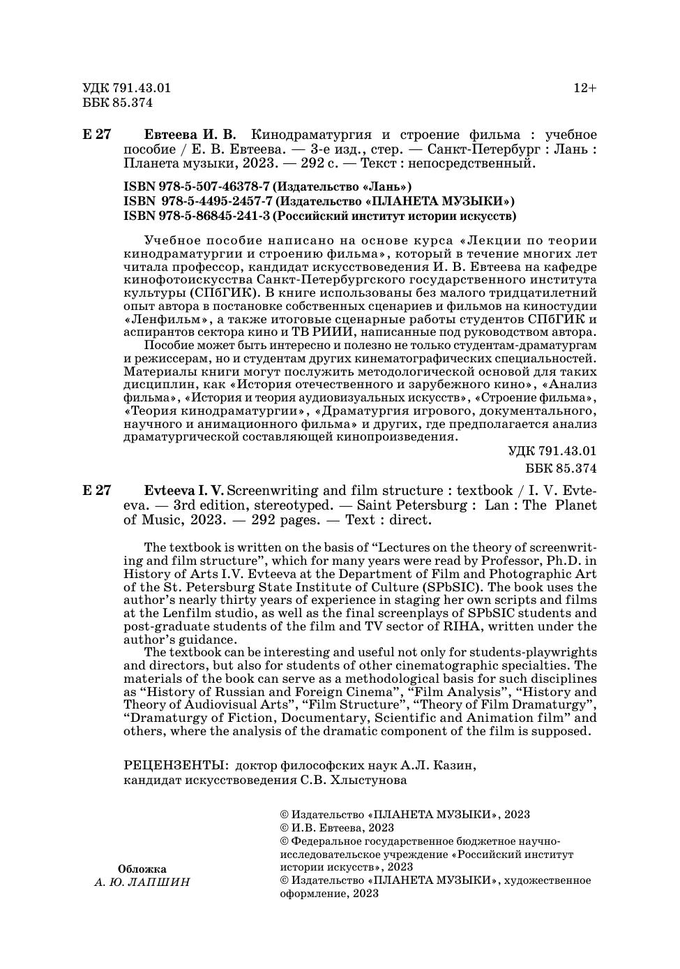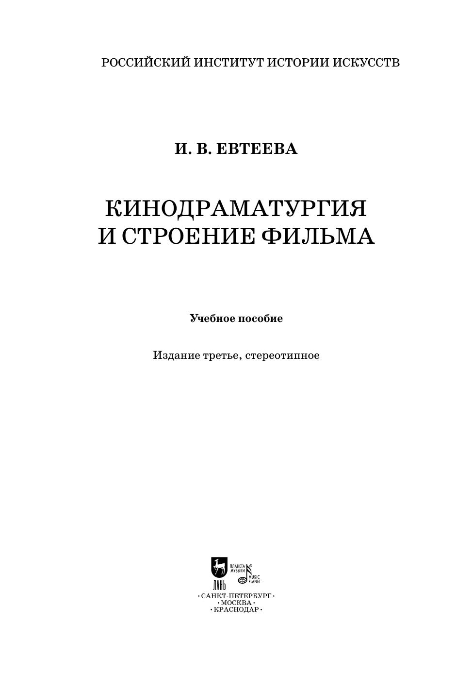 Учебное пособие написано на основе курса «Лекции по теории кинодраматургии и строению фильма», который в течение многих лет читала профессор, кандидат искусствоведения И. В. Евтеева на кафедре кино- фотоискусства Санкт-Петербургского государственного института культуры (СПбГИК). В книге использованы без малого тридцатилетний опыт автора в постановке собственных сценариев и фильмов на киностудии «Ленфильм», а также итоговые сценарные работы студентов СПбГИК и аспирантов сектора кино и
