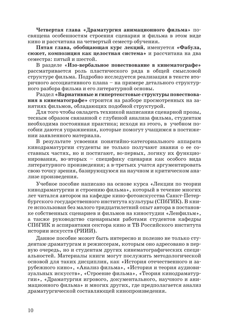 Данное пособие может быть интересно и полезно не только студентам-драматургам и режиссерам, которым оно адресовано в первую очередь, но и студентам других кинематографических специальностей. Материалы книги могут послужить методологической основой для таких дисциплин, как «История отечественного и зарубежного кино», «Анализ фильма», «История и теория аудиовизуальных искусств», «Строение фильма», «Теория кинодраматургии», «Драматургия игрового, документального, научного и анимационного фильма» и многих других, где предполагается анализ драматургической составляющей кинопроизведения.
