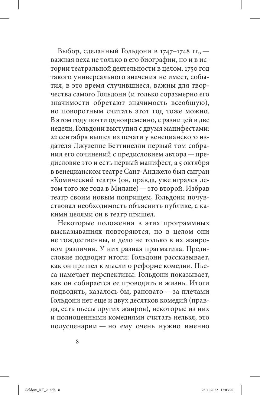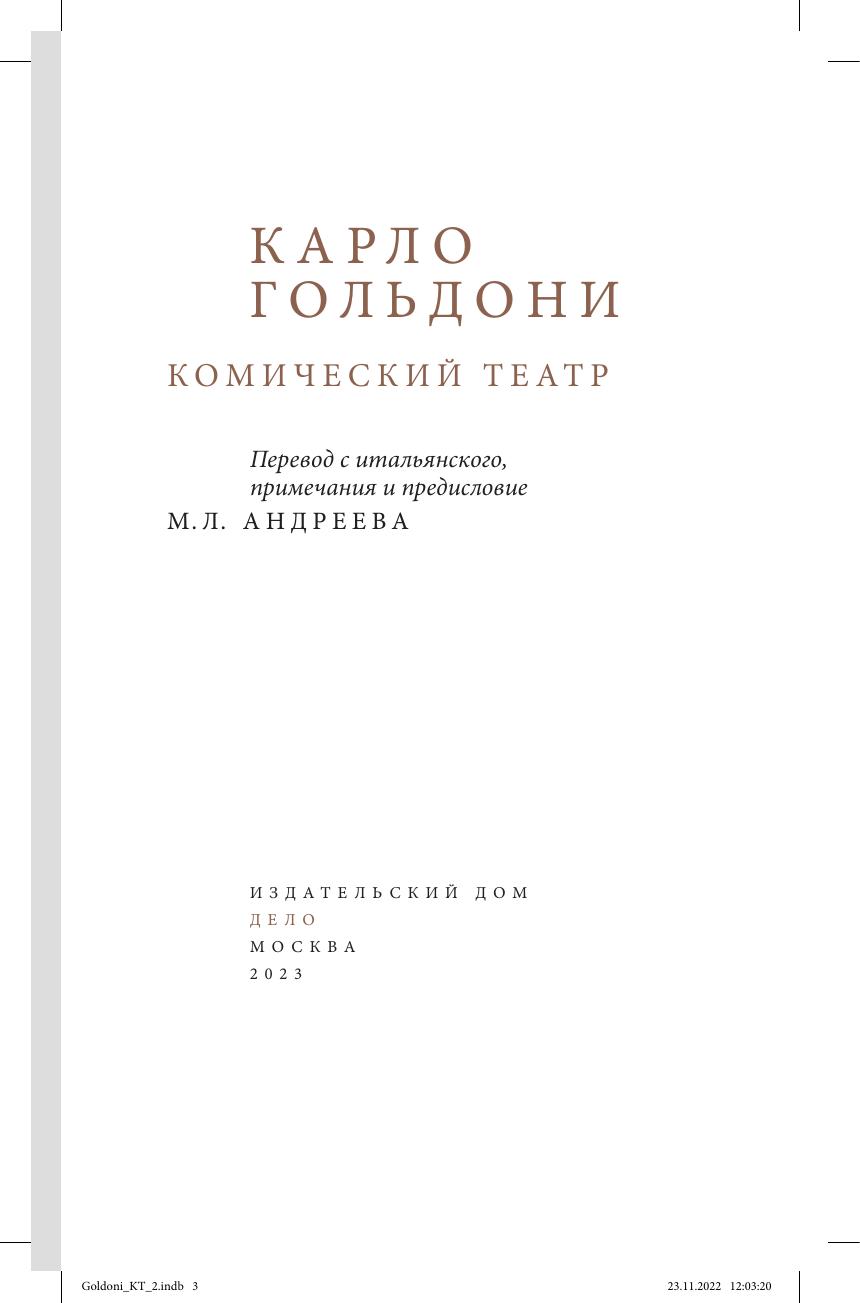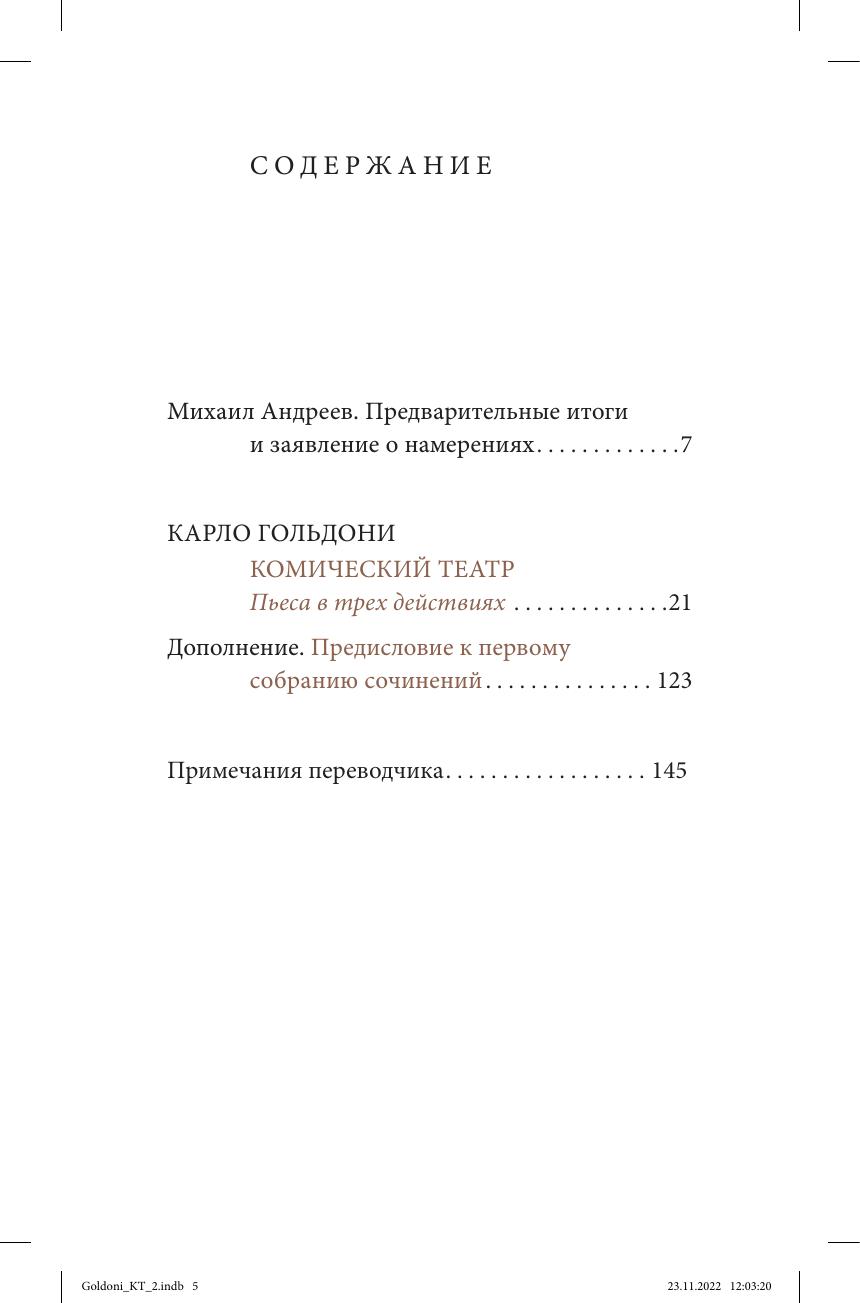 Комический театр» (1750) — драматургический манифест Карло Гольдони, вынесенный непосредственно на театральные подмостки. Это не только самое первое по времени, но и самое полное по содержанию исповедание веры великого театрально-го реформатора: Гольдони неоднократно выступал с программными высказываниями, но здесь они собраны в едином тексте. Цели, которые он преследовал, осуществляя реформу комедии, принципы, положенные им в основу новой поэтики, — все это излагается в ходе репетиции, с представлением труппы, с красочными профессиональными и бытовыми деталями. В качестве дополнения публикуется предисловие Гольдони к первому собранию его пьес, где рассказывается, как он пришел к идее реформы.